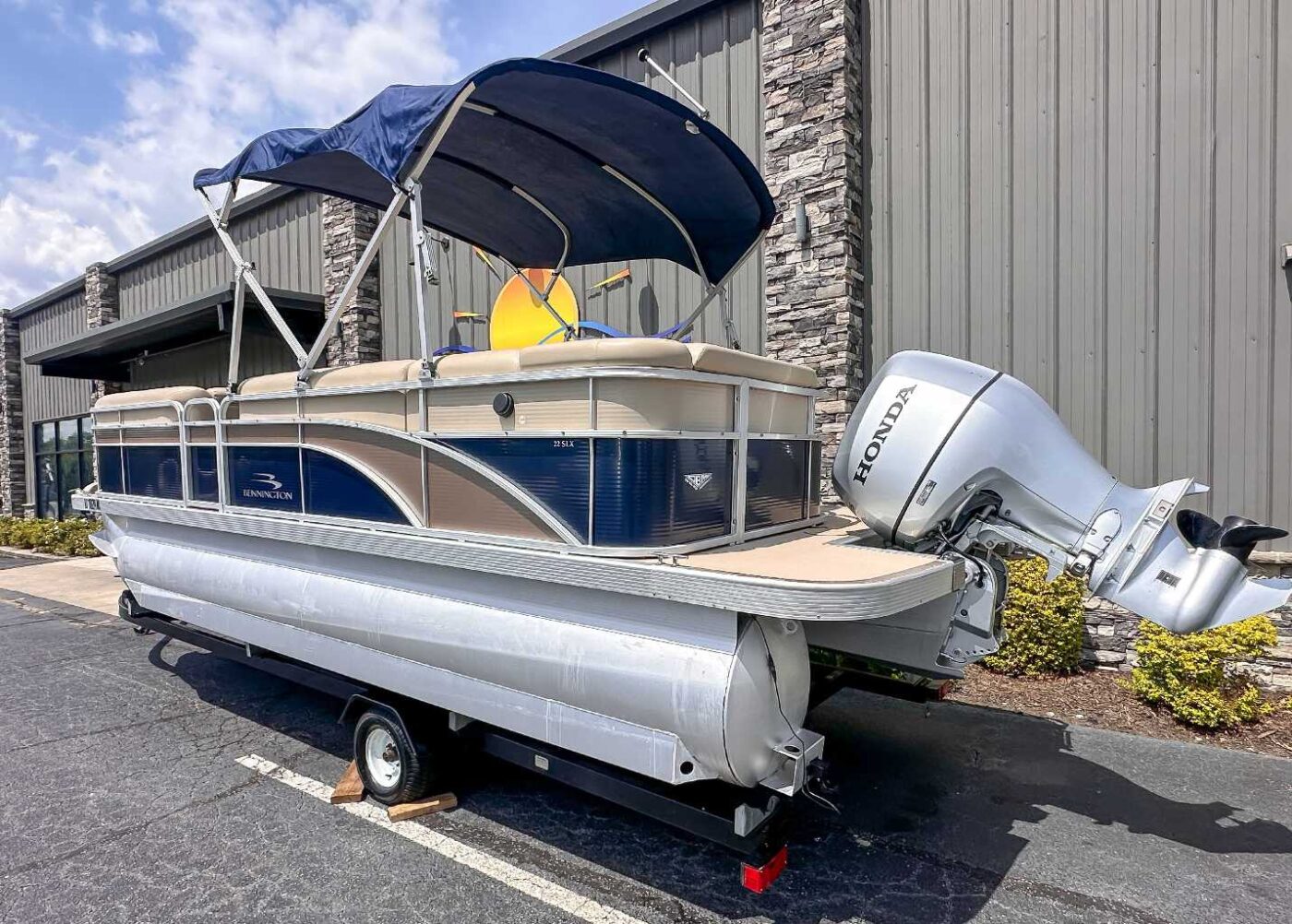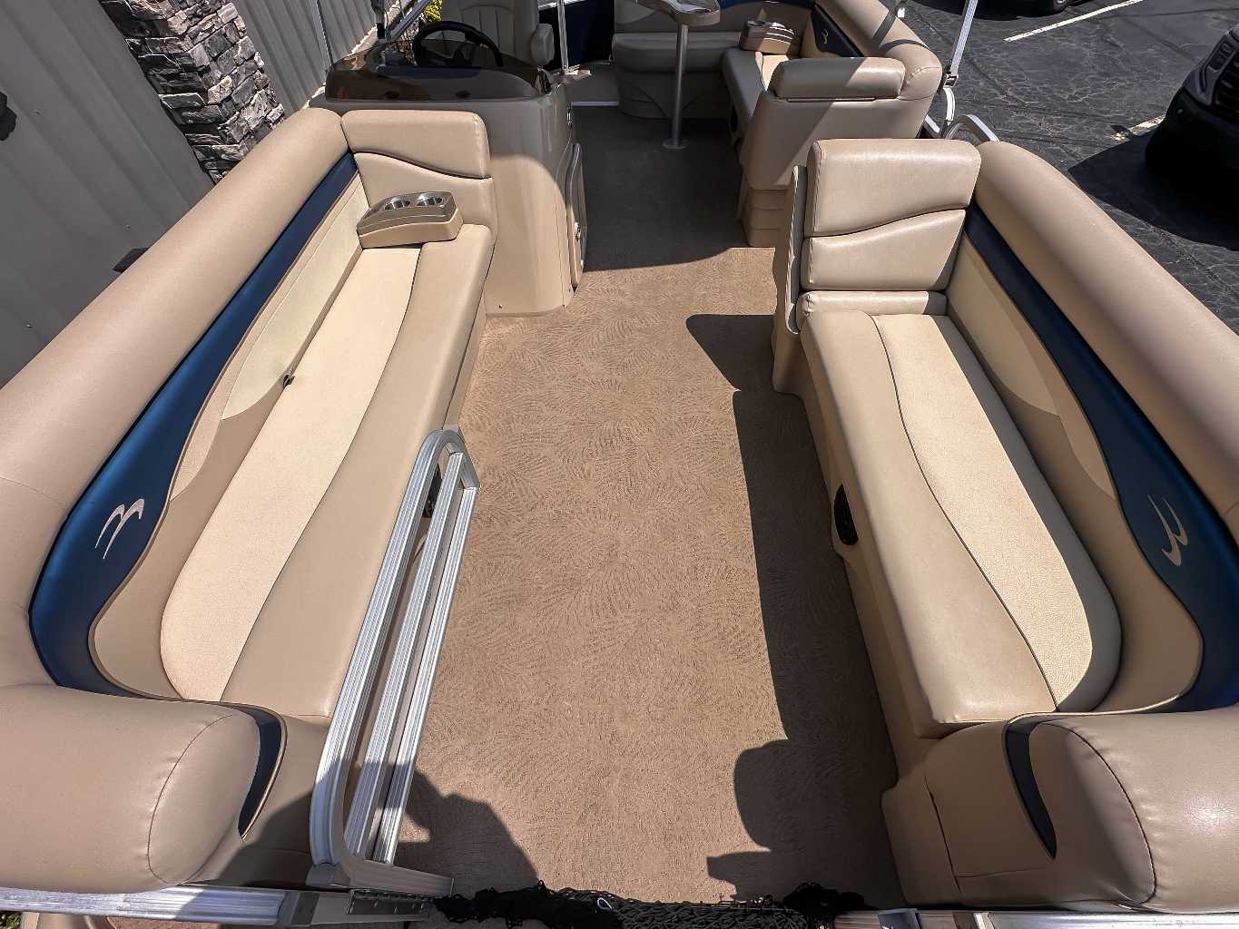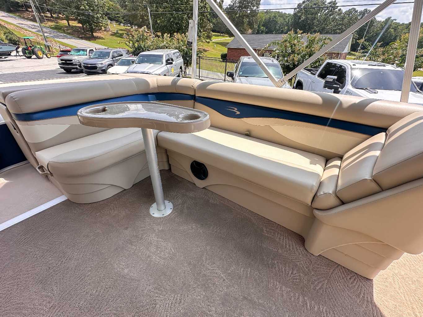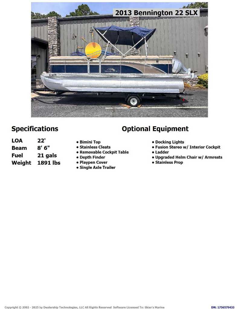 The 2013 Bennington 22 SLX is a 22-foot pontoon boat known for its versatile and spacious layout, quality construction, and smooth ride. Ideal for day-cruising, fishing, and watersports, it features plush seating with durable Icon Soft-Touch Upholstery Vinyl, a 10-foot bimini top, and a cockpit table. The S-series model often includes a comfortable L-shaped lounge, upgraded helm chair, and ample storage, providing a blend of comfort and performance for family fun on the water.