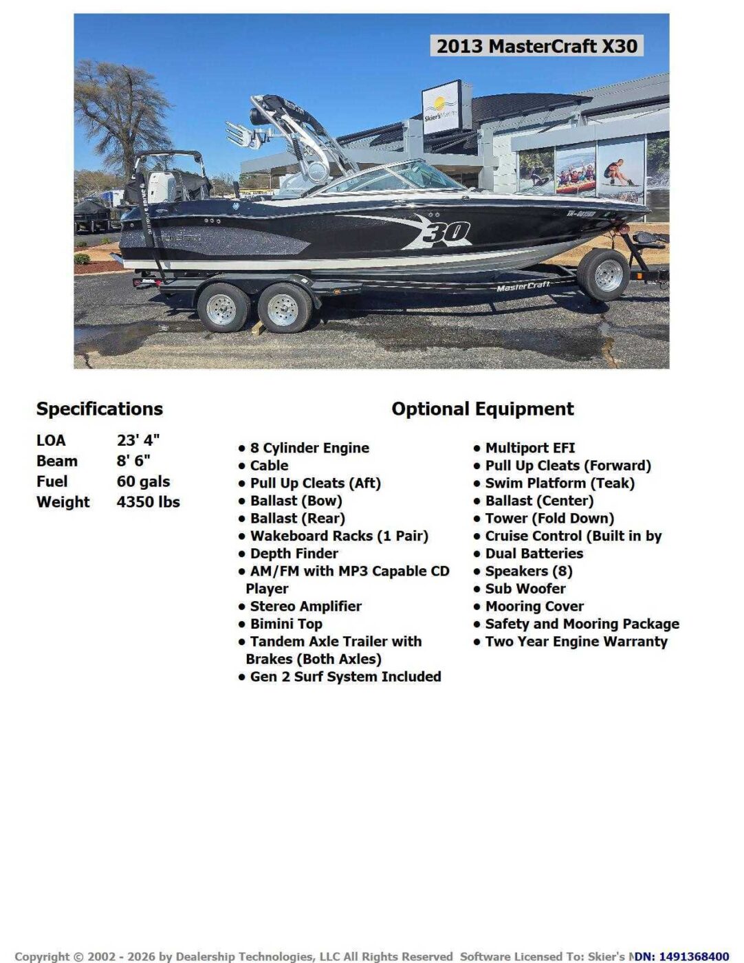 The 2013 MasterCraft X30 is a premier "do-it-all" crossover that perfectly balances high-end luxury with athletic performance. It is a standout choice because it introduced the Gen 2 Surf System, offering one of the most customizable and consistent waves of its era, while its 23-foot hull and deep-V entry allow it to handle rough water much better than smaller towboats. With a massive 16-person capacity, high-quality Ilmor powerplants, and an upscale interior that has aged remarkably well, it remains a top