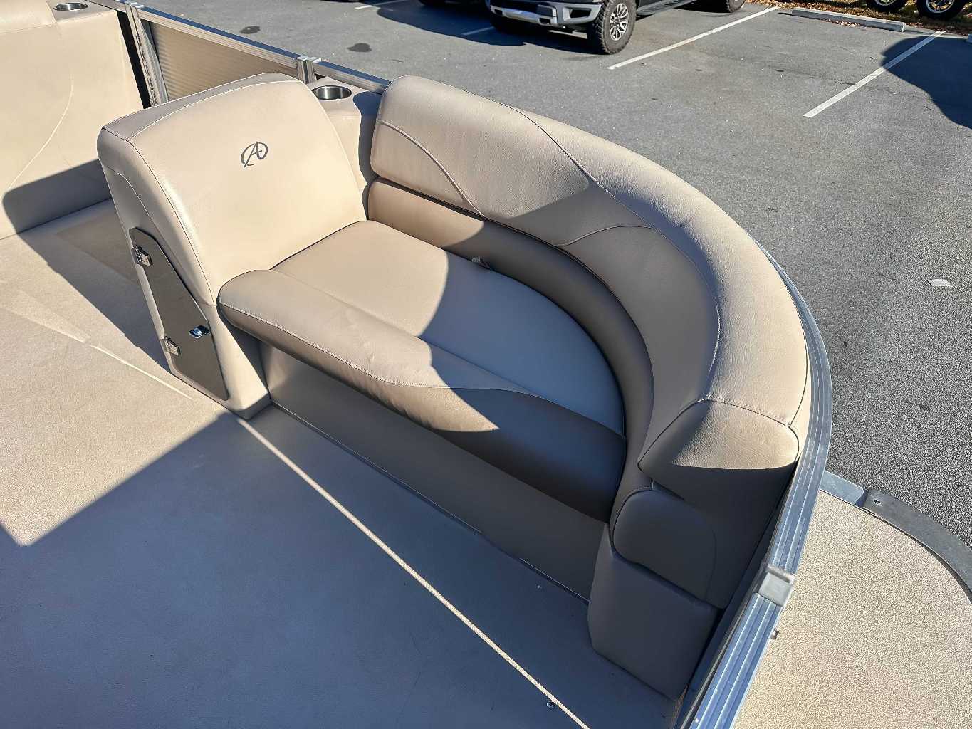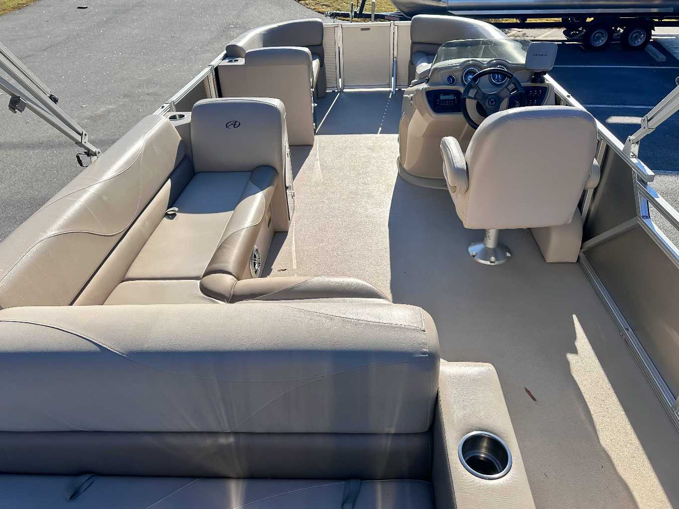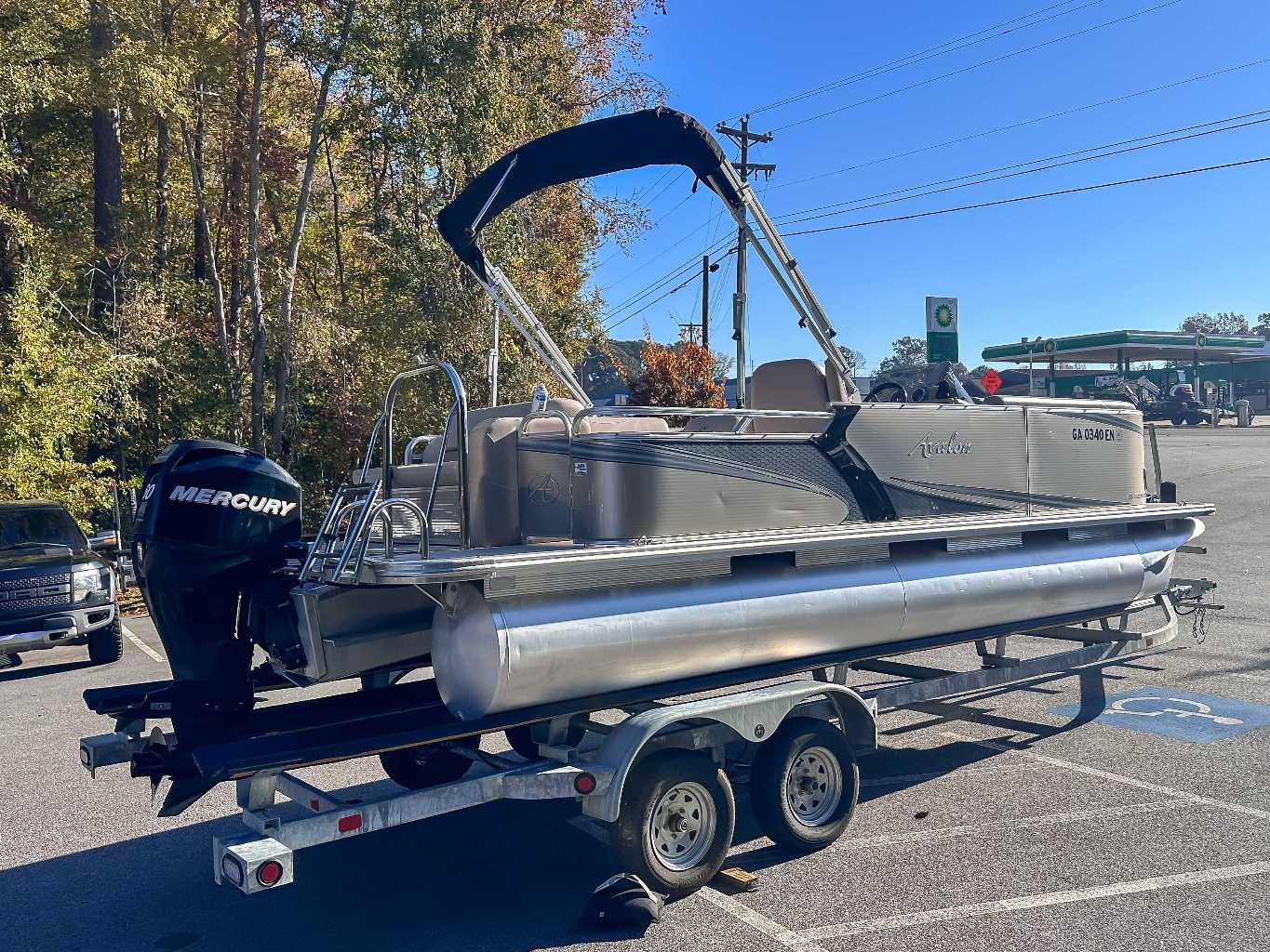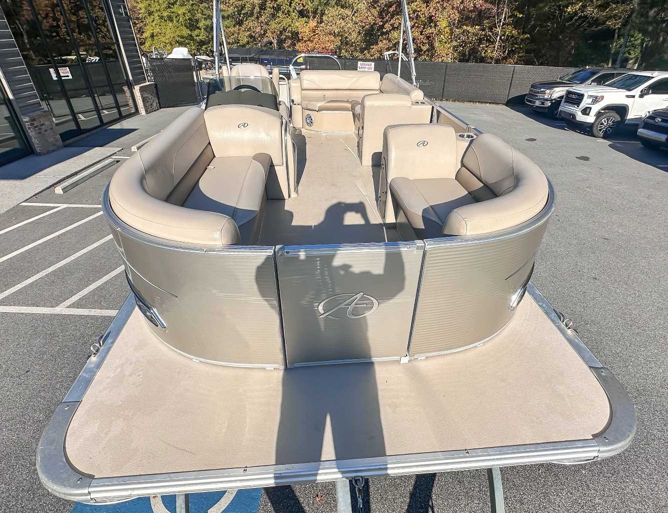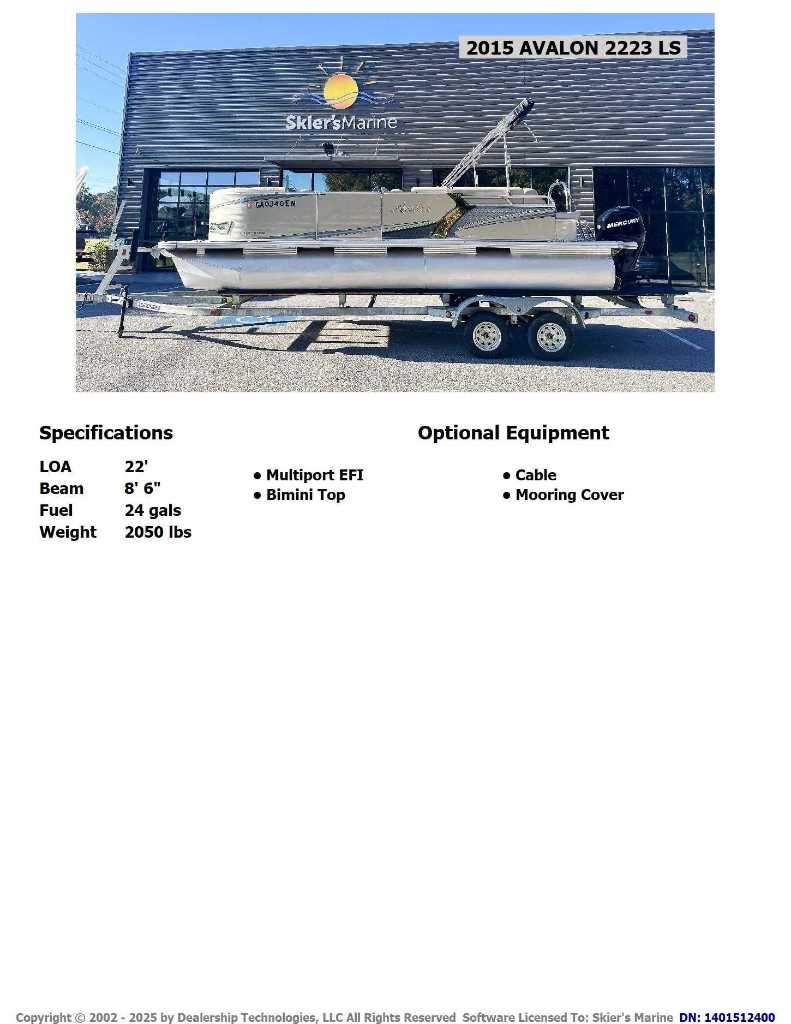 The 2015 Avalon 2223 LS is a 22-foot pontoon boat known for providing affordable luxury and a rigid, durable structure. It features a practical, compact 8-foot wide design with Deco 4 external multi-panel walls and comfortable Matrix 50 soft-touch vinyl seating on lifetime aluminum frames. The helmstand includes a Millennium stereo with speakers, tach, volt, and fuel gauges, a windshield, and a black soft-grip steering wheel. This model is trailerable and offers various interior layouts, including fishing