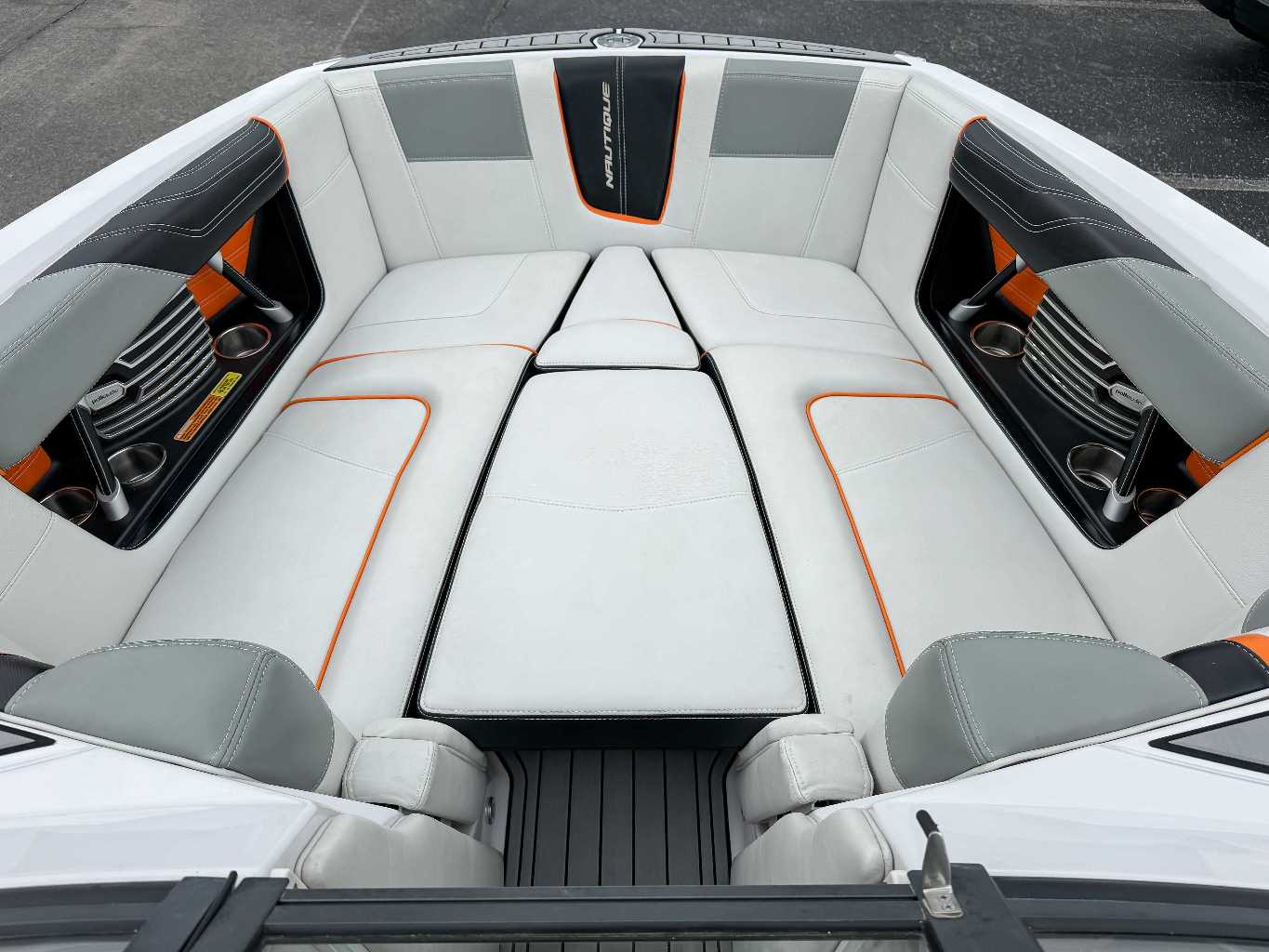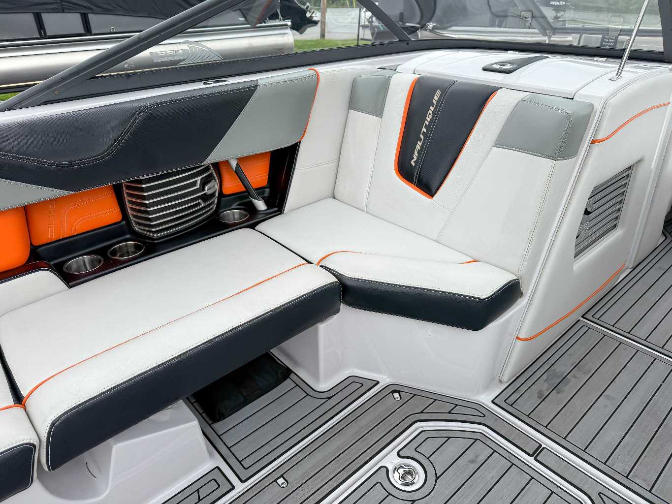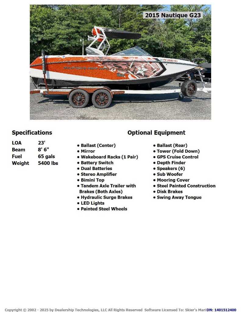The 2015 Nautique G23 is a 23-foot flagship wakeboard and wakesurf boat renowned for its powerful performance and massive, customizable waves. Key features include the Nautique Surf System (NSS) with Waveplate technology and an integrated sub-floor ballast system (2,850 lbs) for effortless wake shaping. It offers a spacious, premium interior with seating for 16, a LINC touchscreen helm control center, and an upgraded JL audio system, making it a luxurious and high-performing option for watersports enthusia