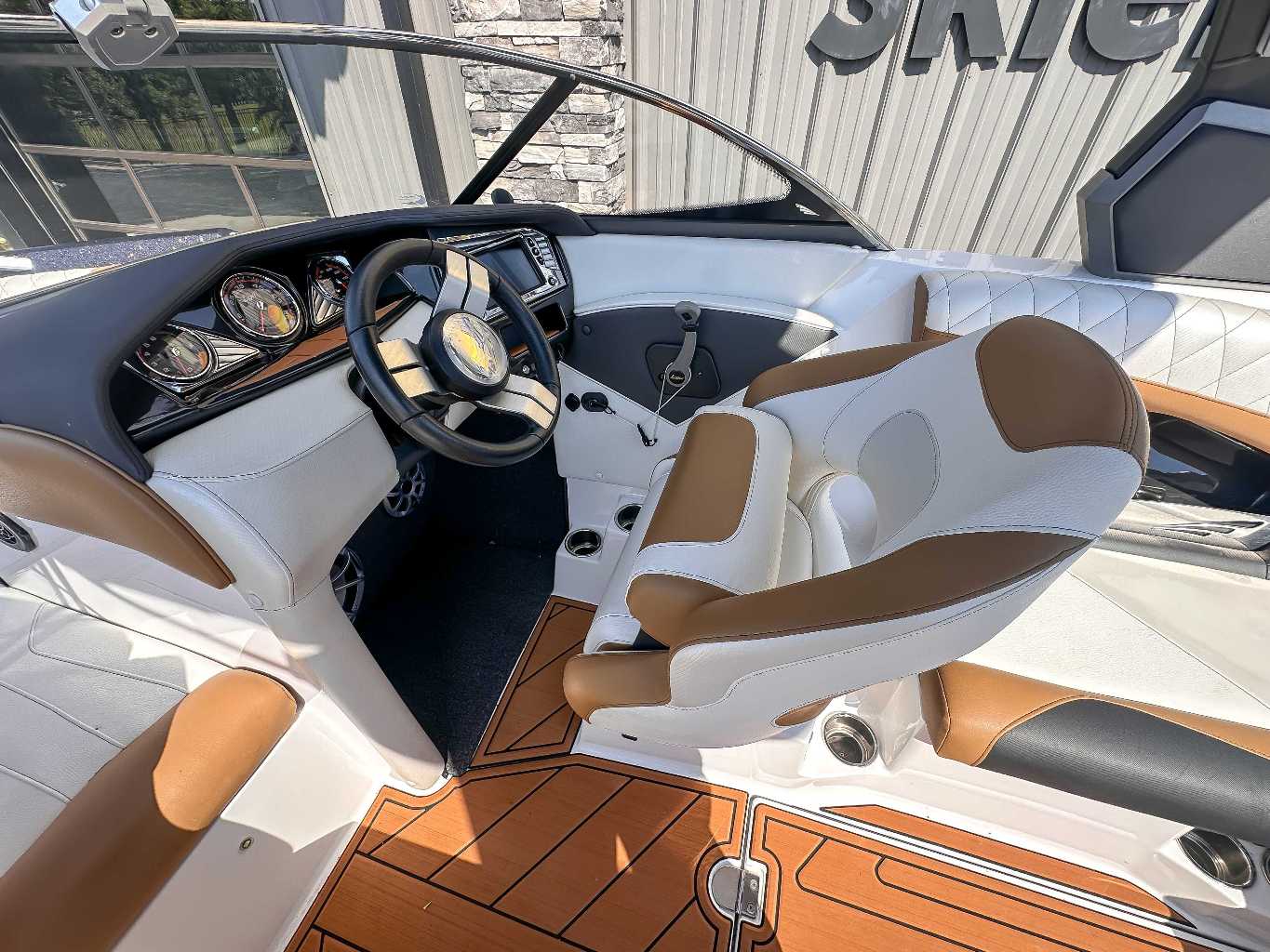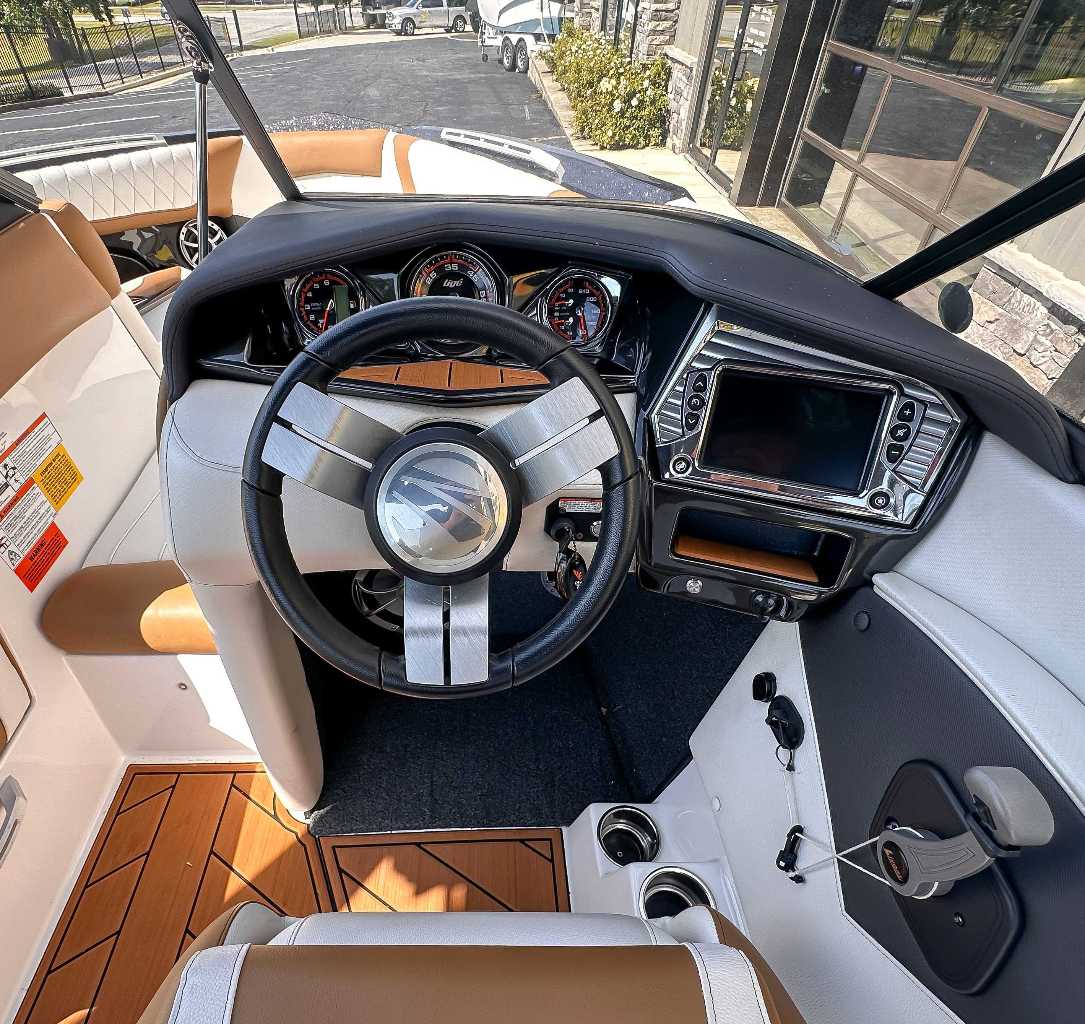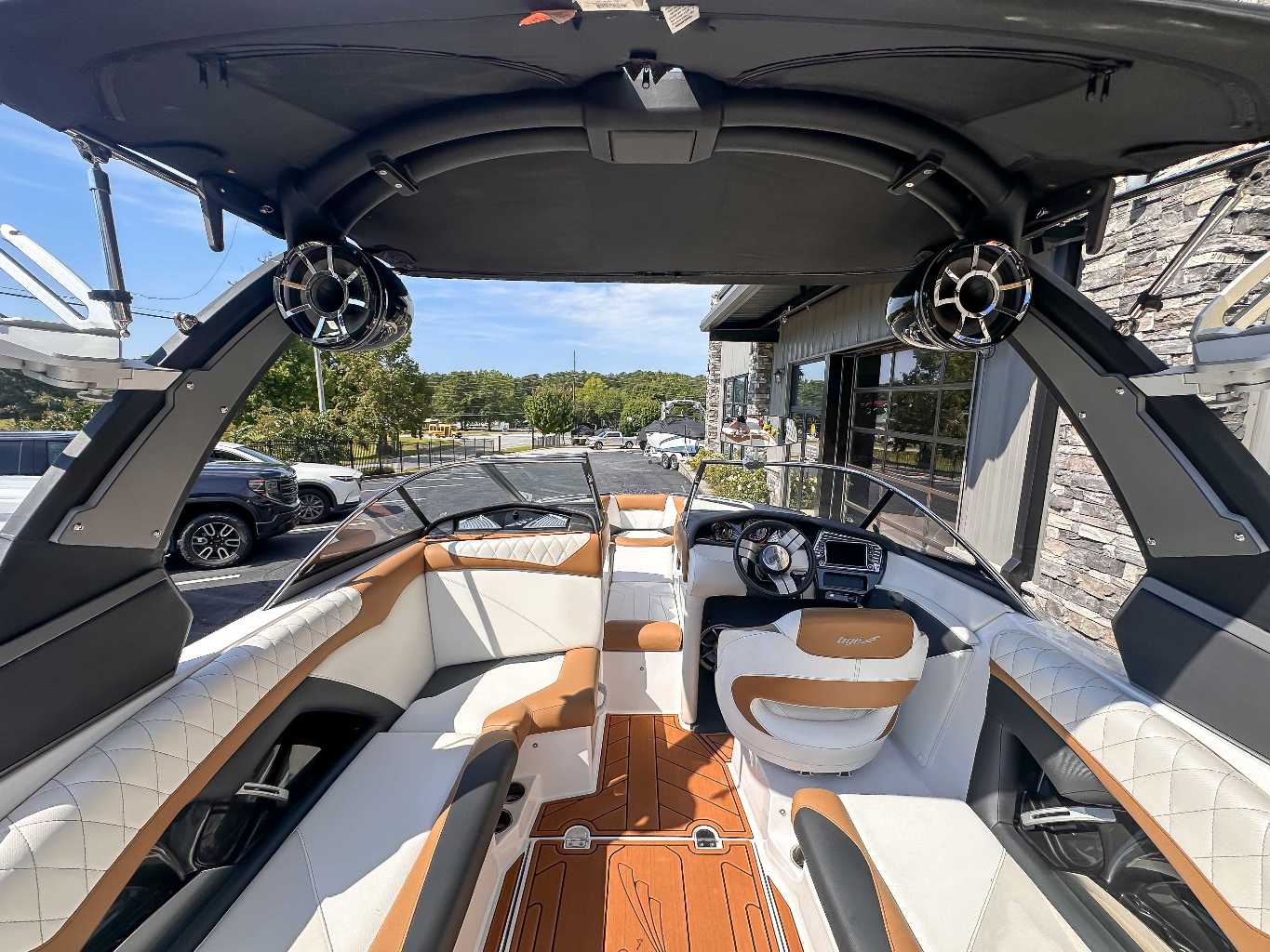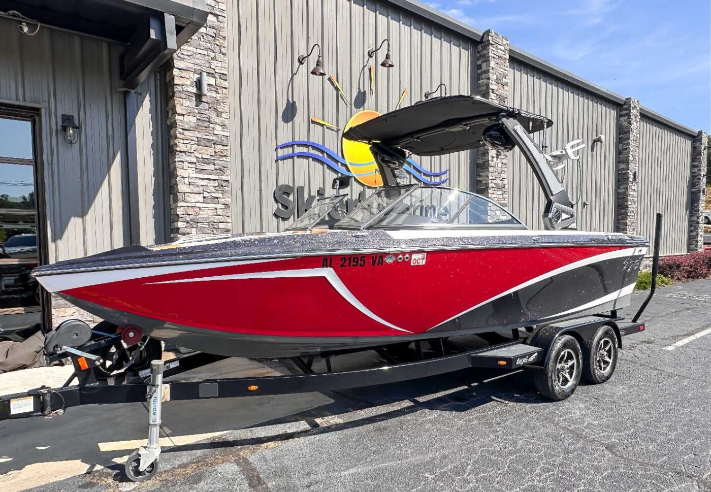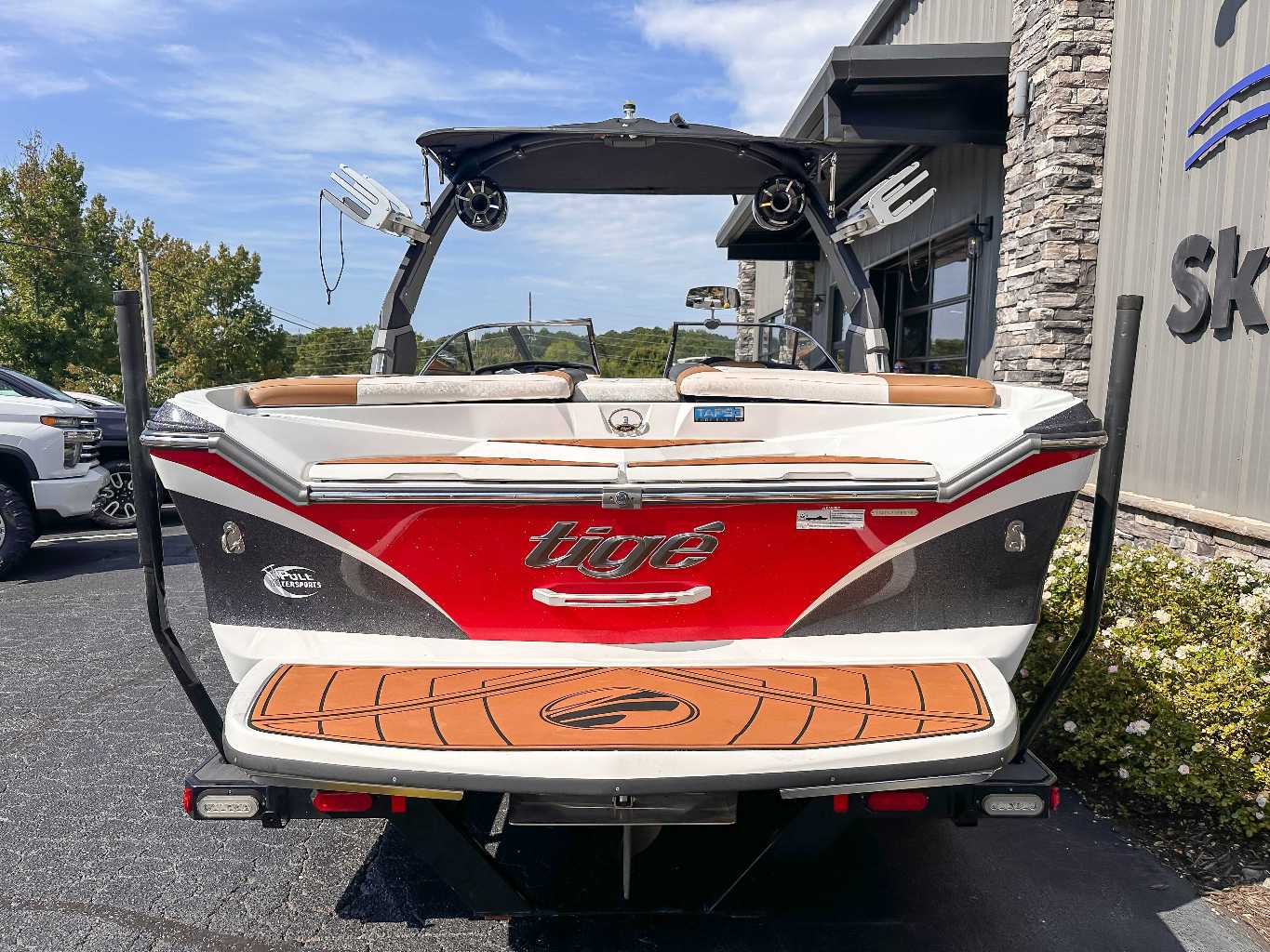 The 2017 Tige Z1 is a versatile 21.5-foot (6.5-meter) towboat known for packing performance into a compact size. Powered by the Indmar Raptor series engine, it utilizes the Convex V hull and TAPS 3 Surf System to produce customizable wakes and "ocean-worthy" surf waves, making it ideal for a range of water sports from wakeboarding to slalom skiing. The Z1 offers a spacious interior with seating for up to 14 people and advanced features such as a touchscreen control system and an optional Alpha Z or E2 powe