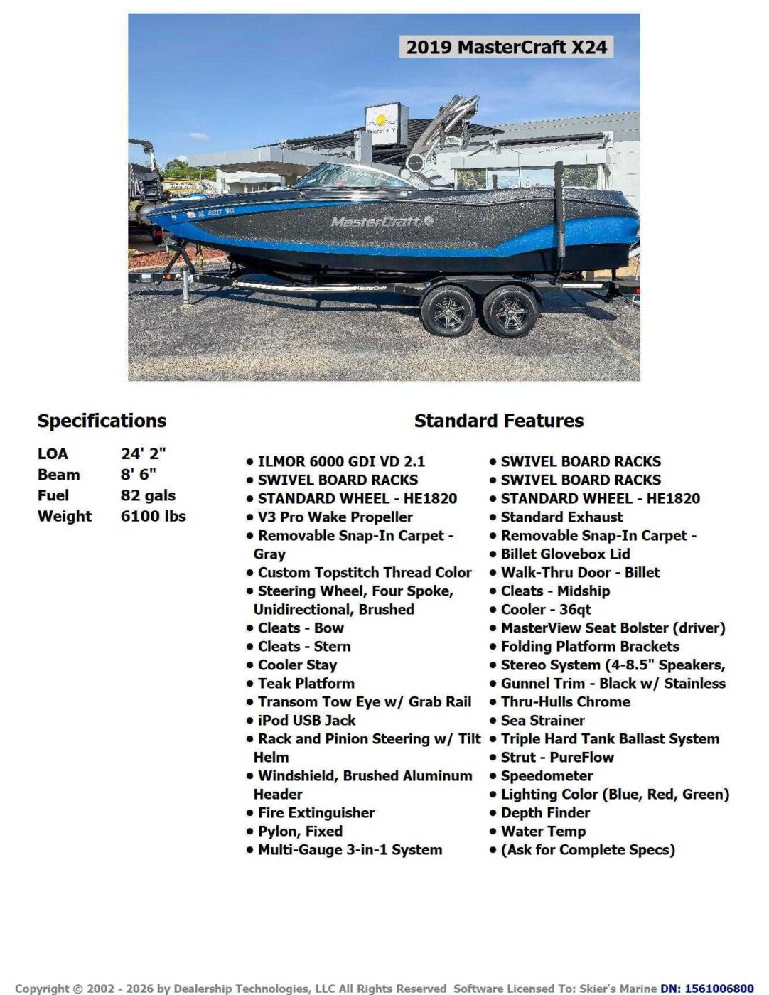 The 2019 MasterCraft X24 is an exceptional purchase for those seeking a top-tier, luxury wakesurf experience, as it was designed from the hull up to produce one of the largest and most customizable surf waves in the industry using the Gen 2 Surf System and massive 4,300 lbs. of ballast. This 24-foot powerhouse features the FastFill ballast system for quick setup, allowing you to spend more time riding and less time waiting. With premium features such as a 6.2L Ilmor engine, 18-passenger capacity, a user-fr