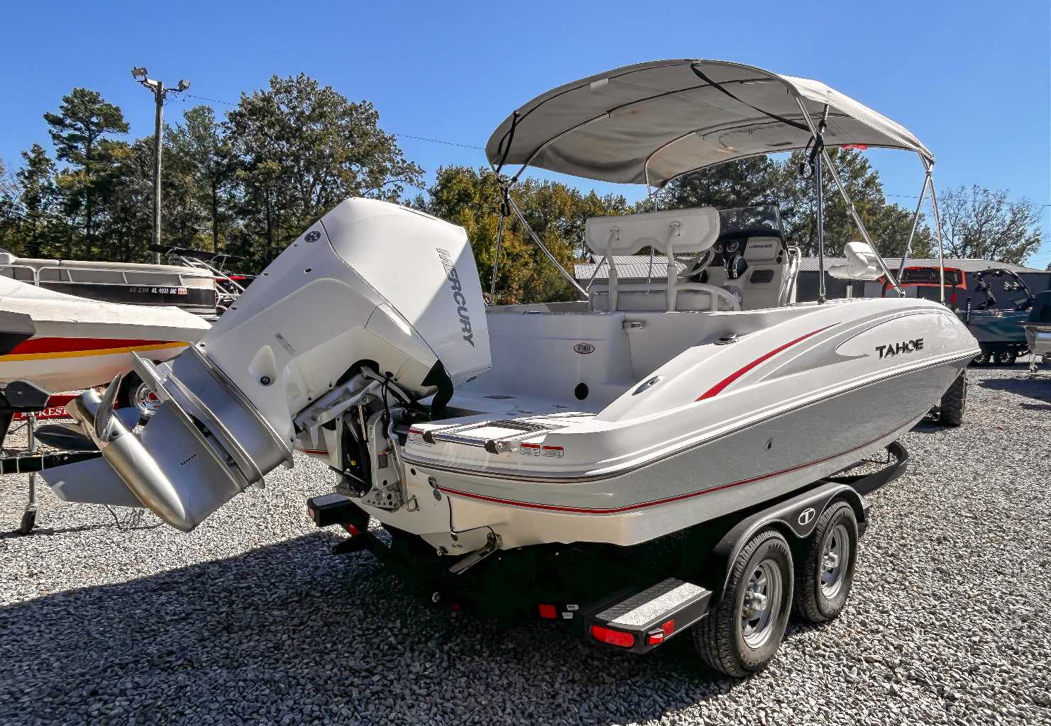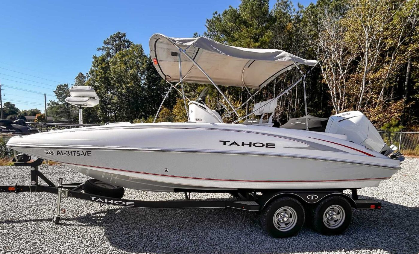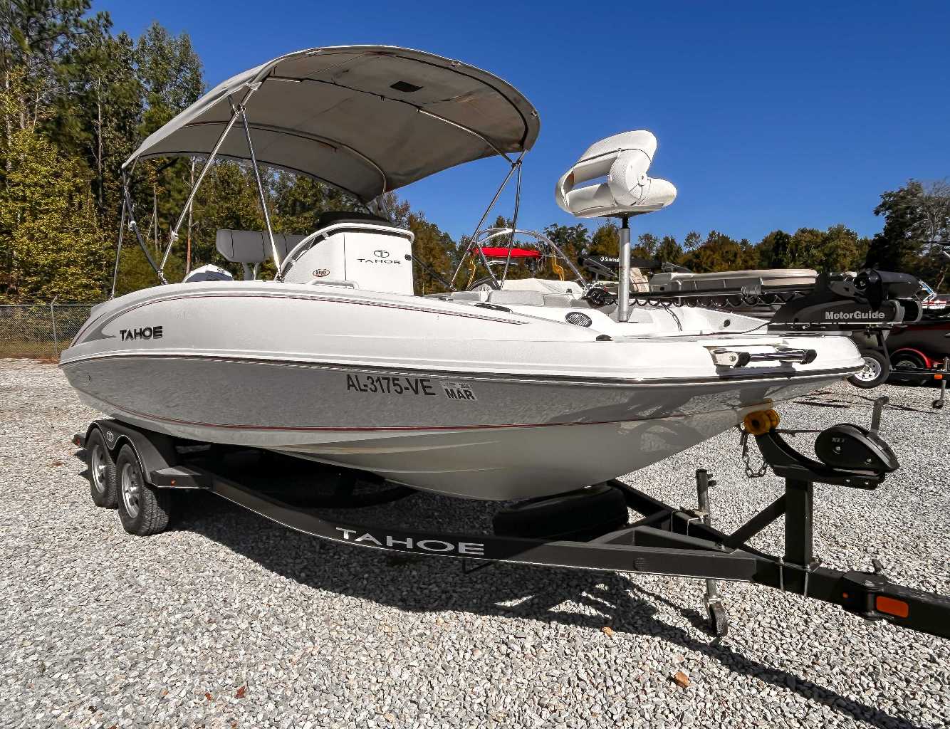 The 2020 Tahoe 2150 is a versatile 21' 1" deck boat designed for all-around family fun, from fishing to watersports and cruising. It features a wide-open layout with ample seating for up to 11 people, a Powerglide hull for performance, and extensive storage throughout. Key features include twin swim platforms with boarding ladders, an in-floor ski/wakeboard compartment, an aerated livewell, and a Kicker stereo system. It can be optioned with a fishing package and is rated for up to 225 HP outboards.