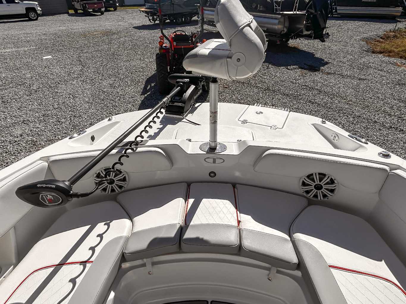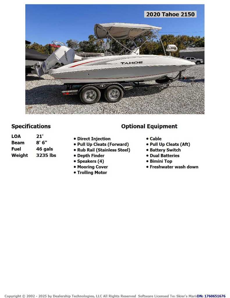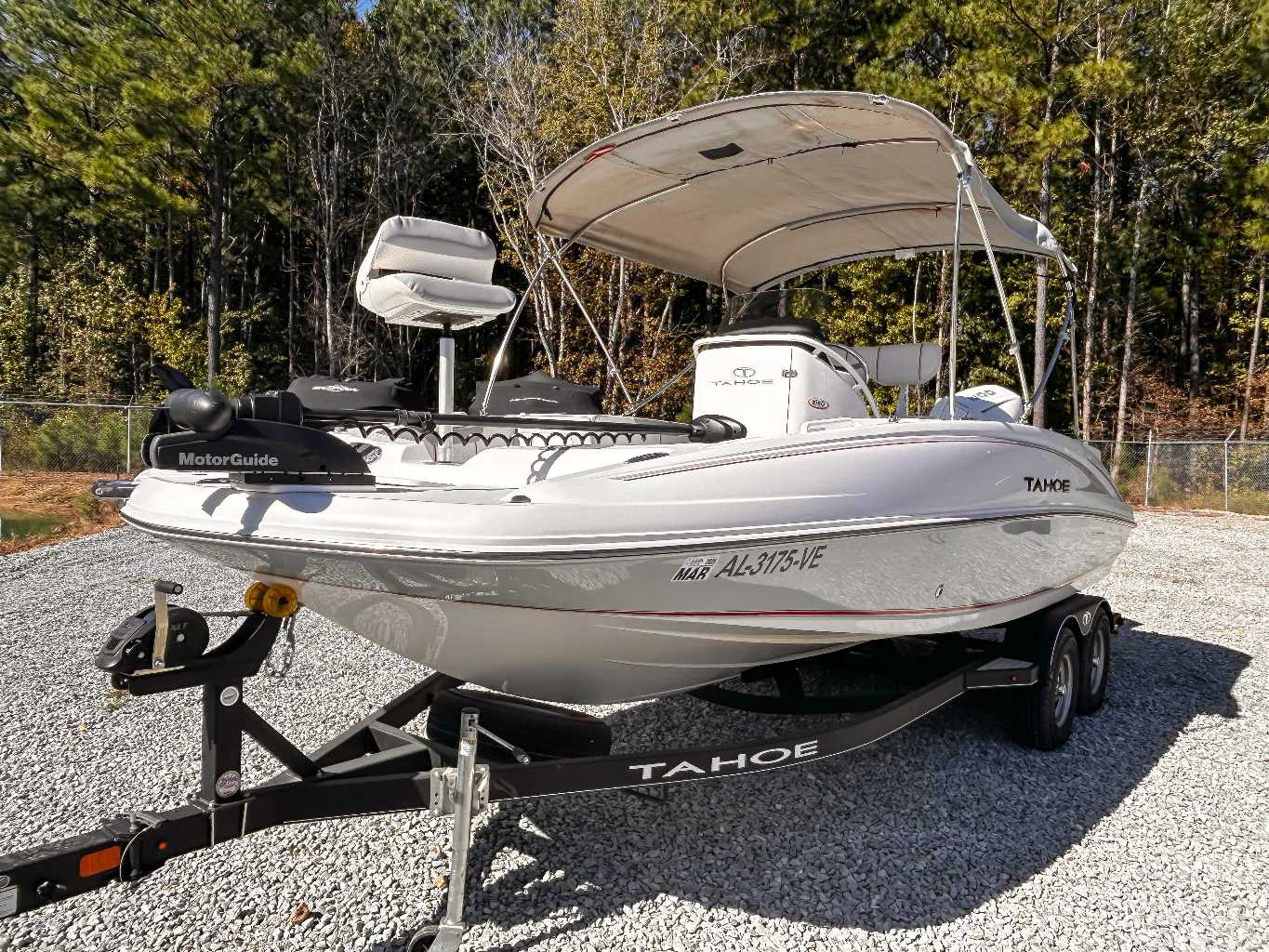 The 2020 Tahoe 2150 is a versatile 21' 1" deck boat designed for all-around family fun, from fishing to watersports and cruising. It features a wide-open layout with ample seating for up to 11 people, a Powerglide hull for performance, and extensive storage throughout. Key features include twin swim platforms with boarding ladders, an in-floor ski/wakeboard compartment, an aerated livewell, and a Kicker stereo system. It can be optioned with a fishing package and is rated for up to 225 HP outboards.