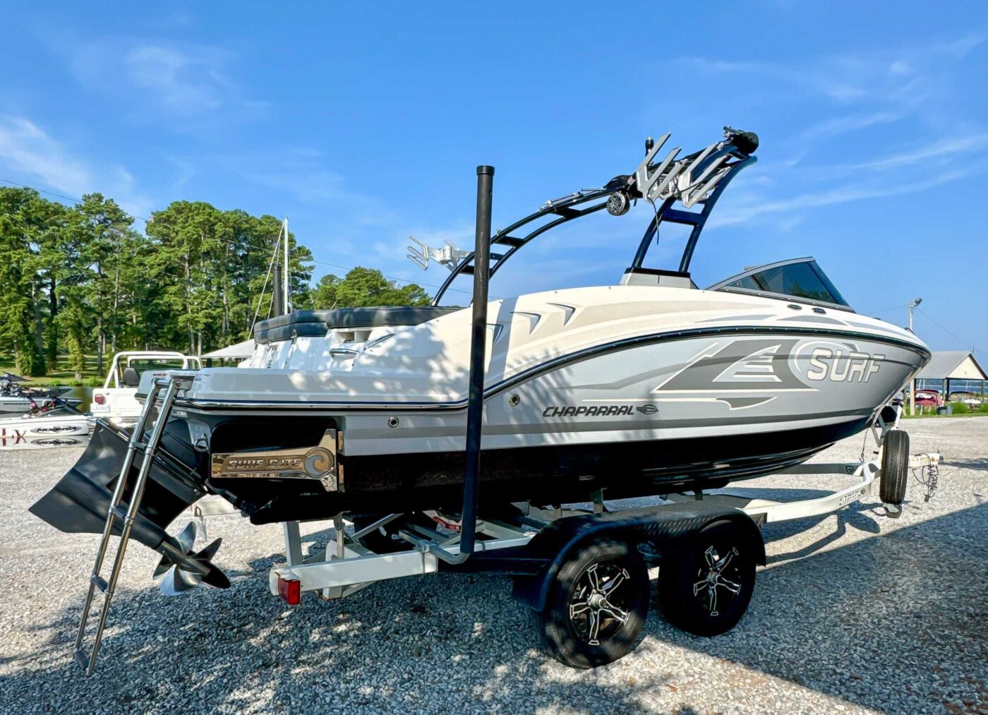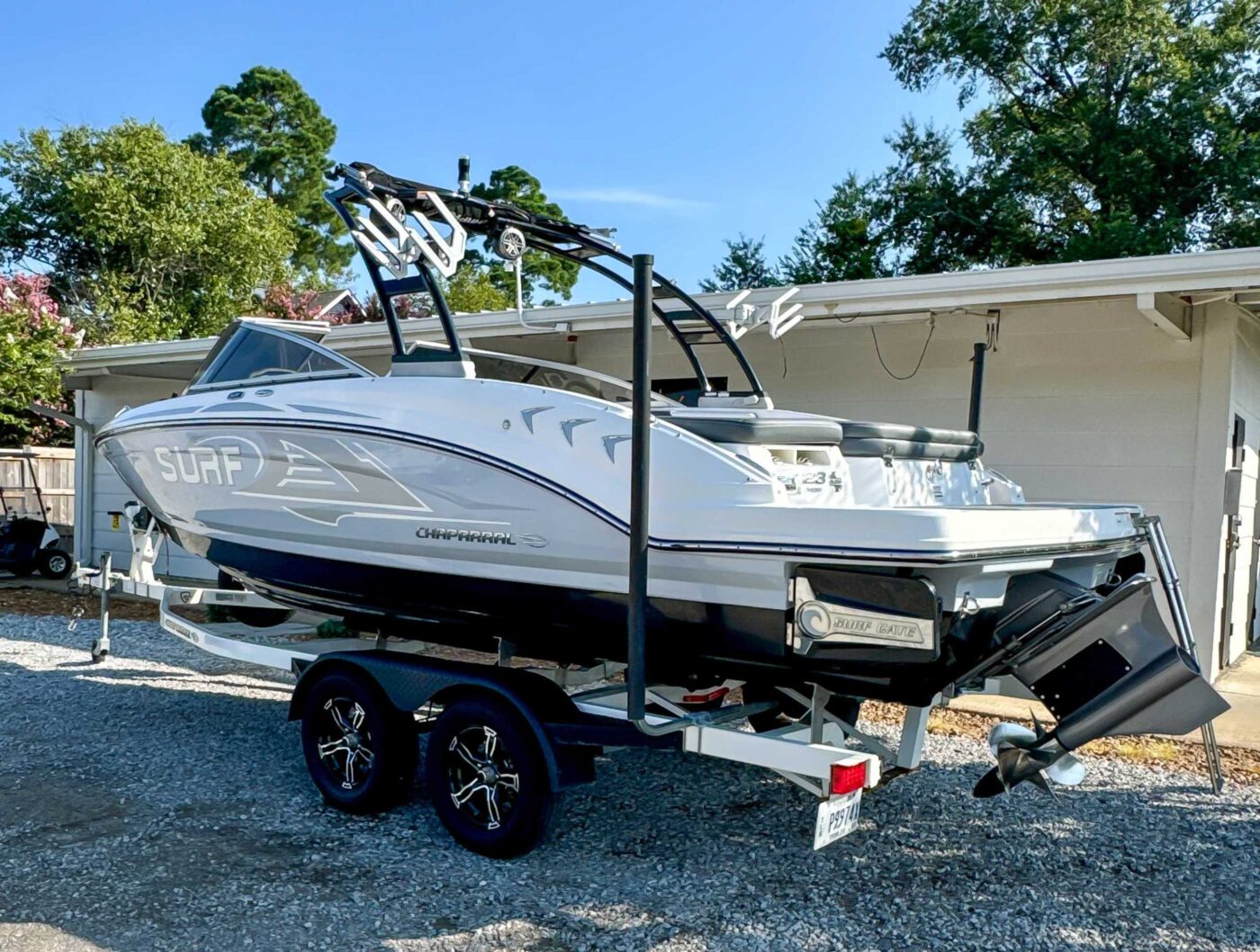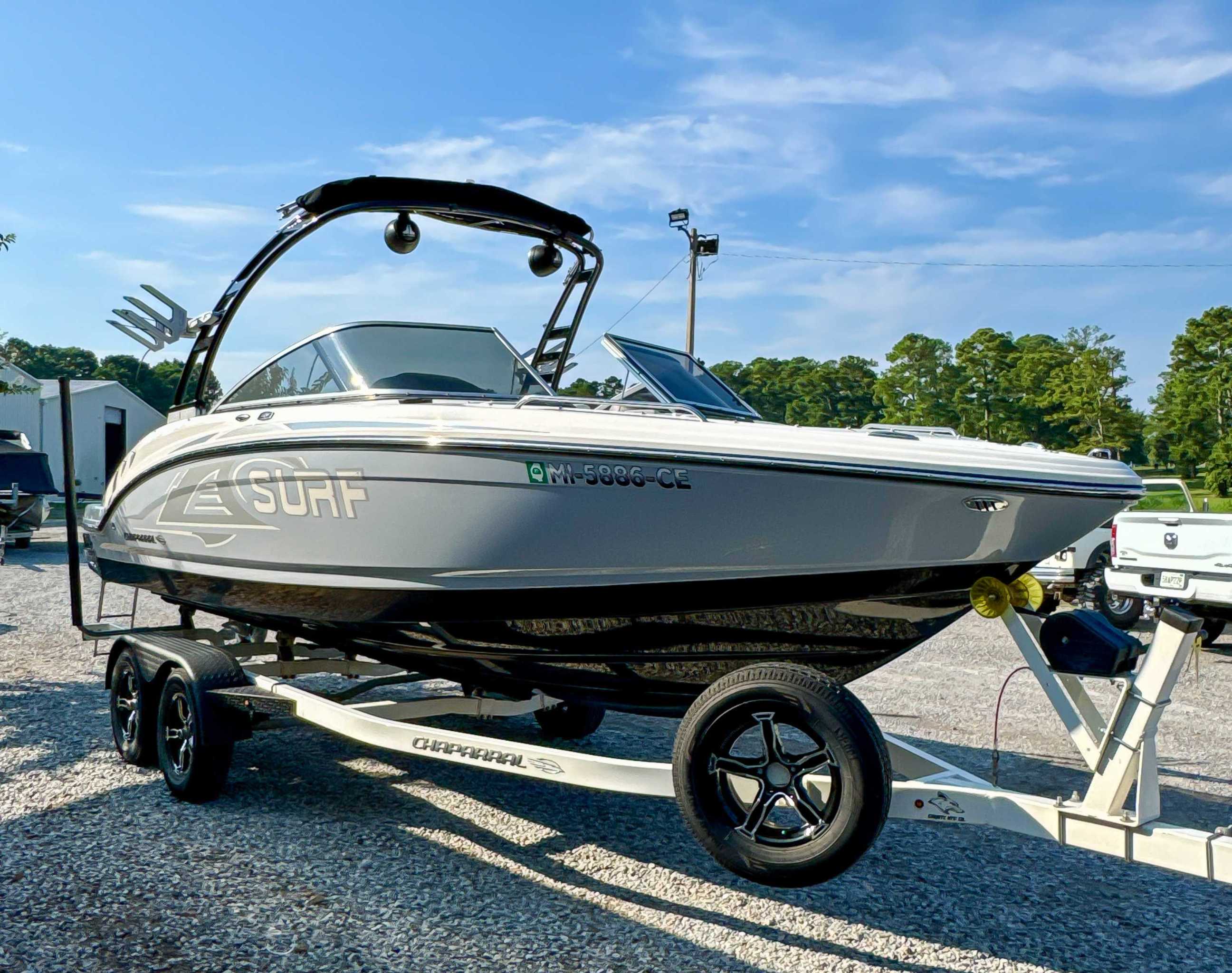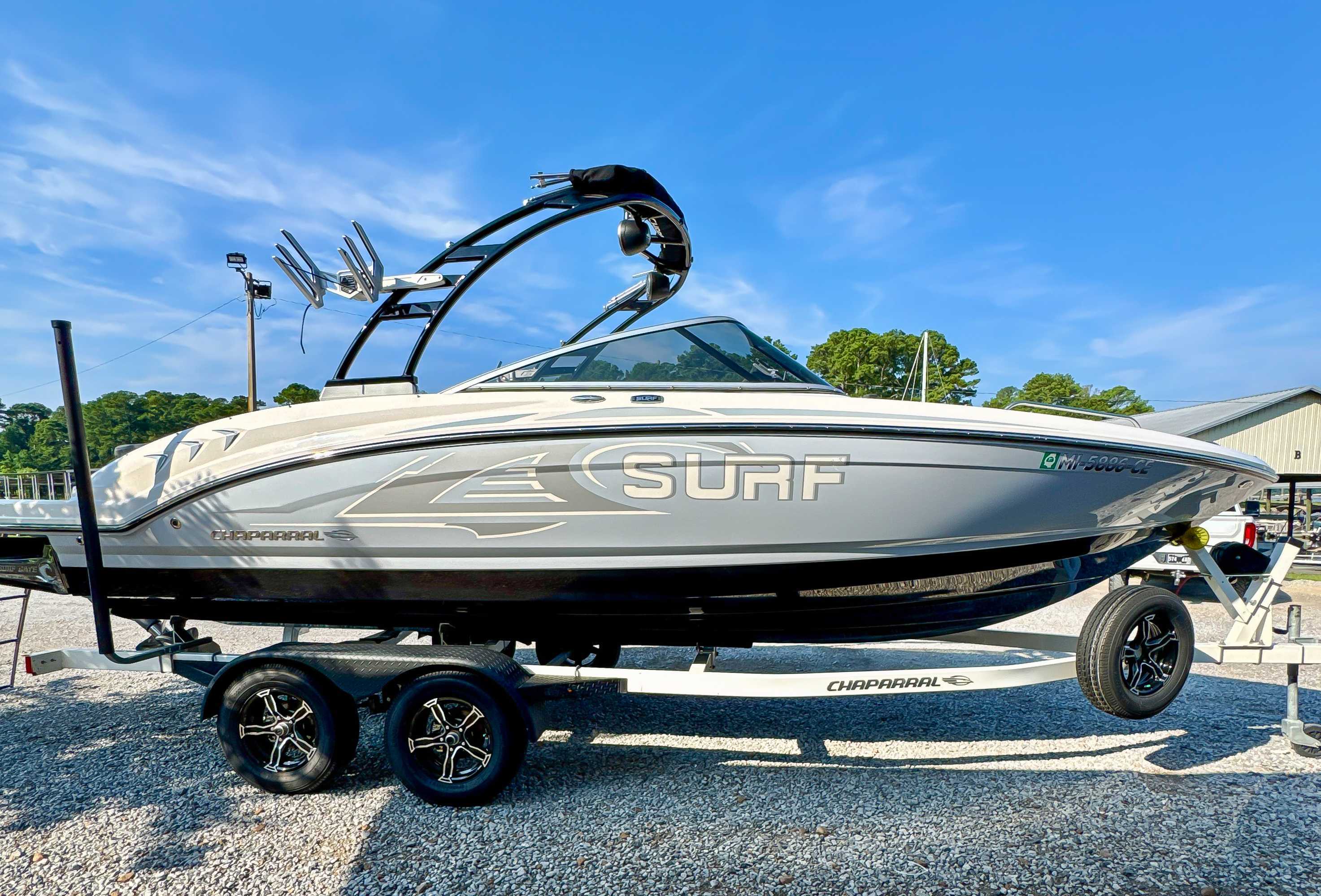 The 2021 Chaparral 23 Surf is a 23-foot bowrider designed for wakesports and family fun. It combines a luxurious interior with surf-specific features like the Malibu Surf Gate and a forward-facing Volvo Penta or MerCruiser sterndrive. The boat's ballast system and Medallion touchscreen display allow for easy wake customization. With a capacity for 13 people, it offers a versatile blend of comfort and performance.