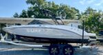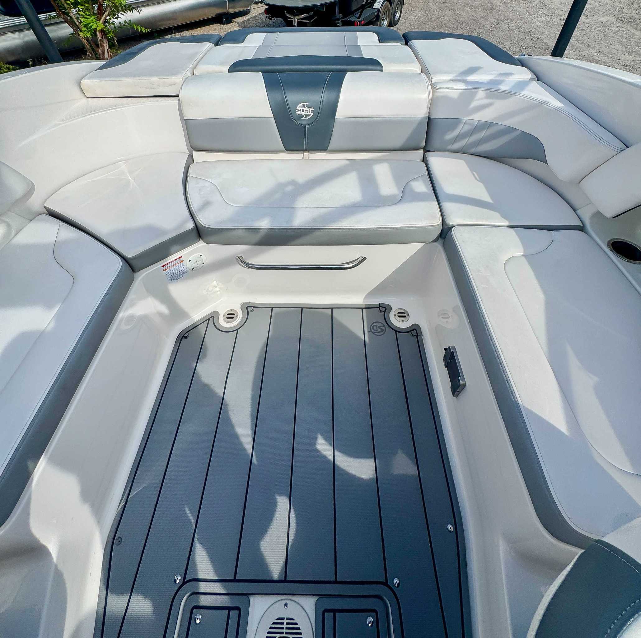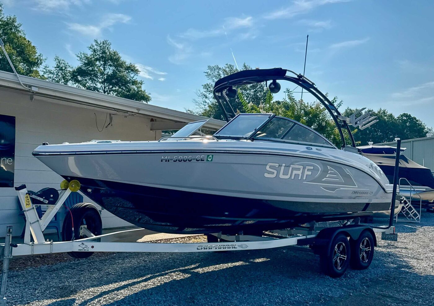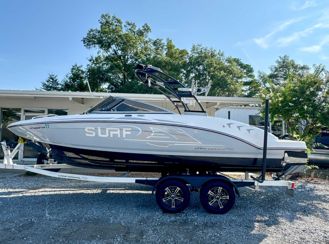 The 2021 Chaparral 23 Surf is a 23-foot bowrider designed for wakesports and family fun. It combines a luxurious interior with surf-specific features like the Malibu Surf Gate and a forward-facing Volvo Penta or MerCruiser sterndrive. The boat's ballast system and Medallion touchscreen display allow for easy wake customization. With a capacity for 13 people, it offers a versatile blend of comfort and performance.