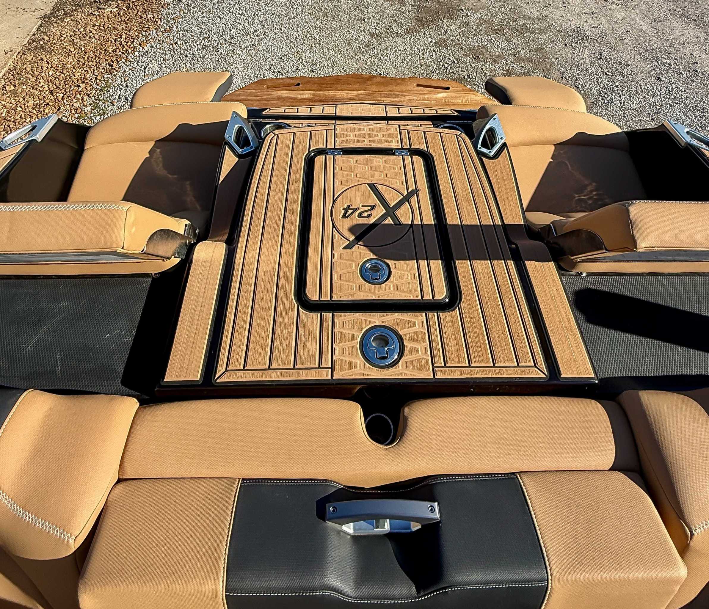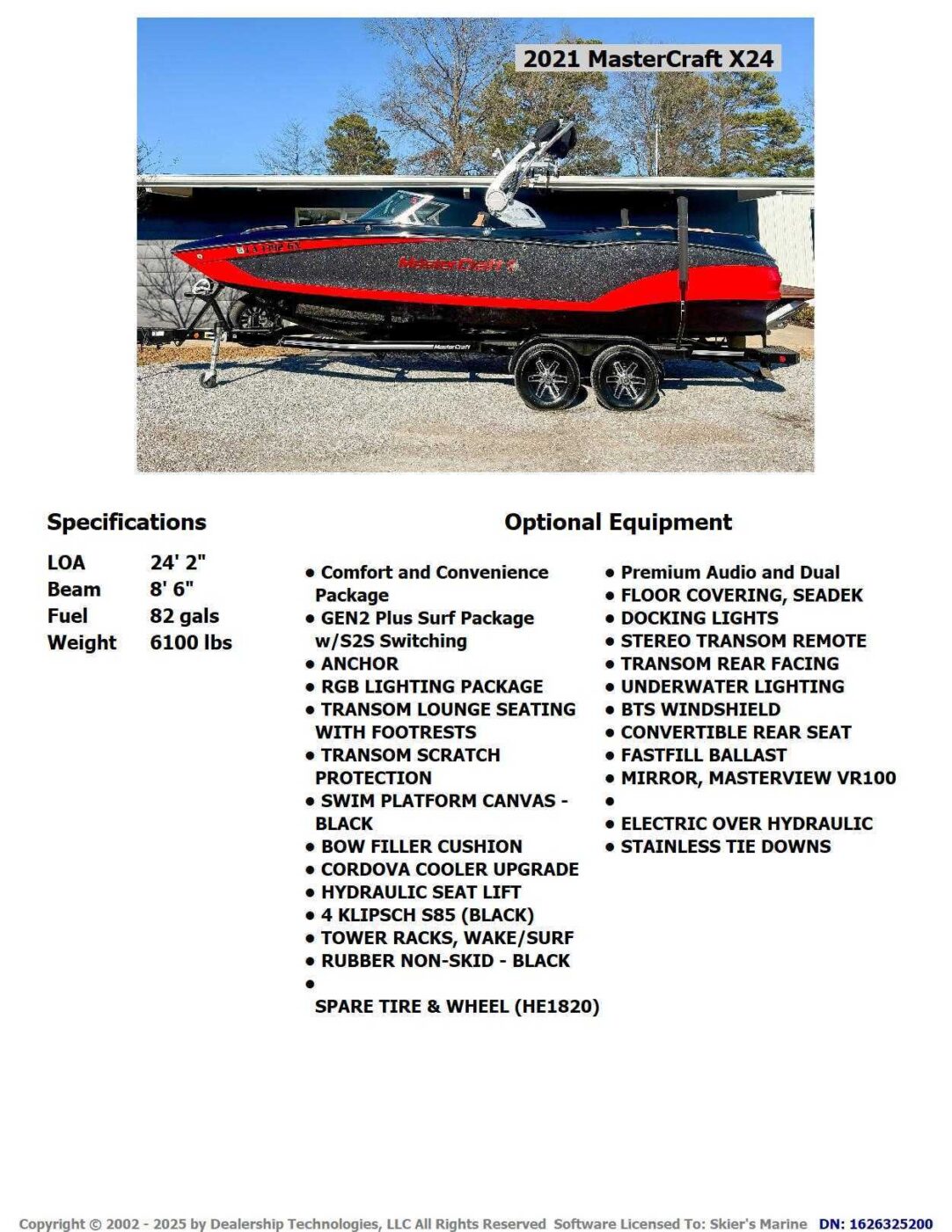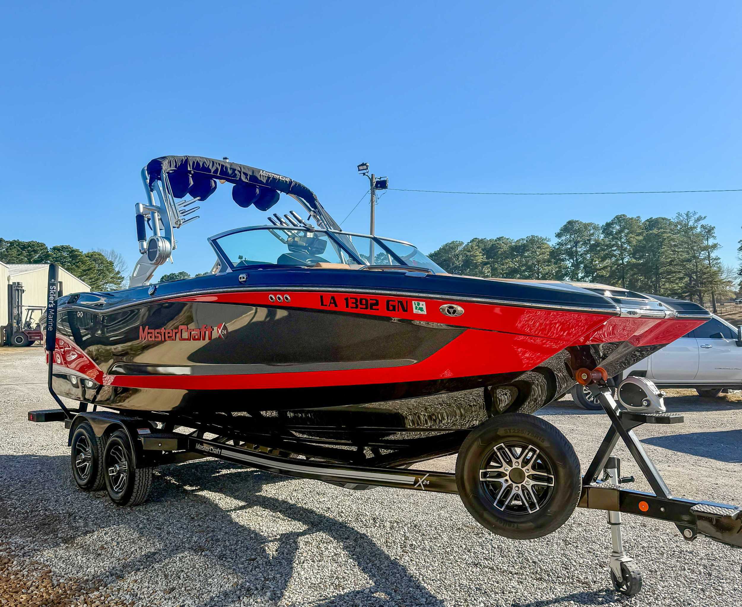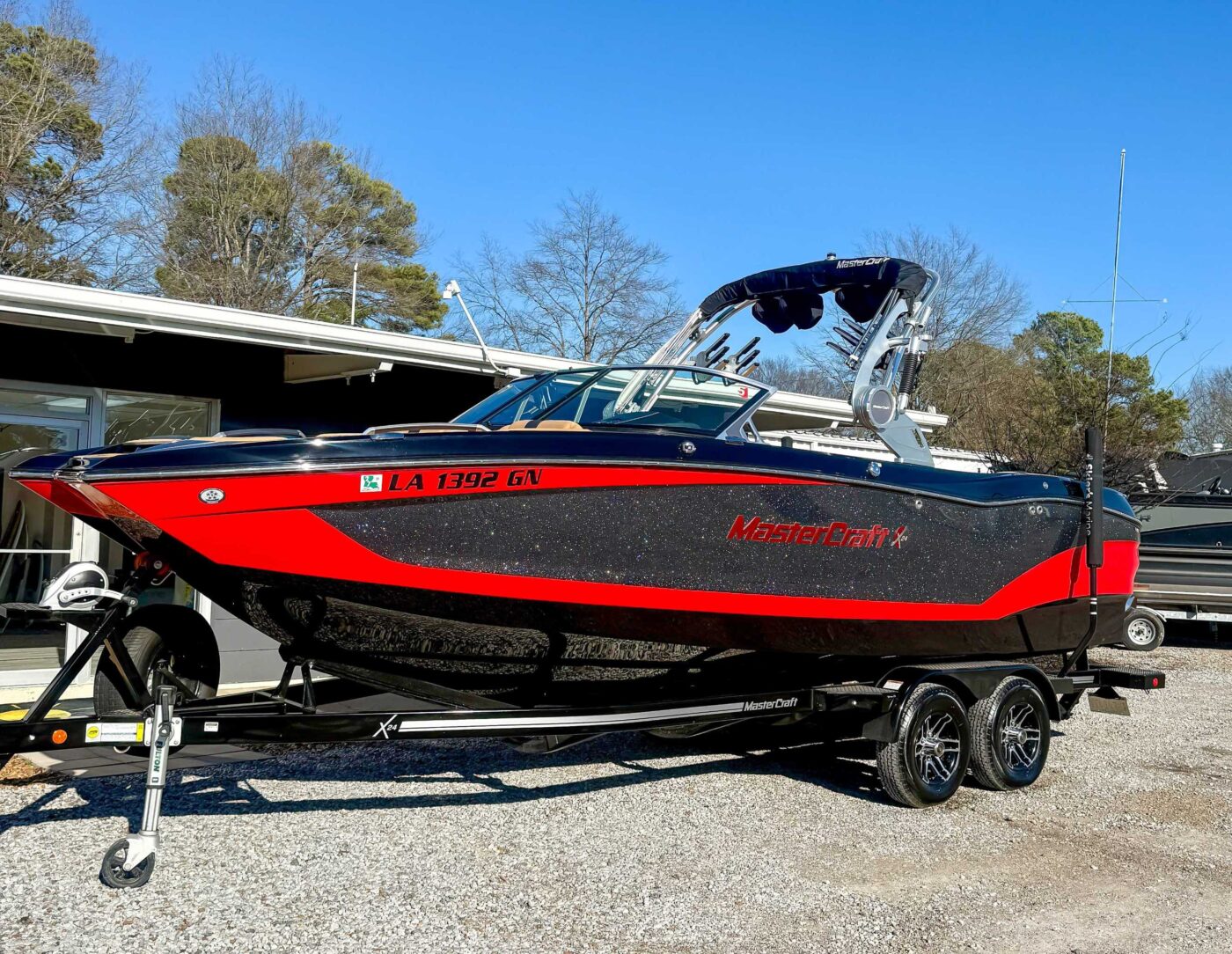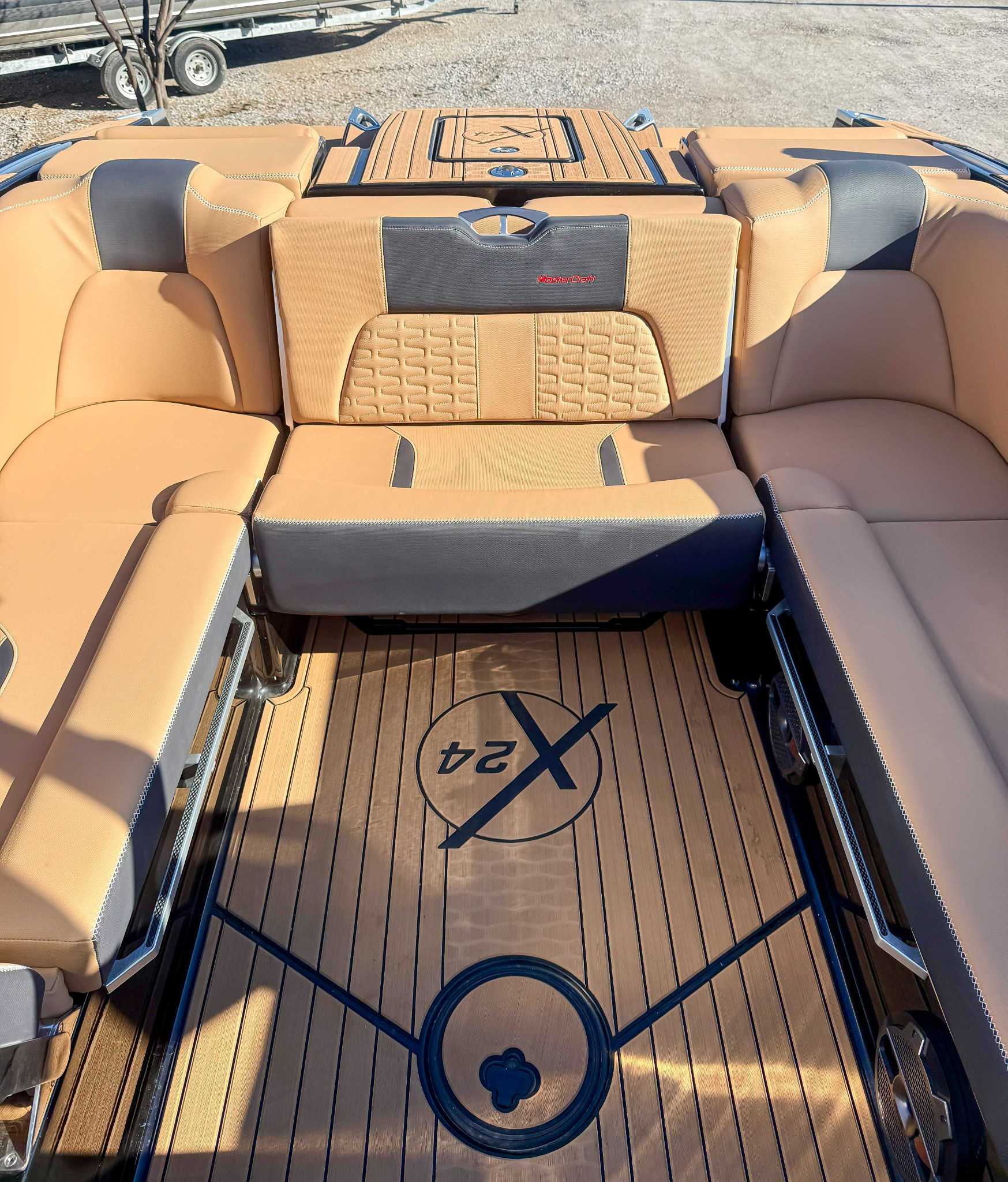 The 2021 MasterCraft X24 is an award-winning 24-foot (7.4 m) luxury towboat celebrated for its world-class wakes and waves. It features the innovative SurfStar system and a massive 4,300 lbs of ballast for easy wave customization. The spacious interior accommodates 18 people with premium amenities like CoolFeel vinyl, a powerful Klipsch audio system, dual-screen displays, and available heated seating and stern thruster options. Powered by an Ilmor 6.2L GDI engine (with an optional 7.4L or supercharged 6.2L