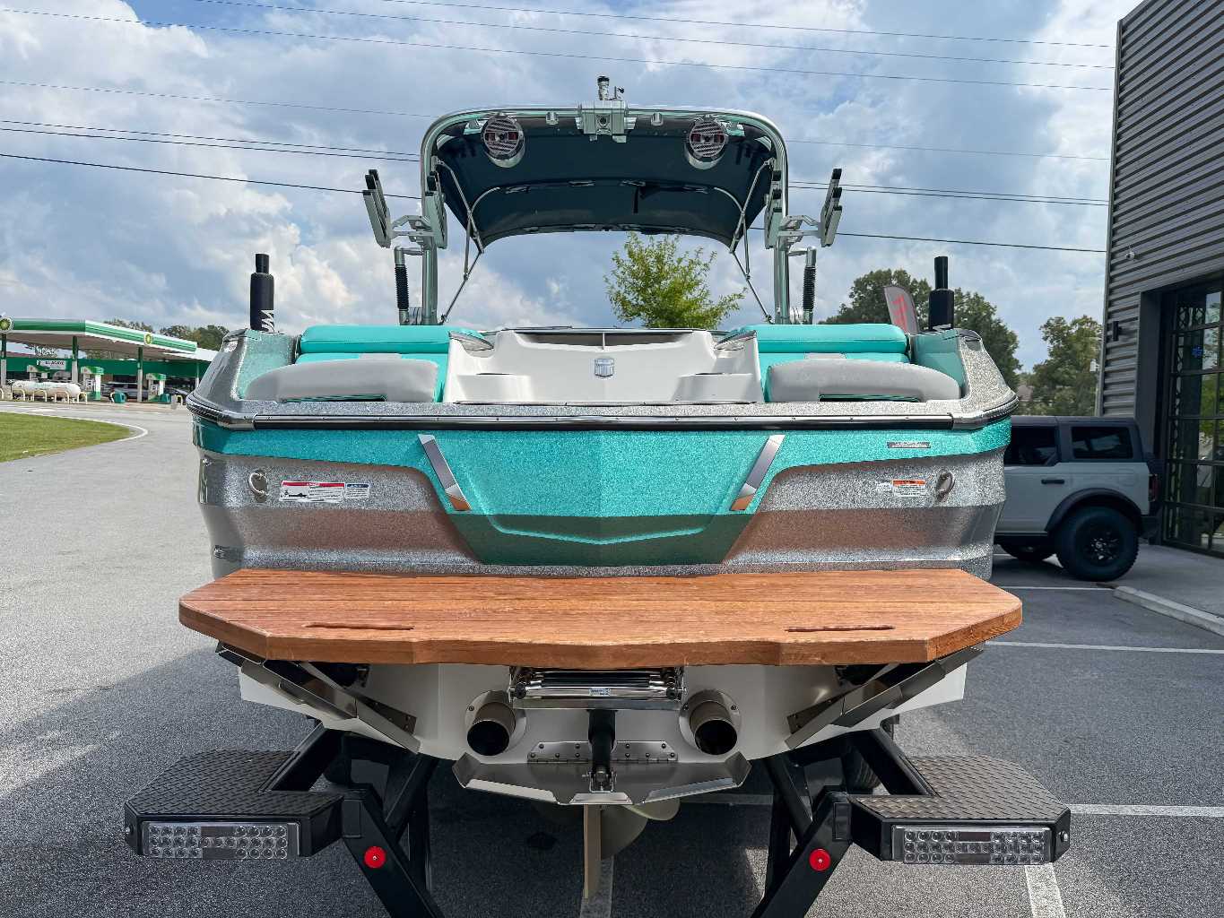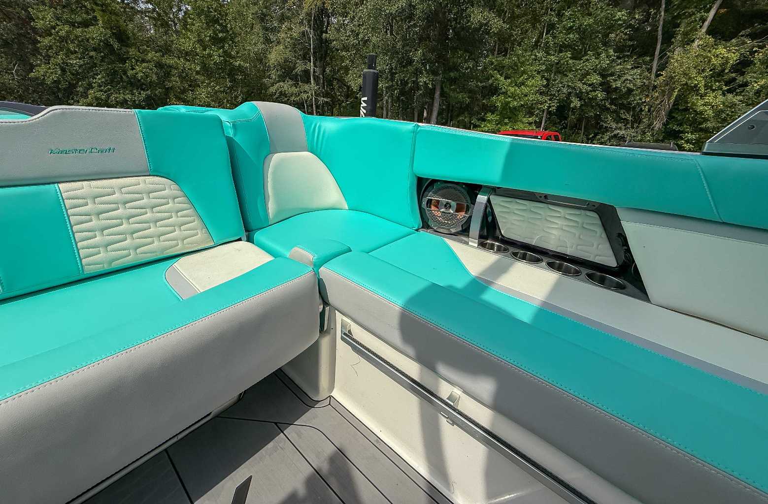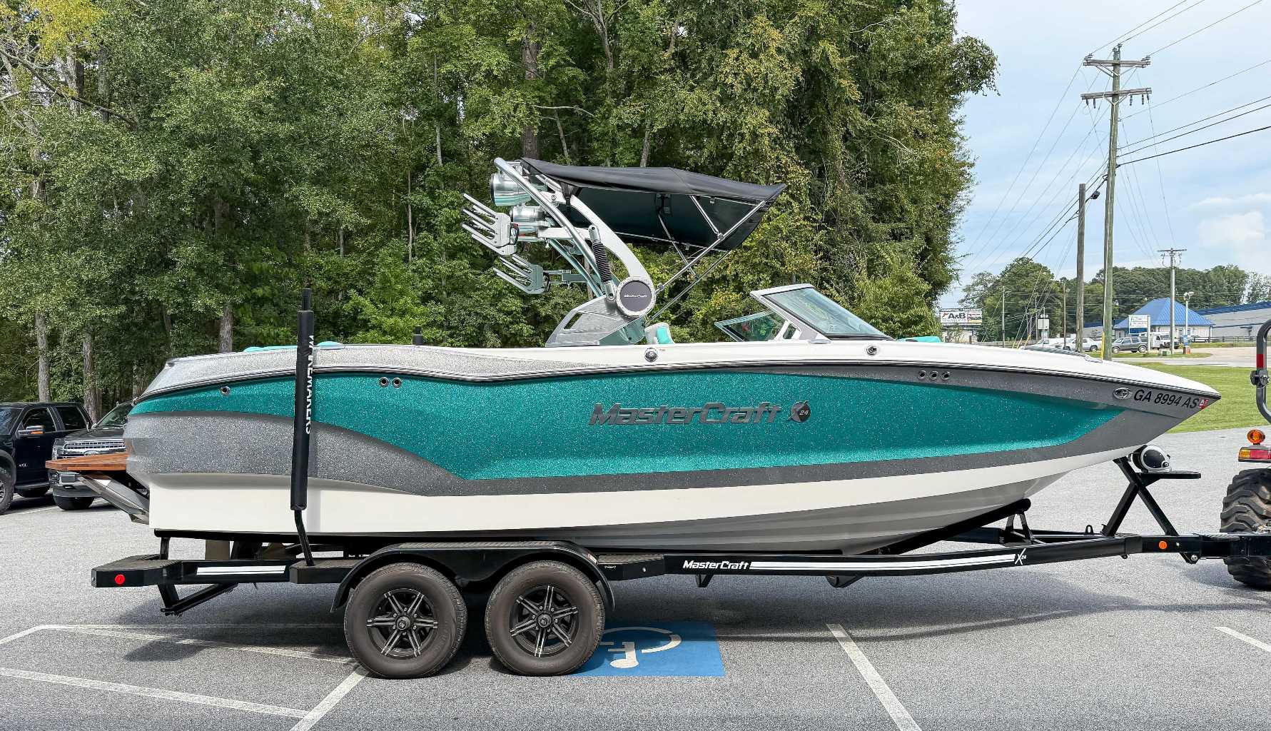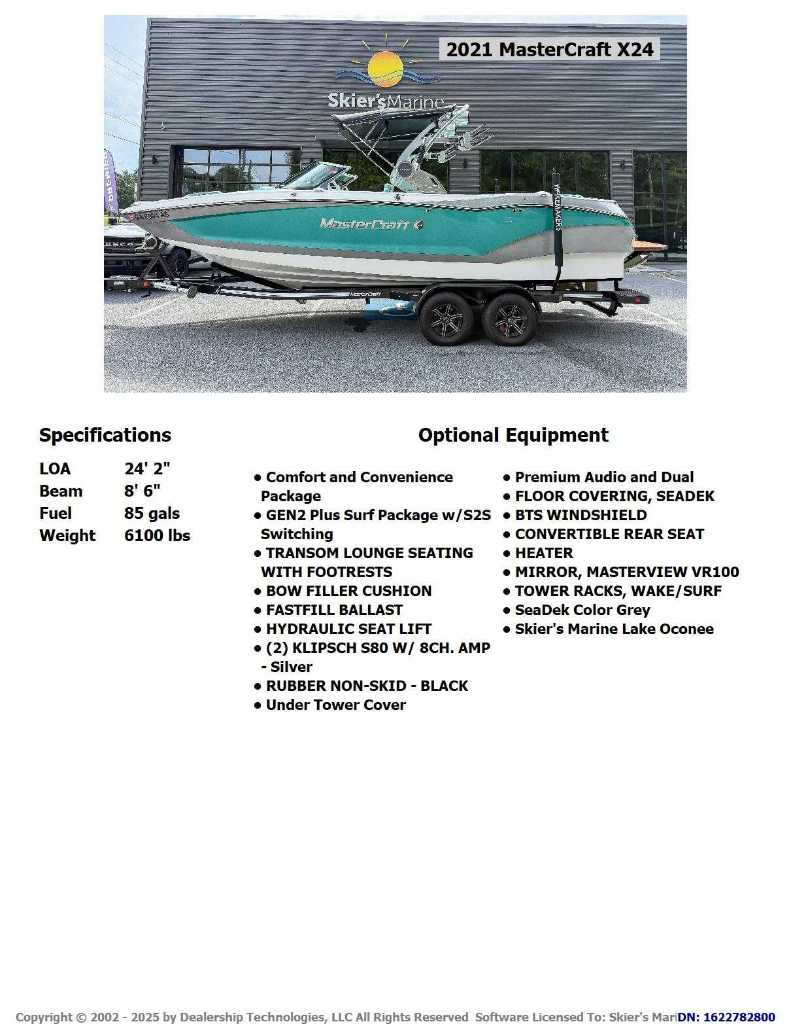 The 2021 MasterCraft X24 is an award-winning 24-foot (7.4 m) luxury towboat celebrated for its world-class wakes and waves. It features the innovative SurfStar system and a massive 4,300 lbs of ballast for easy wave customization. The spacious interior accommodates 18 people with premium amenities like CoolFeel vinyl, a powerful Klipsch audio system, dual-screen displays, and available heated seating and stern thruster options. Powered by an Ilmor 6.2L GDI engine (with an optional 7.4L or supercharged 6.2L