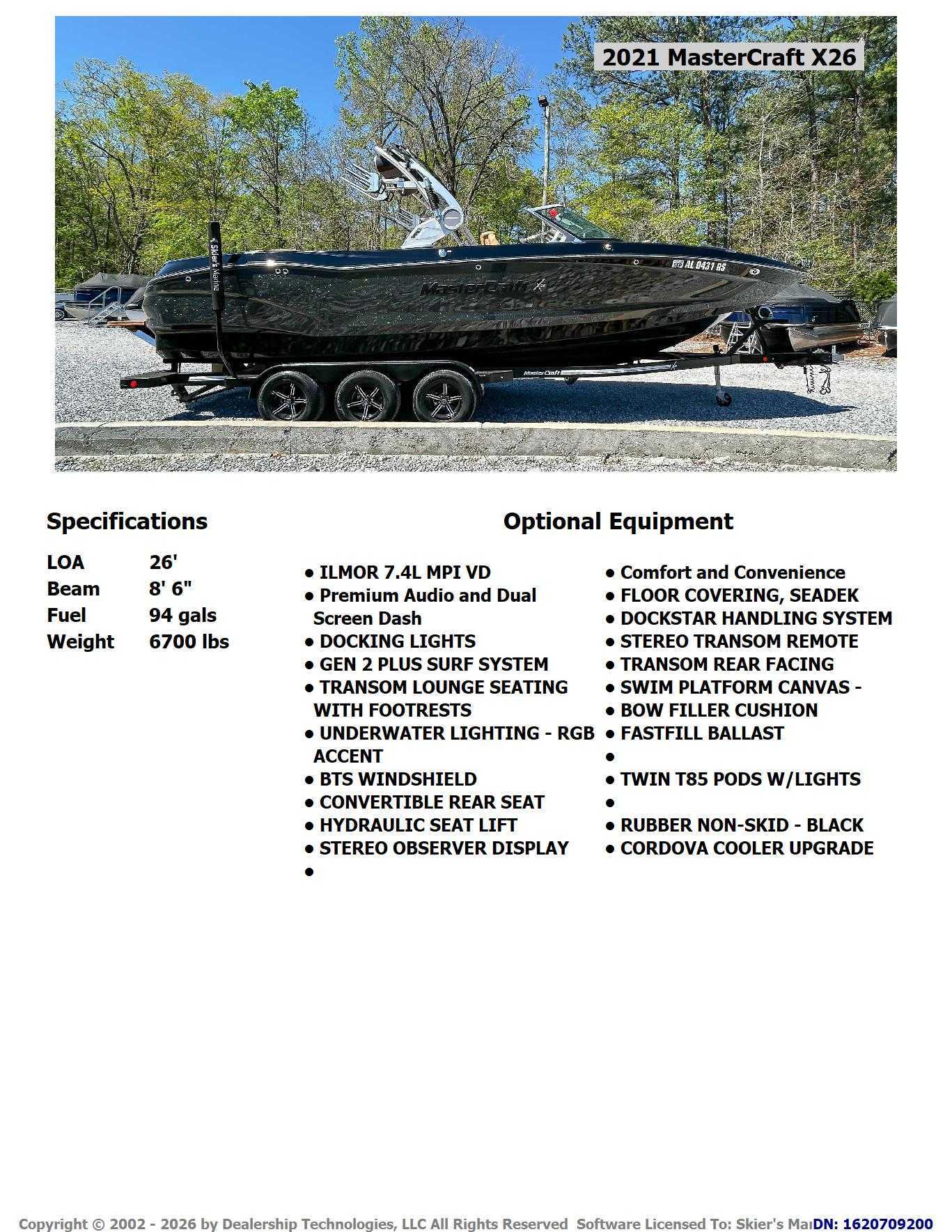 The 2021 MasterCraft X26 is an ideal purchase because it combines top-tier, yacht-certified luxury with elite-level wake performance, featuring a deep-V hull that handles rough water effortlessly. With space for 18 people, it is perfect for large groups, while the fast-fill ballast tanks, Gen 2 Surf System, and powerful 6.2L (or optional 7.4L) Ilmor engine deliver exceptional wakesurfing and wakeboarding performance. Owners also benefit from high-tech features like a dual-screen dash, premium Klipsch audio
