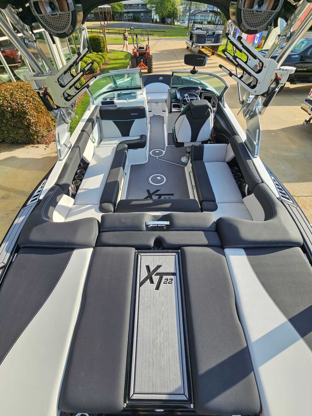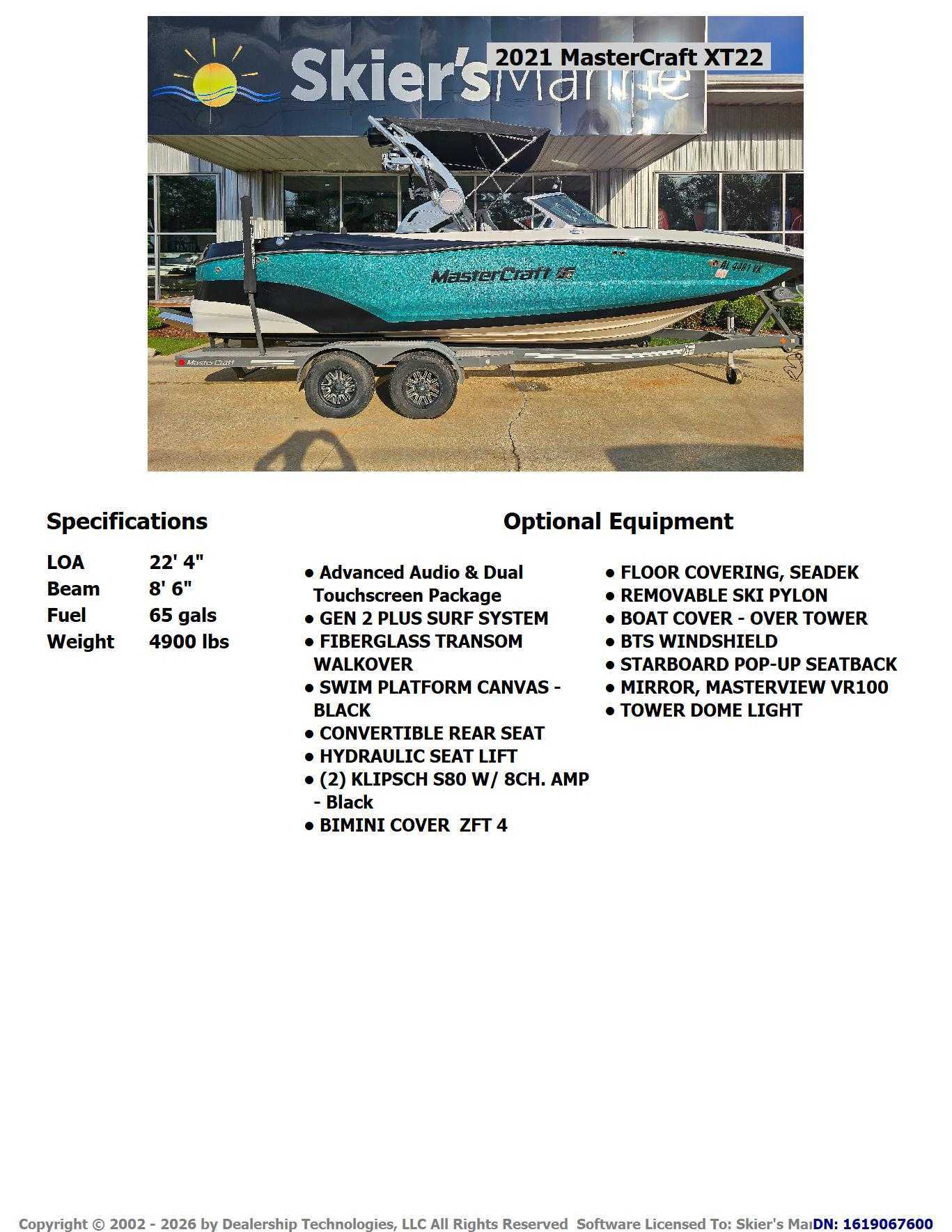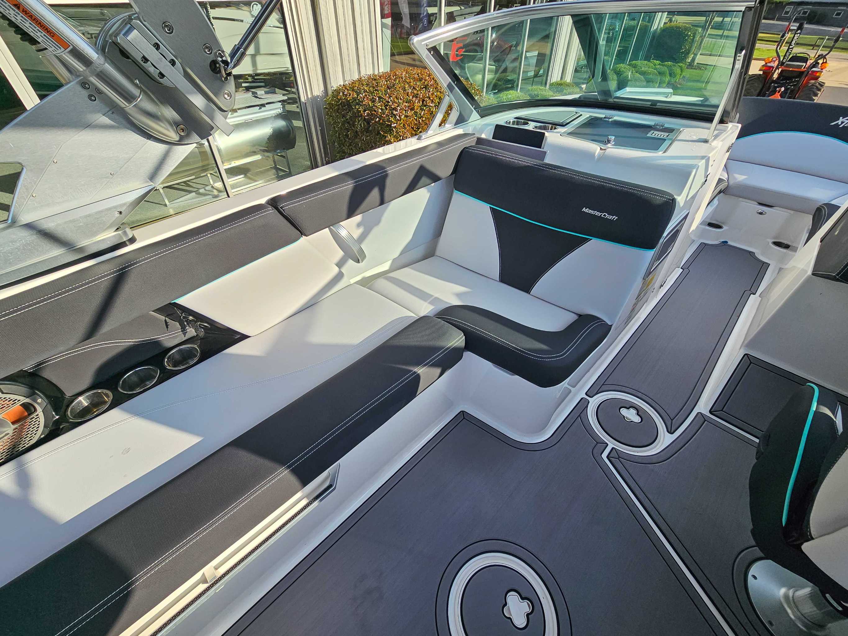 The 2021 MasterCraft XT22 is an ideal, versatile choice because it perfectly bridges the gap between high-performance watersports and premium comfort, offering a 22-foot, 4-inch, 16-passenger layout that is spacious yet easily garaged. It features the powerful and adjustable Gen2 surf system for top-tier wakesurfing, while maintaining impressive versatility for wakeboarding and skiing. With premium options like the 30-degree cooler "CoolFeel" vinyl, a convertible rear flip seat, and advanced touchscreen da