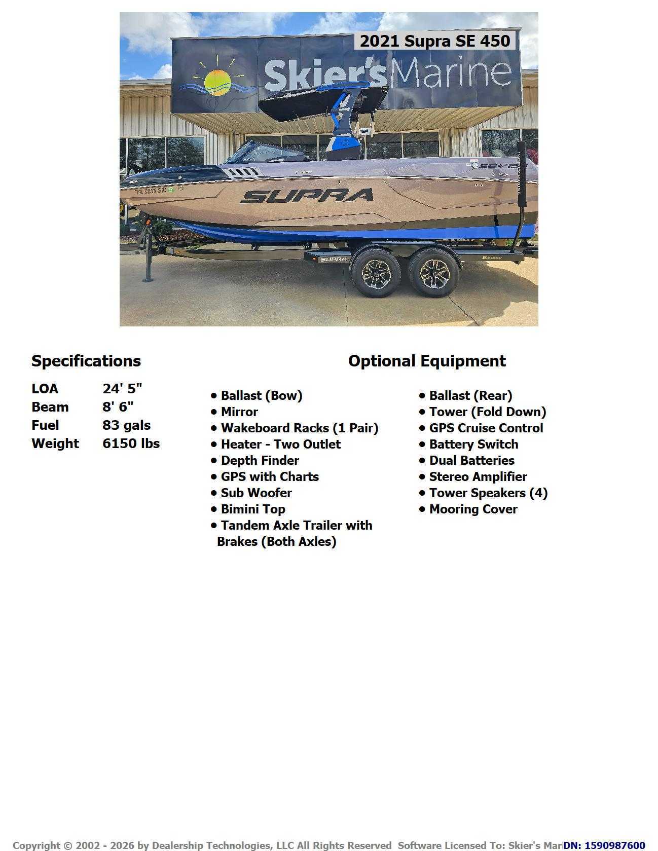 Skier's Marine is an award-winning ski boat, pontoon boat, and runabout sport boat dealer for brands like MasterCraft, Supra, Moomba, Chaparral, Harris, Premier, and Boston Whaler. We are not responsible for any pricing, options, specifications, or other listing errors on our site. Please contact us to confirm all details.