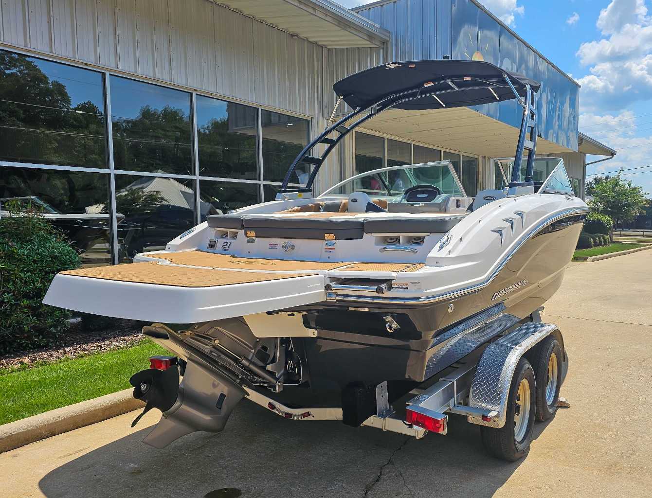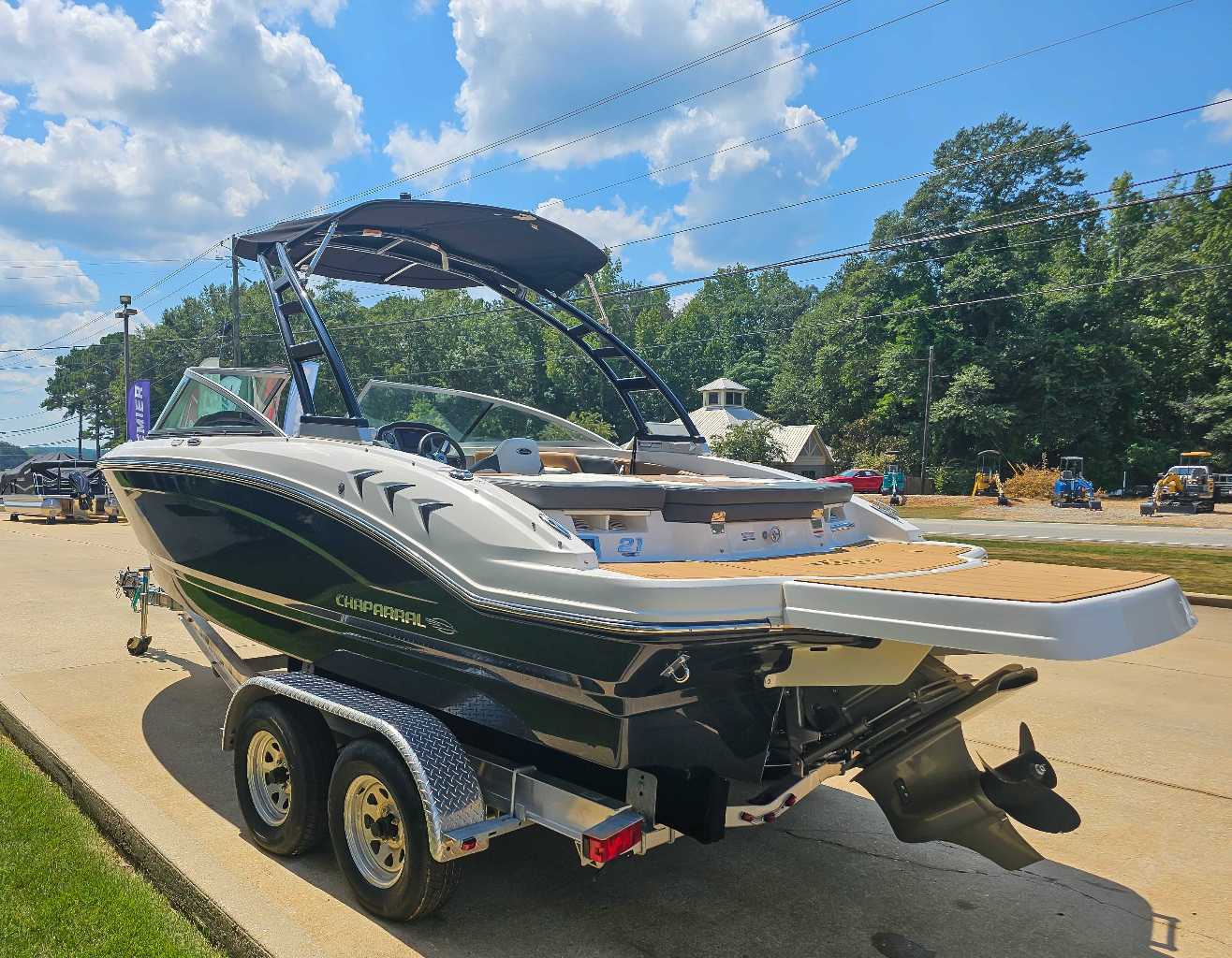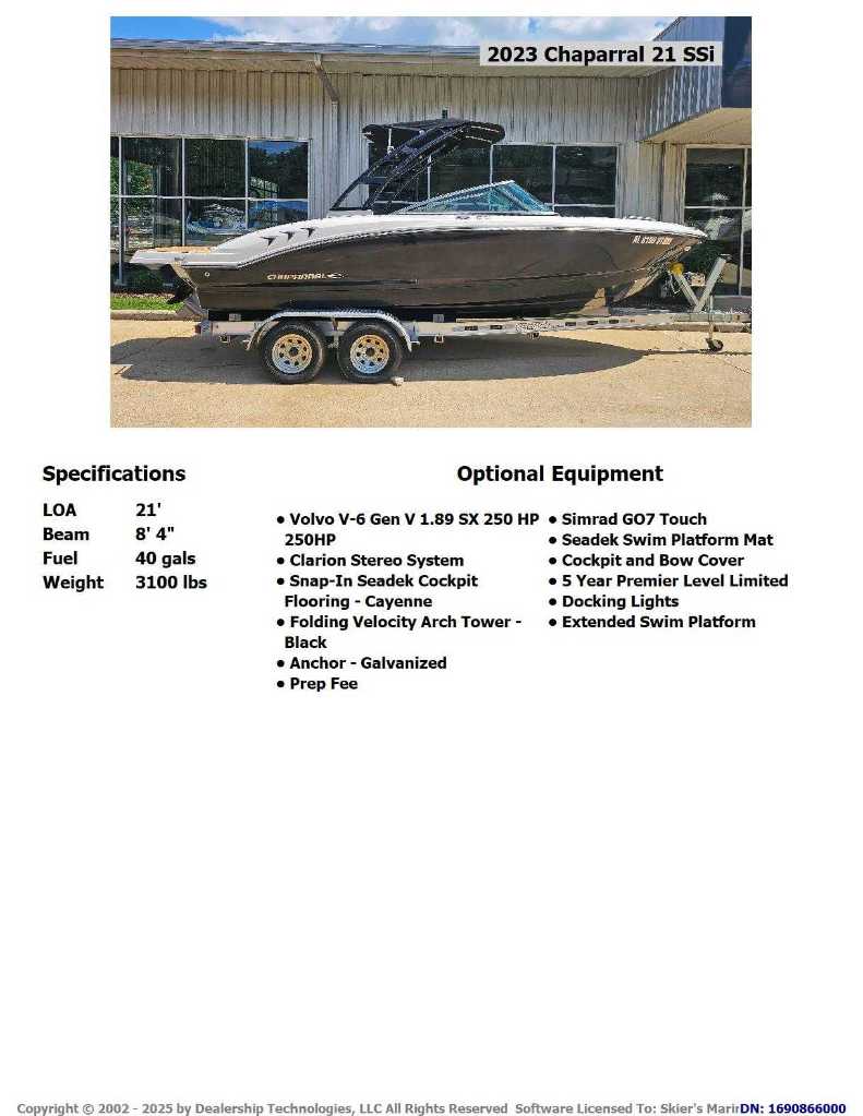 The 2023 Chaparral 21 SSi is a versatile 21-foot bowrider that blends performance, style, and family-friendly features. It features an extended V-plane hull for a smooth, efficient ride and is powered by various sterndrive or outboard engine options up to 250 HP. The spacious cockpit offers premium, stain-resistant seating for up to 12 people, a 70-quart built-in cooler, and an integrated swim platform, making it ideal for day cruising, watersports, and fishing. It comes standard with a custom-matched tand