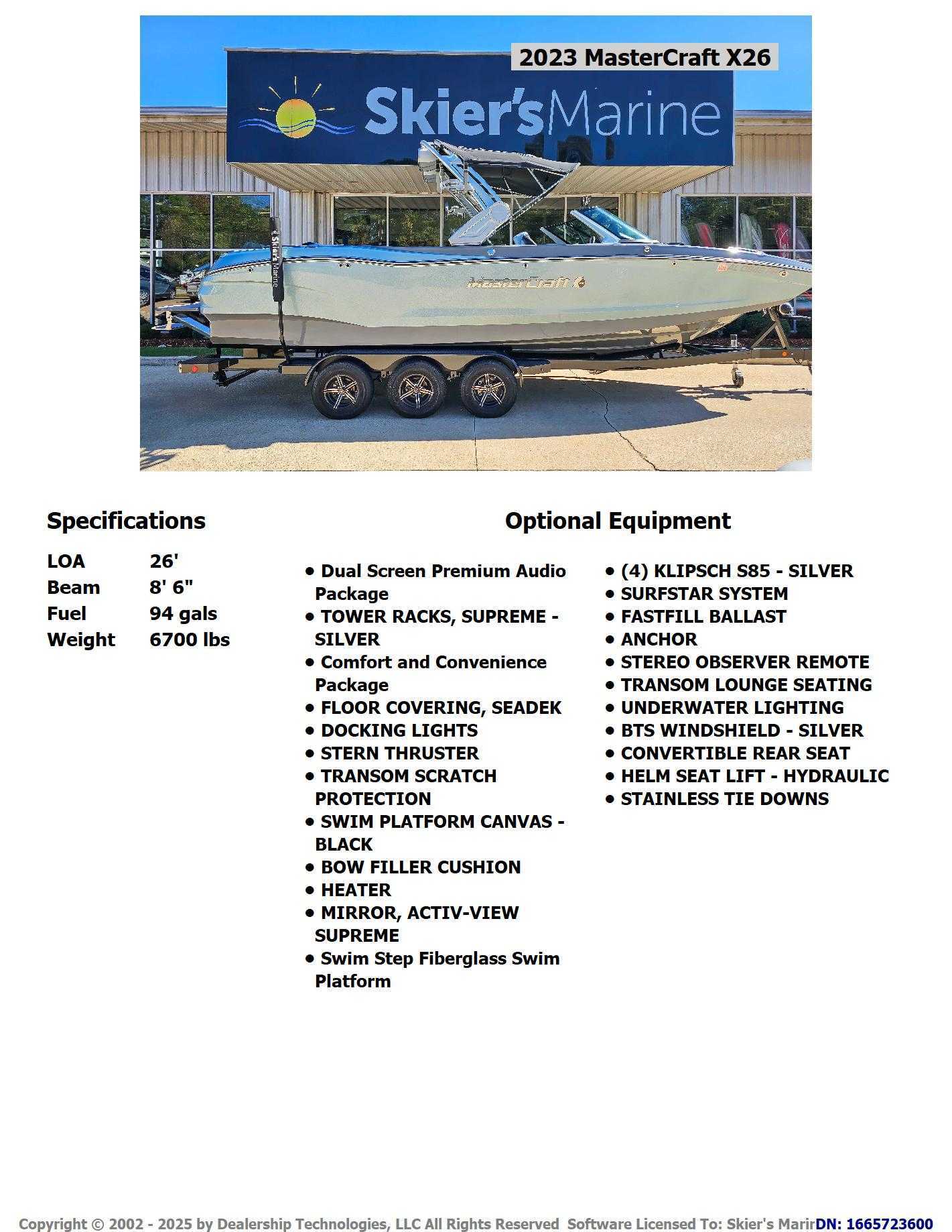 Skier's Marine is an award-winning ski boat, pontoon boat, and runabout sport boat dealer for brands like MasterCraft, Supra, Moomba, Chaparral, Harris, Premier, and Boston Whaler. We are not responsible for any pricing, options, specifications, or other listing errors on our site. Please contact us to confirm all details.