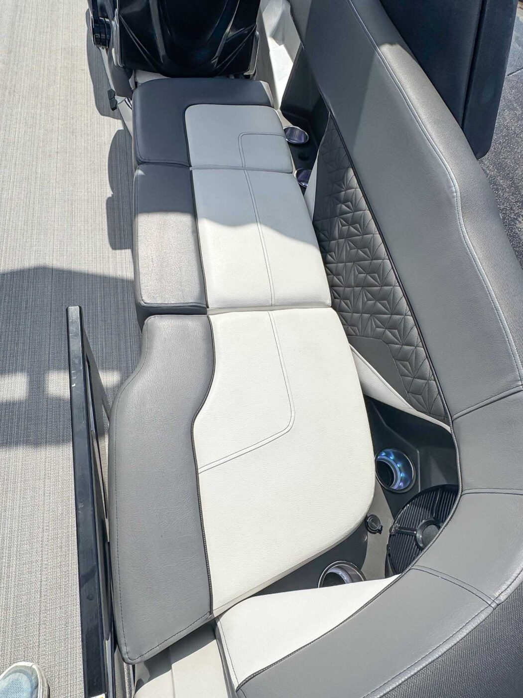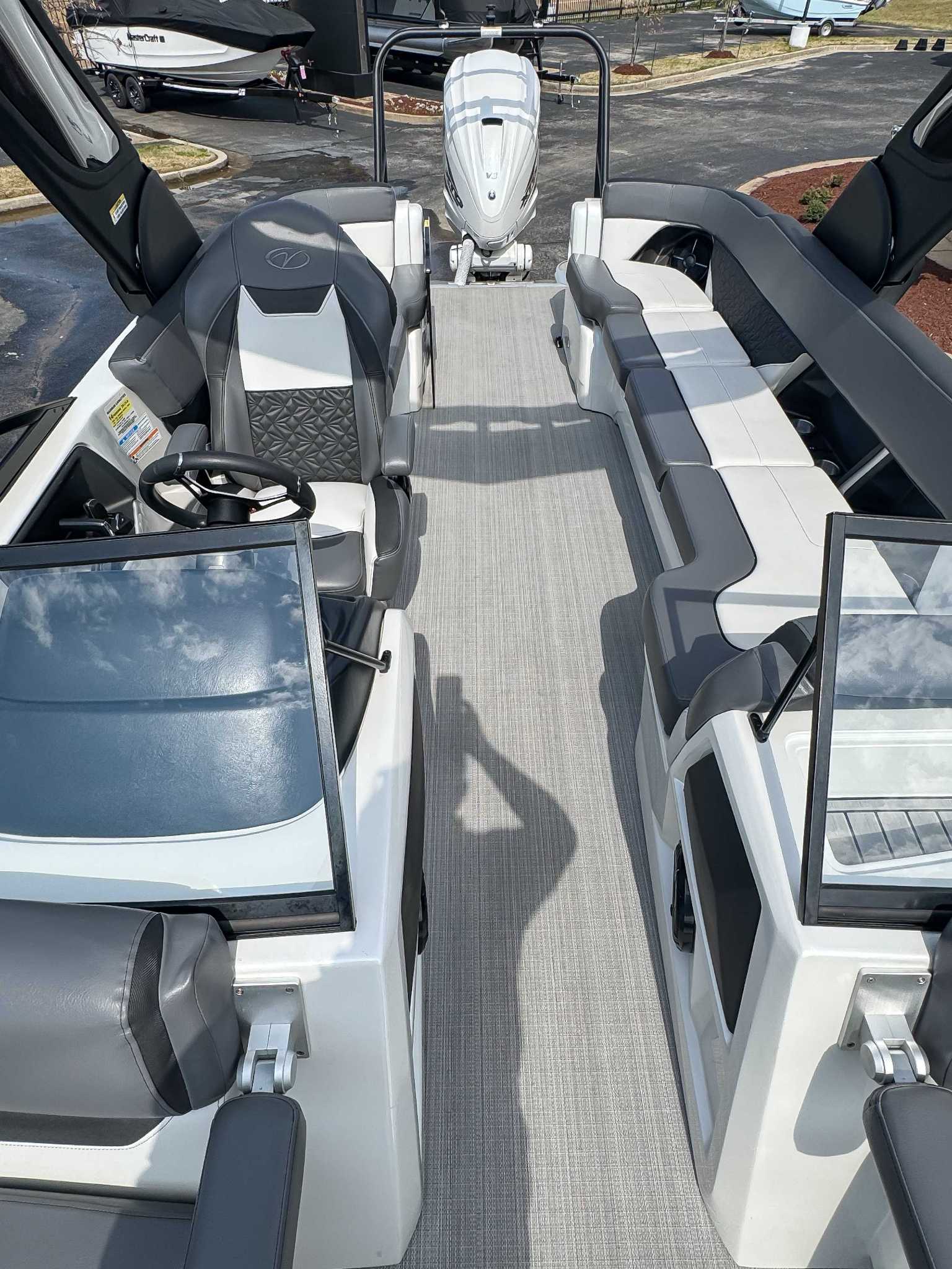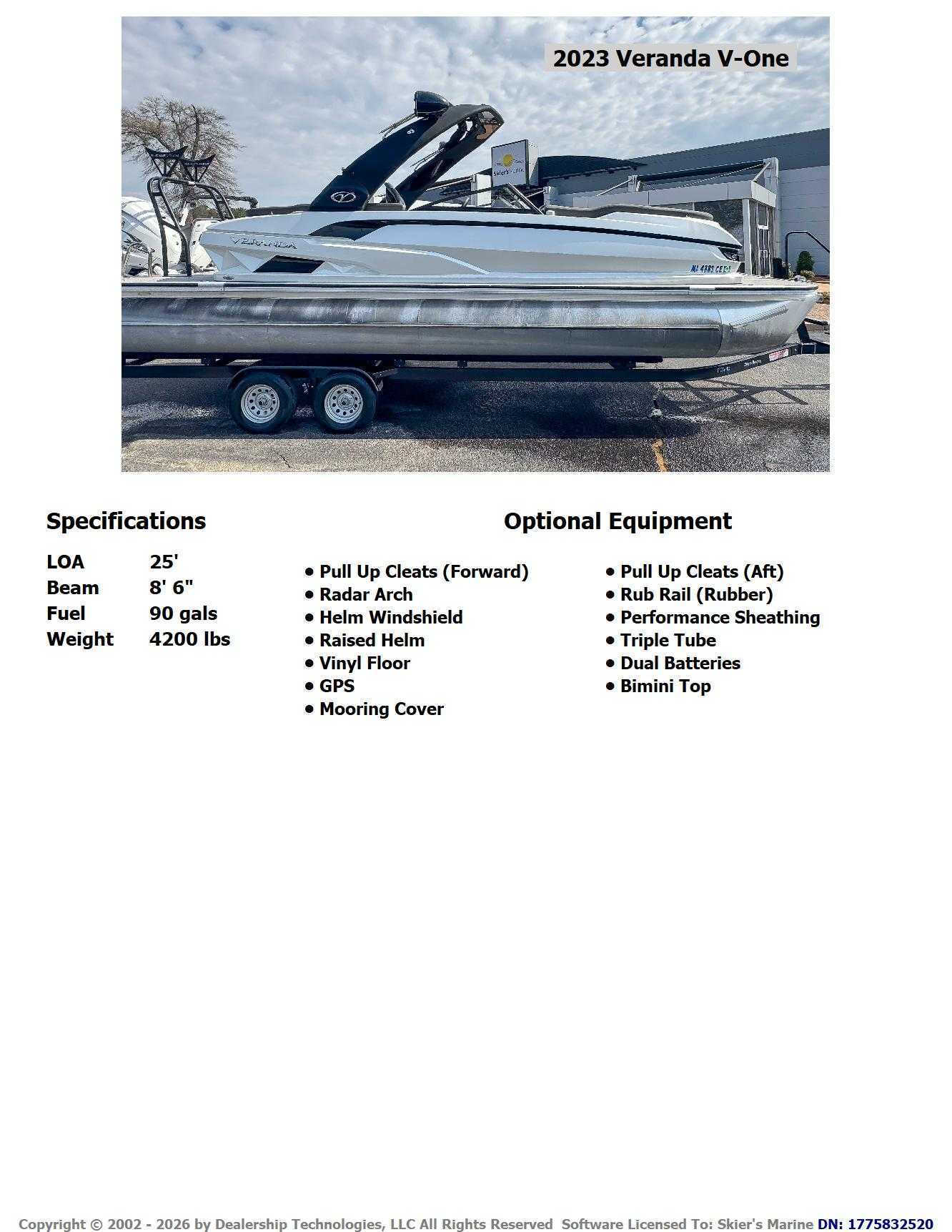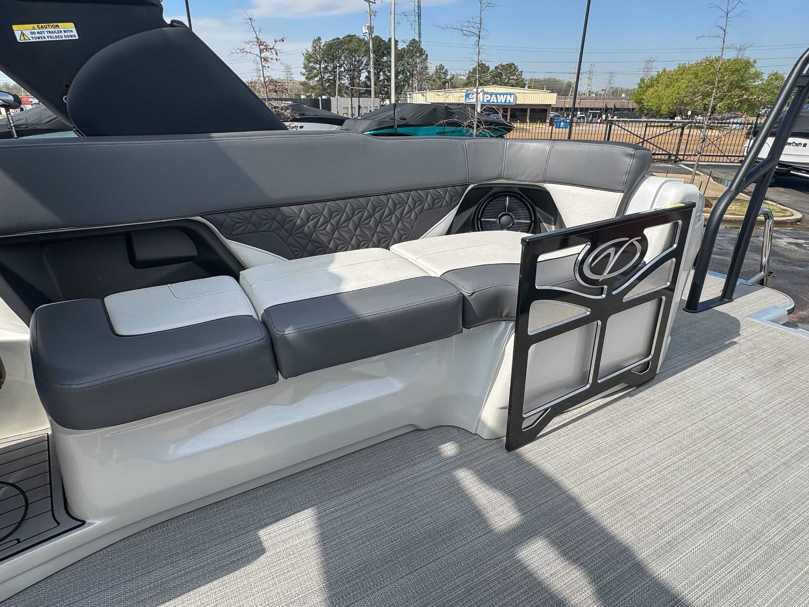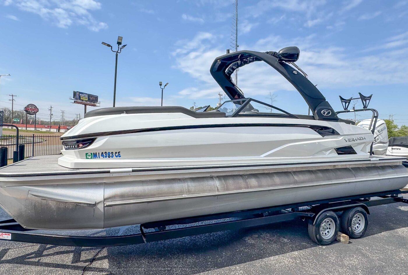 The 2023 Veranda V One combines top-tier performance with unmatched, rot-free durability, utilizing a patented all-aluminum, all-welded interlocking deck system that guarantees a lifetime of use. As Verandas flagship luxury model, it offers a sleek fiberglass exterior, high-end seating, and premium Wet Sounds audio, providing a luxurious experience for up to 14 passengers. Powered exclusively by reliable Yamaha outboards, this tri-toon delivers superior handling, speed, and comfort on the water. With a wo