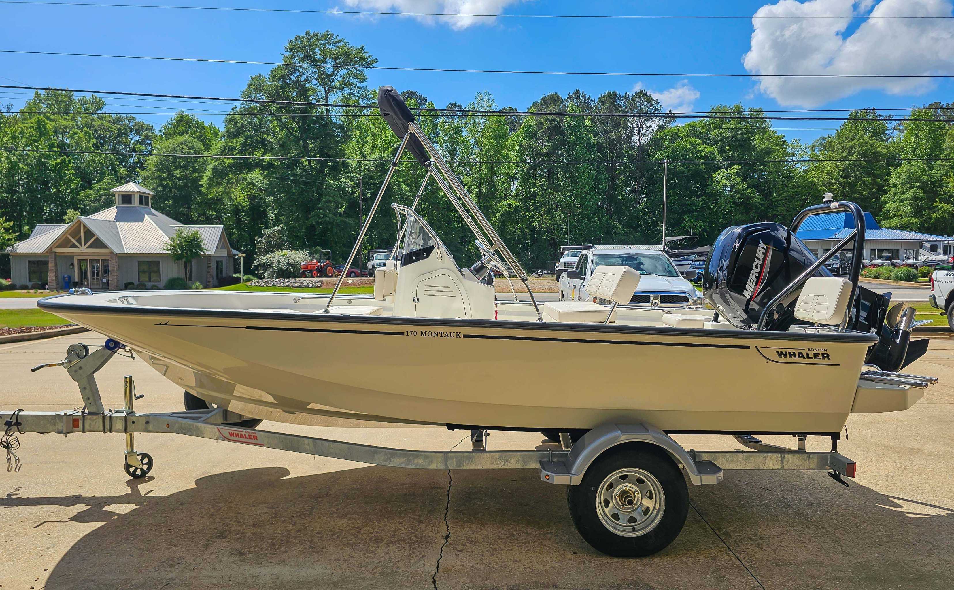 All hardware 316-L stainless steel All rails welded 316-L stainless steel DECK / COCKPIT 8" stainless steel cleats (3) 19" interior freeboard Boarding steps (midship) (molded-in port and starboard) Bow and stern lifting eyes Bow locker with fiberglass cover and overboard drain Bow rail welded stainless steel Cup holders at bow (2) Forward fishbox with overboard drain Heavy-duty rub rail Integrated transom storage Rod holders (4) (stern) Side rails stainless steel Swim platform with grab rail and telescoping stainless steel swim ladder (fiberglass) CONSOLE 12 V receptacle Access door with lockable stainless-steel latch Acrylic windshield Electrical switch panel with circuit breaker protection Drink holders (3) Electric horn Mercury binnacle control Partitioned storage at top of helm Stainless steel steering wheel Welded stainless steel grab rail Lockable storage console @2022 Boston Whaler. All rights reserved. Model year boats may not contain all the features or meet specifications described above. Confirm availability of all accessories and equipment with an authorized Boston Whaler dealer prior to purchase. Due to variable environmental conditions, Boston Whaler makes no guarantees regarding performance. 170 MONTAUK SEATING Reversible pilot seat with locking backrest and storage MECHANICAL 90 EXLPT EFI Black Command Thrust FourStroke Mercury engine SmartCraft digital gauges Battery box and switch with hold-down strap in console Bilge pump with float switch (2) Classic style navigation lights Fuel tanks integrated (25 gallons) Hydraulic steering Propeller stainless steel VesselView mobile GALVANIZED TRAILER (WITH SWING TONGUE & DISC BREAKS) LED lights Spare tire Tie-downs Torsion Axle Trailer jack Radial tires Winch with nylon strap