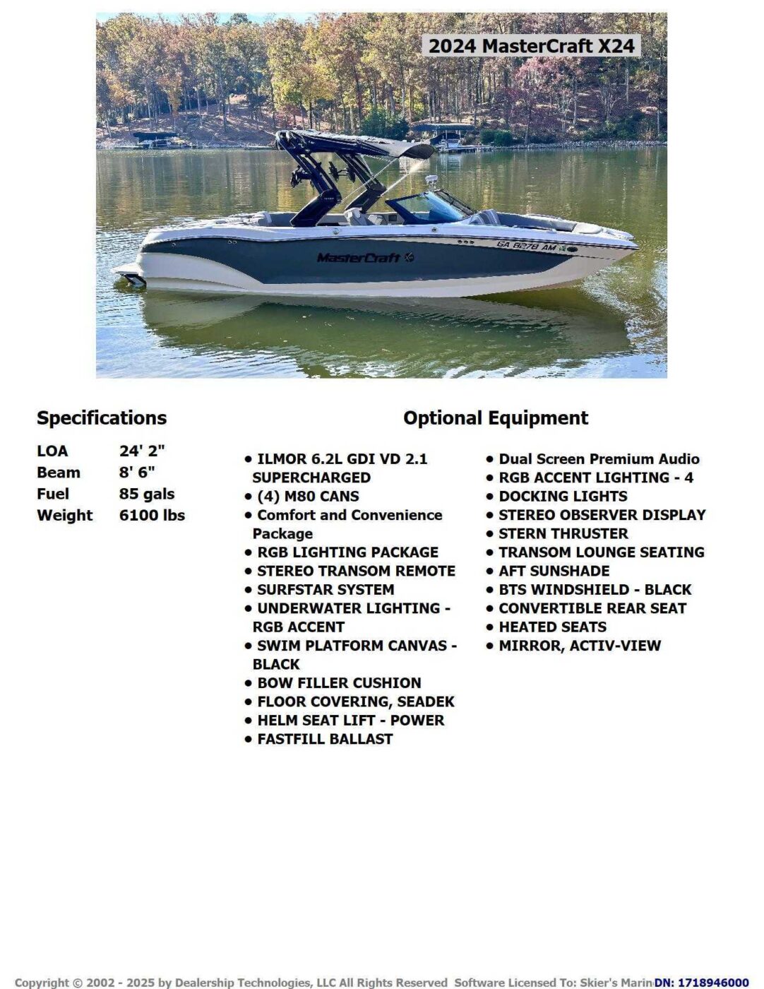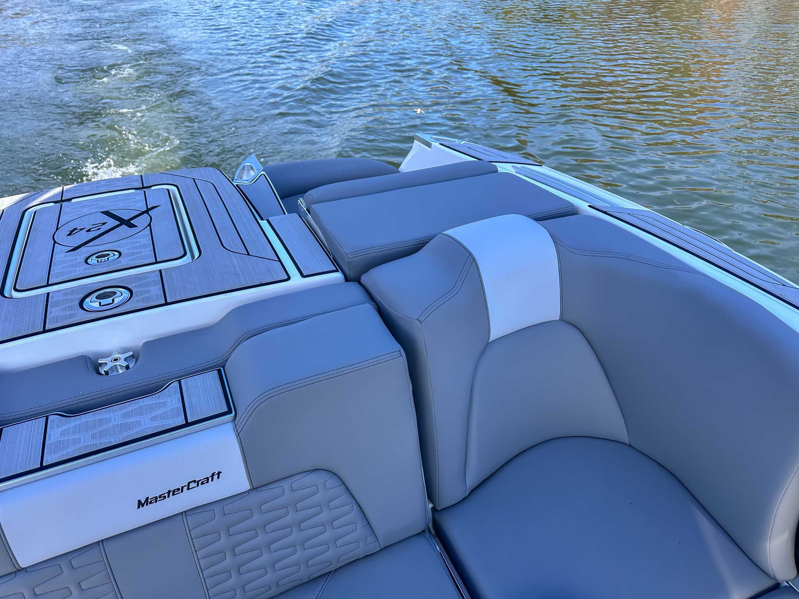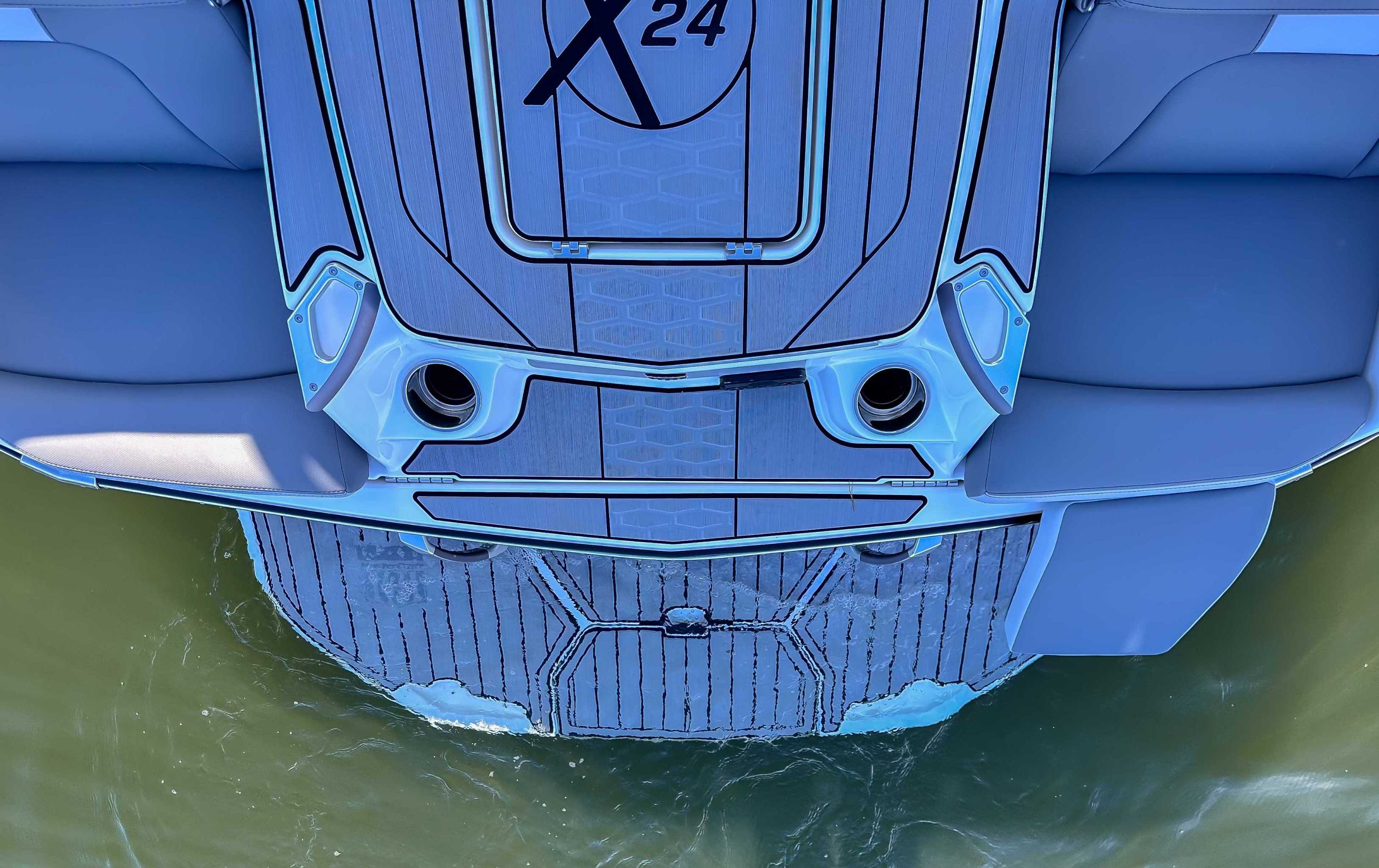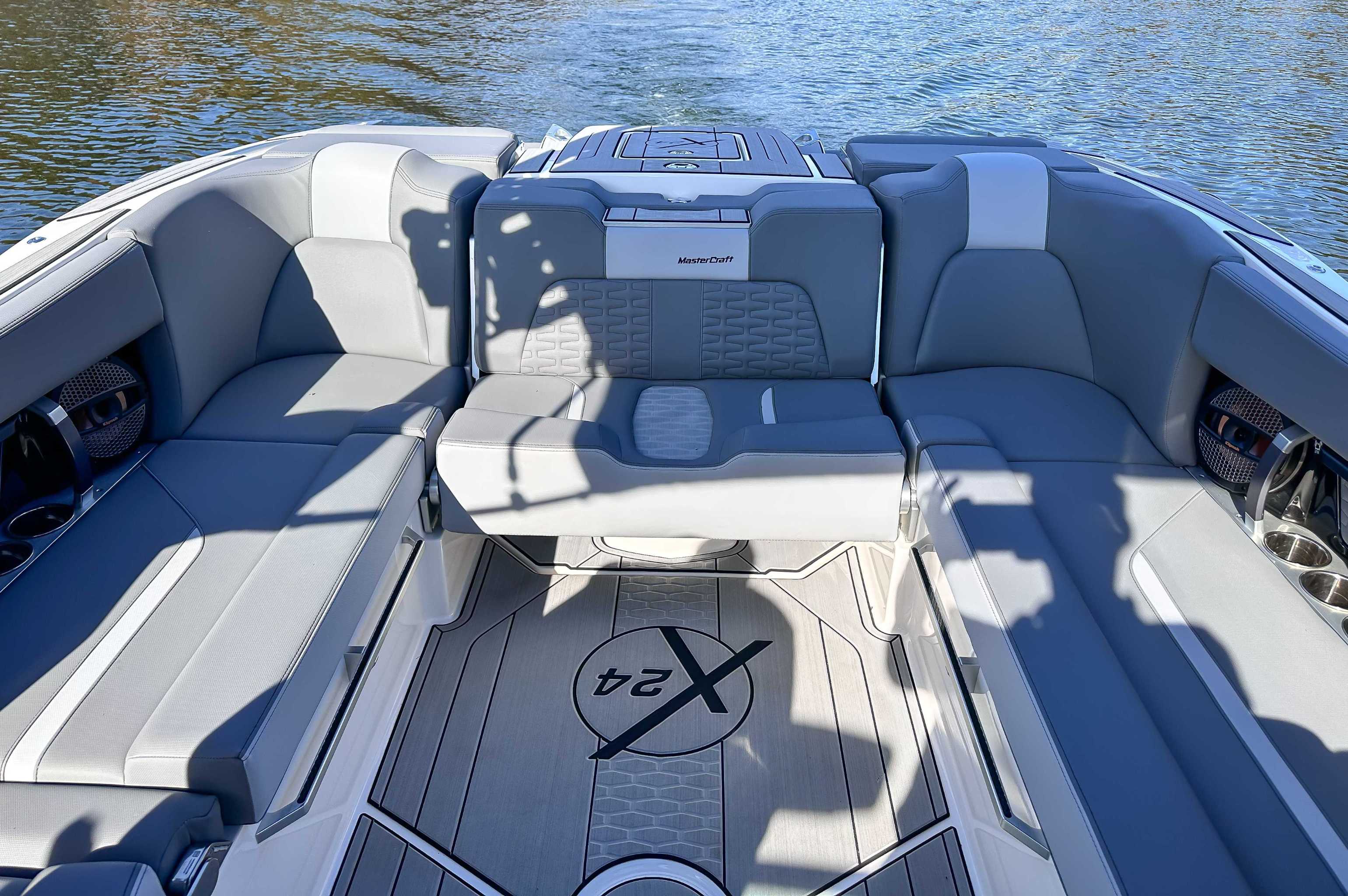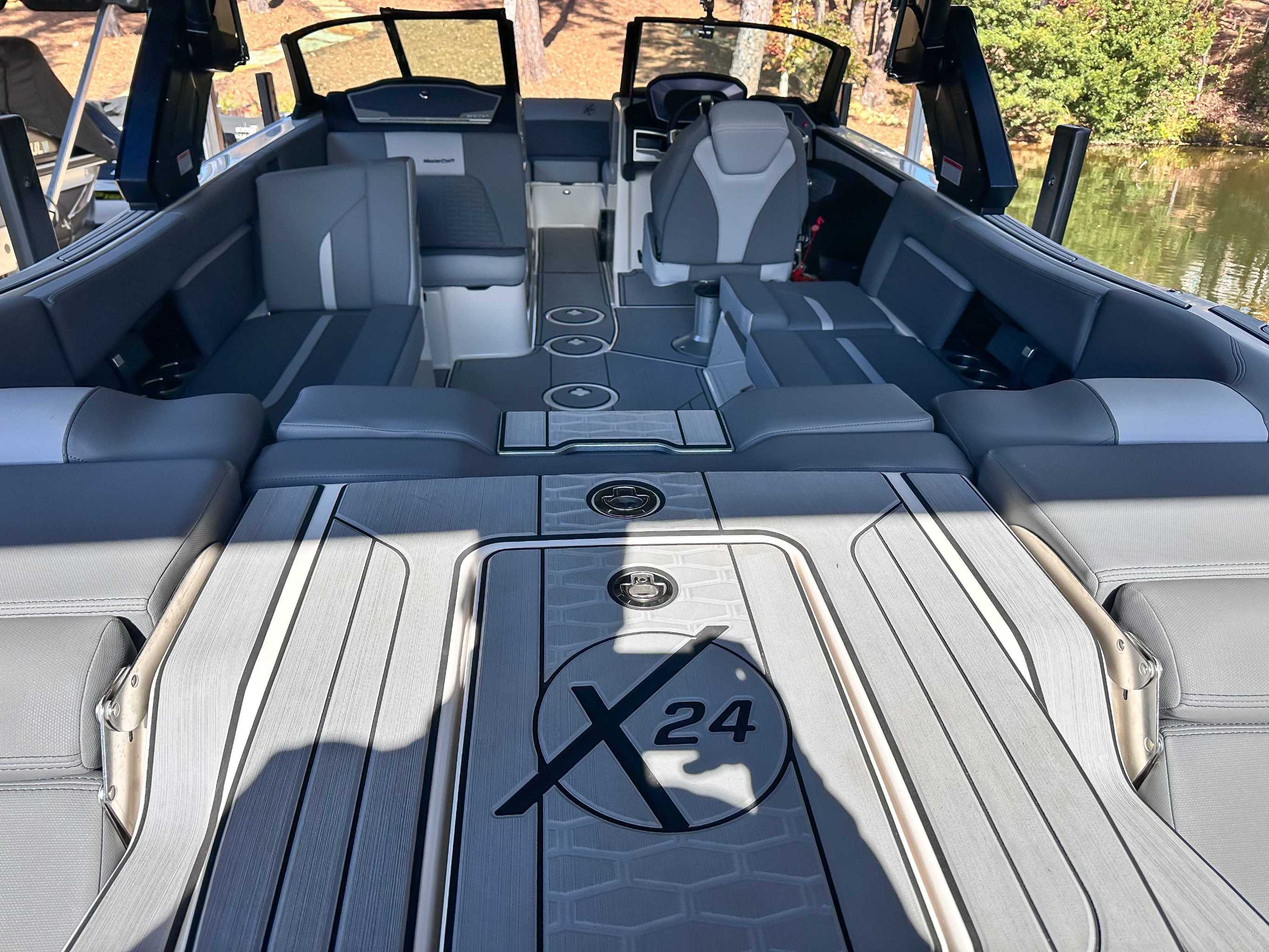 The 2024 MasterCraft X24 is a 24-foot luxury towboat designed for world-class wakesurfing and wakeboarding. It features a redesigned hull, the SurfStar system with 4,300 lbs of ballast, and an available Ilmor Supercharged 6.2L engine (up to 630hp) for powerful, customizable performance. The interior is plush, seating 18 people with CoolFeel vinyl, dual digital displays, Klipsch audio, and an optional stern thruster for effortless handling.
