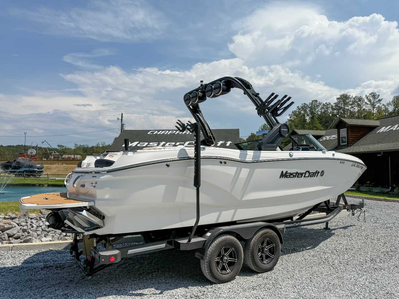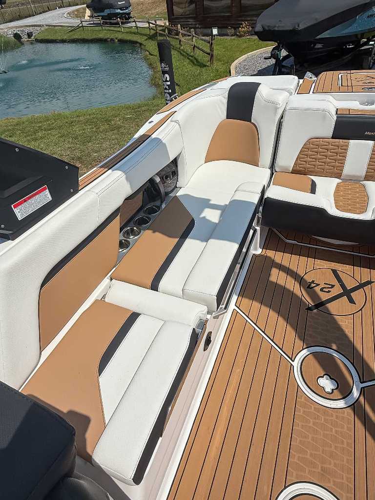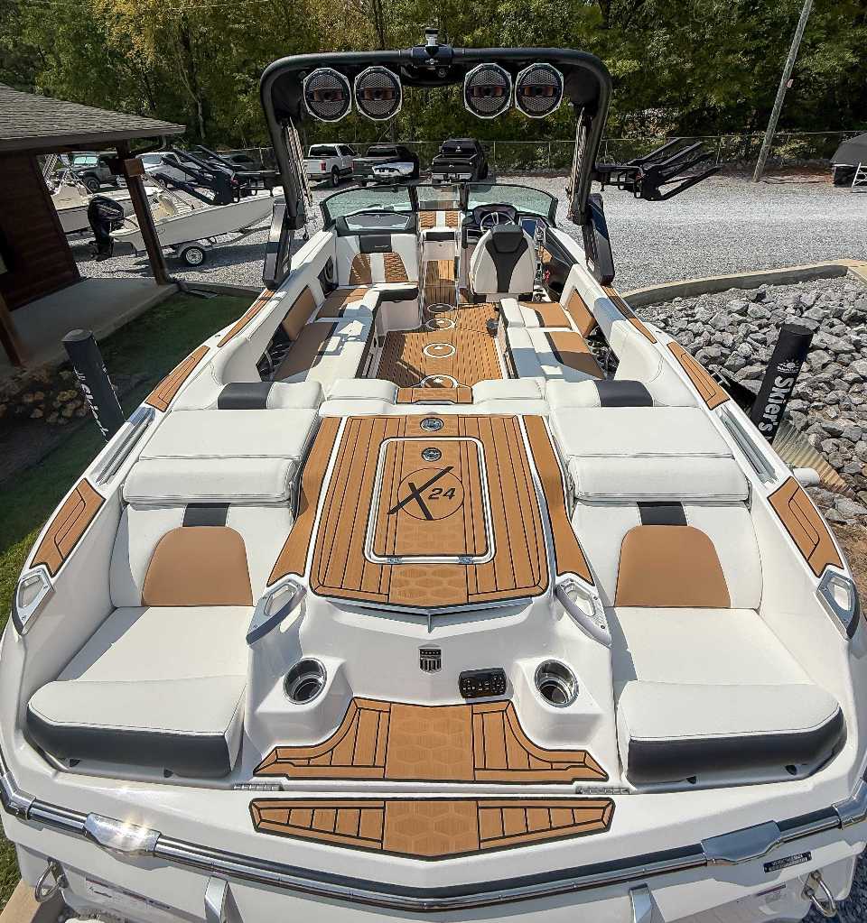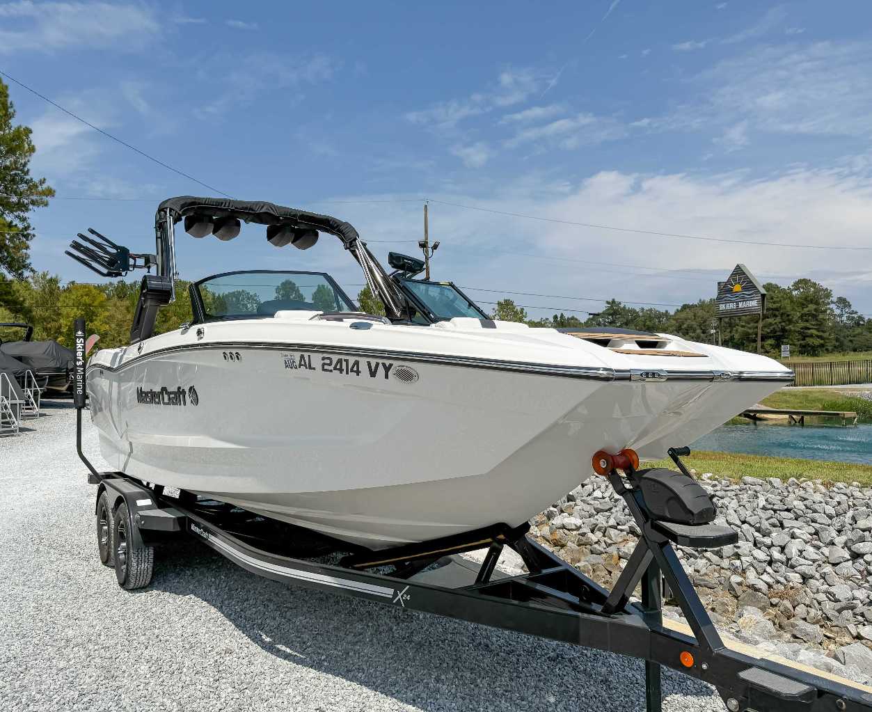 The 2024 MasterCraft X24 is a 24-foot luxury towboat designed for world-class wakesurfing and wakeboarding. It features a redesigned hull, the SurfStar system with 4,300 lbs of ballast, and an available Ilmor Supercharged 6.2L engine (up to 630hp) for powerful, customizable performance. The interior is plush, seating 18 people with CoolFeel vinyl, dual digital displays, Klipsch audio, and an optional stern thruster for effortless handling.