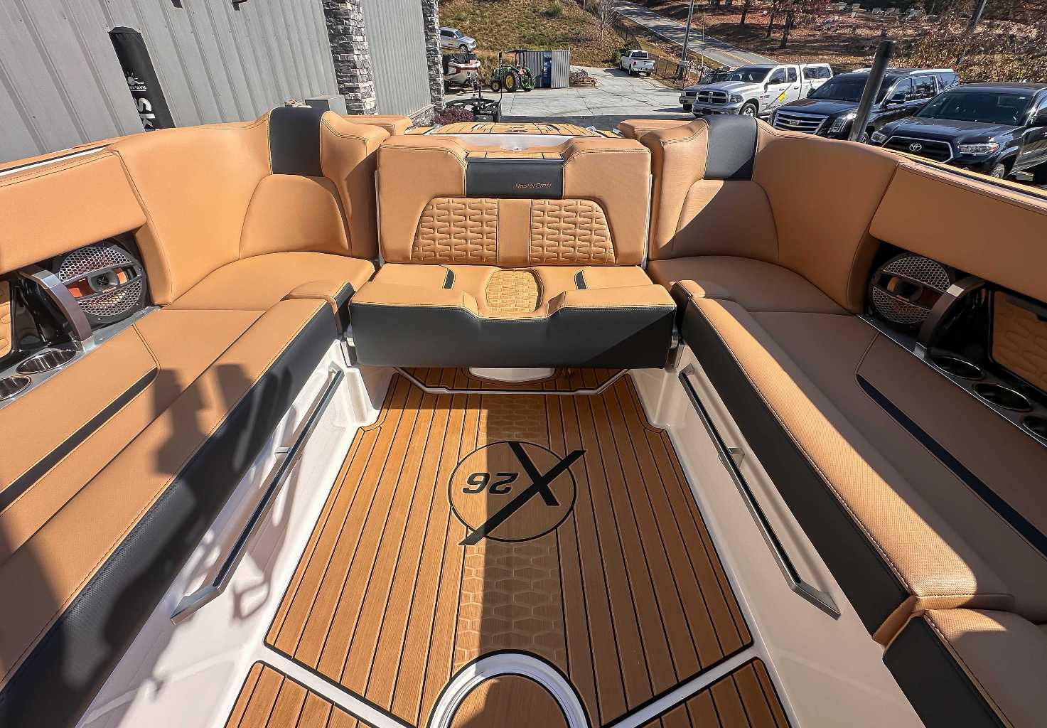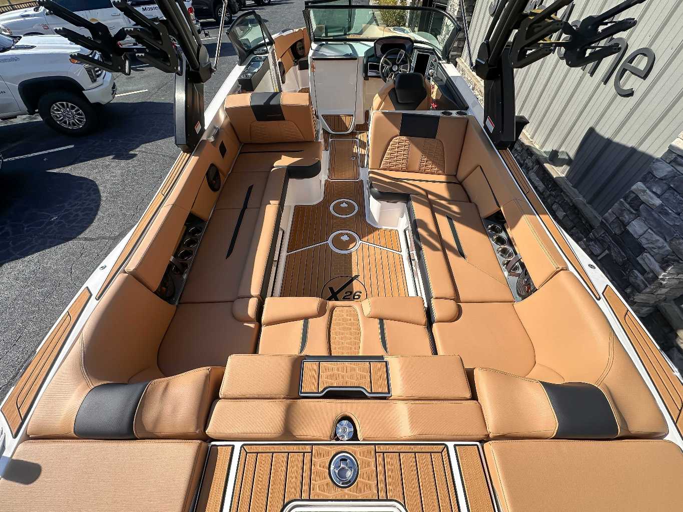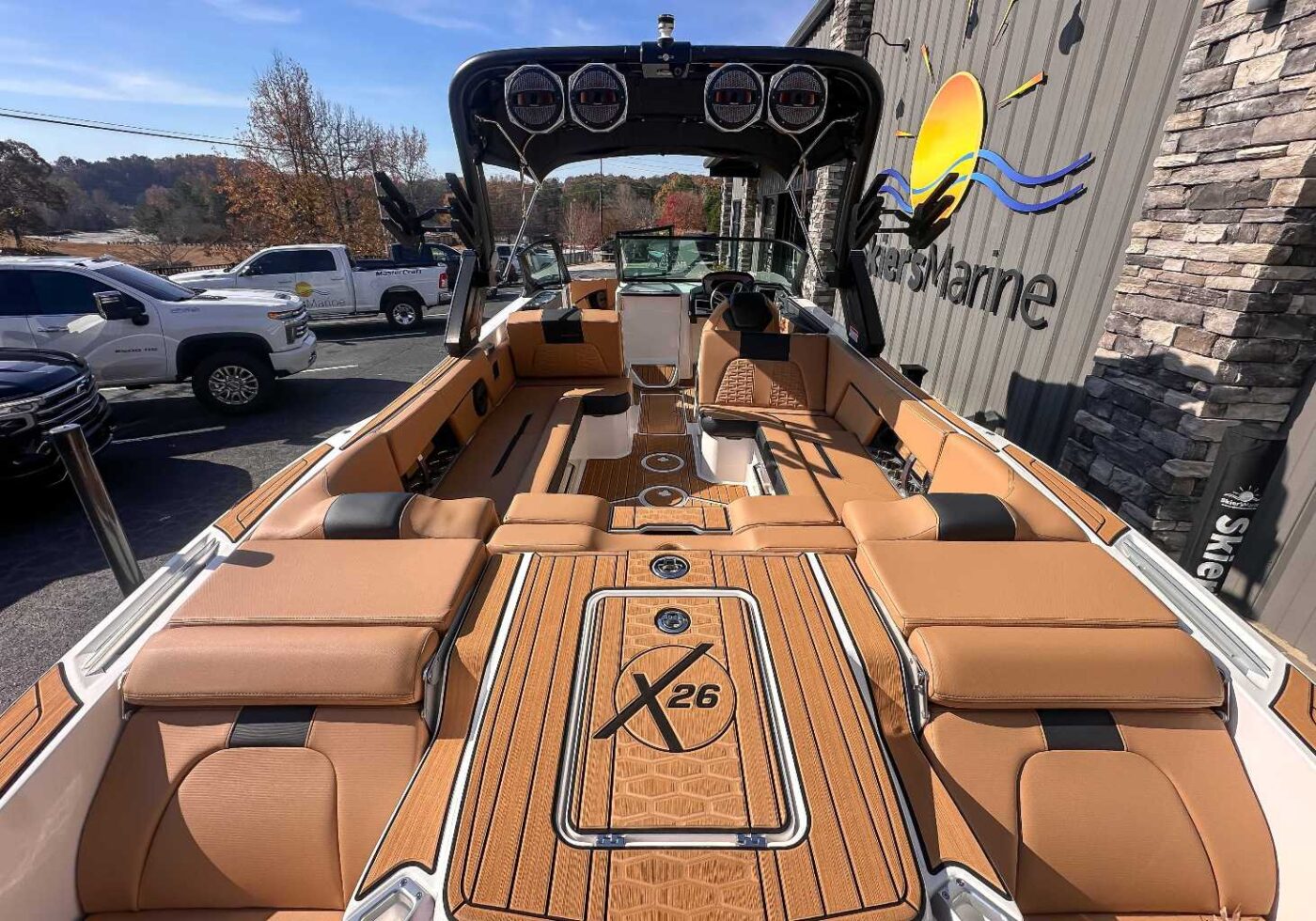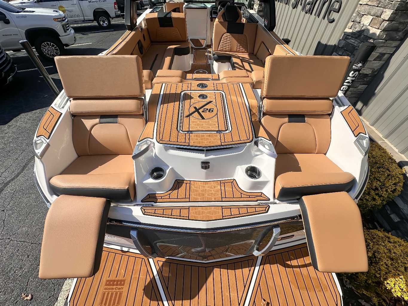 he 2024 MasterCraft X26 is a 26-foot, yacht-certified luxury towboat for those who demand the best. It boasts a massive 18-person capacity and delivers world-class wakes and waves with the SurfStar system. It features premium amenities like an optional head, refrigerator, and stern thruster, all wrapped in a classy, commanding style with a deep-V hull.