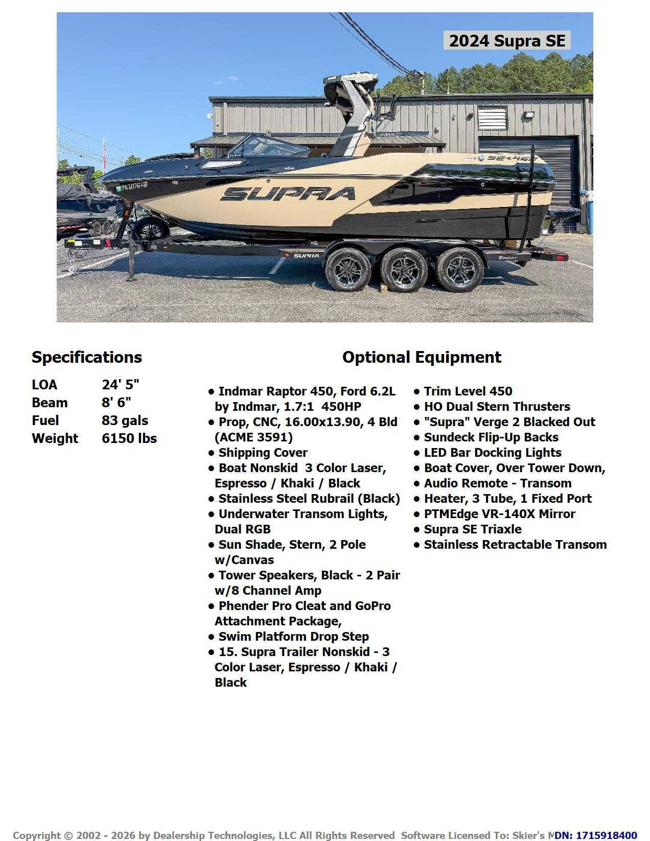 The 2024 Supra SE 450 is a premier flagship boat that combines massive scale with elite performance. Its 24.5-foot hull accommodates 18 people, while the Indmar Raptor 450 engine and 4,700 lbs of ballast deliver massive, pro-level wakes. Featuring AutoWake technology for automatic hull leveling and luxury perks like Chill Tech vinyl and a 22-speaker audio system, its the ultimate choice for large groups who refuse to compromise on wave quality or comfort.