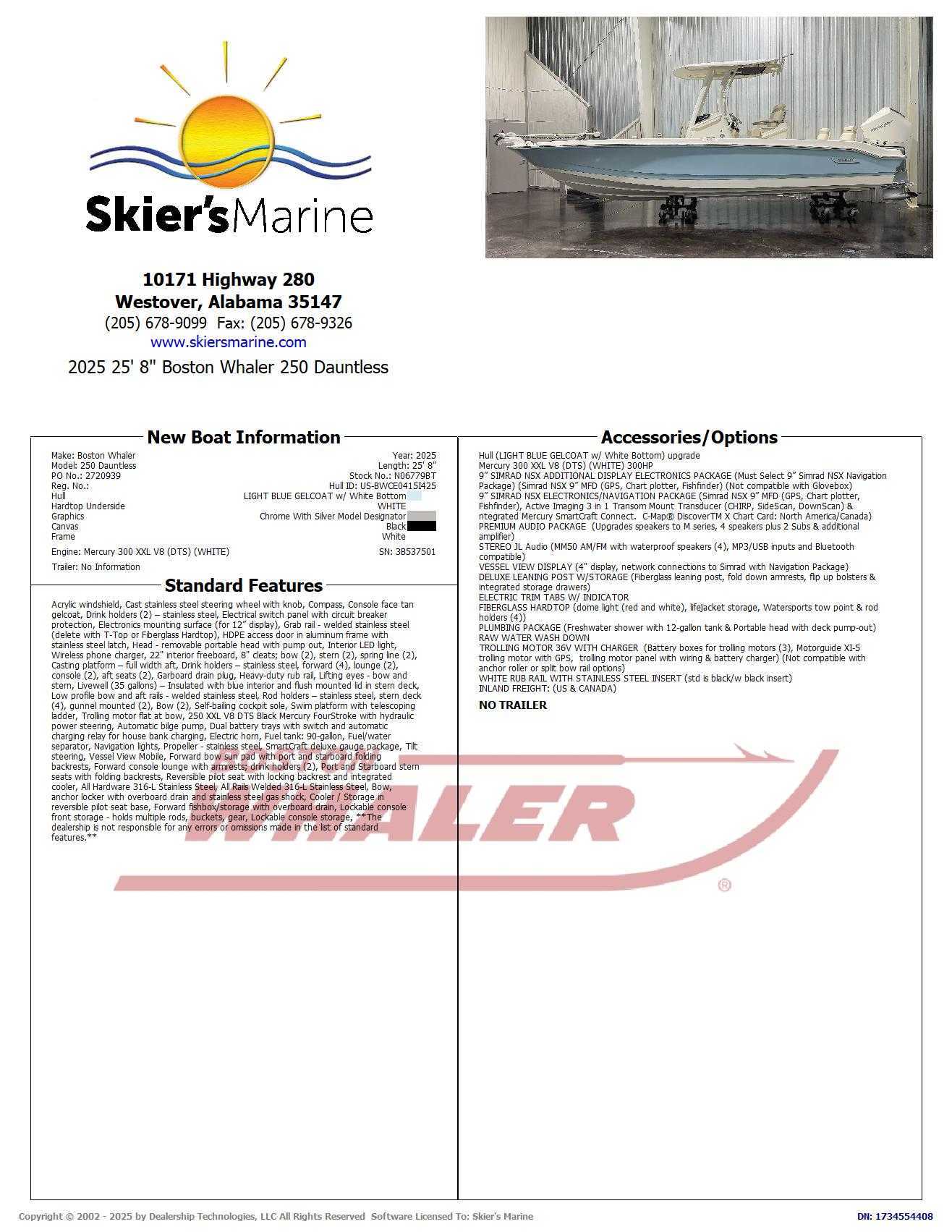 Skier's Marine is an award-winning ski boat, pontoon boat, and runabout sport boat dealer for brands like MasterCraft, Supra, Moomba, Chaparral, Harris, Premier, and Boston Whaler. We are not responsible for any pricing, options, specifications, or other listing errors on our site. Please contact us to confirm all details.