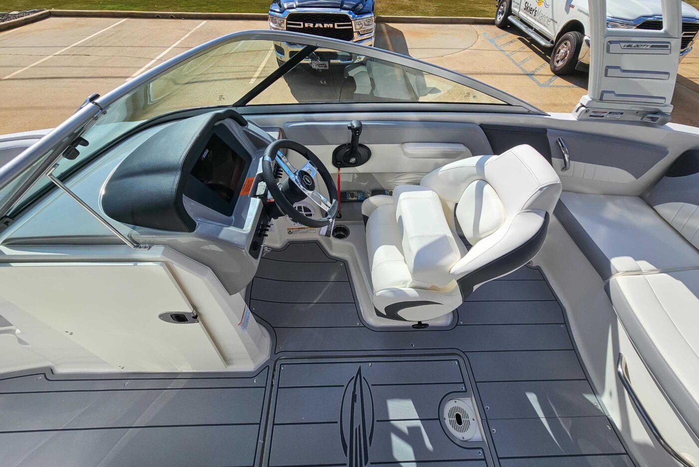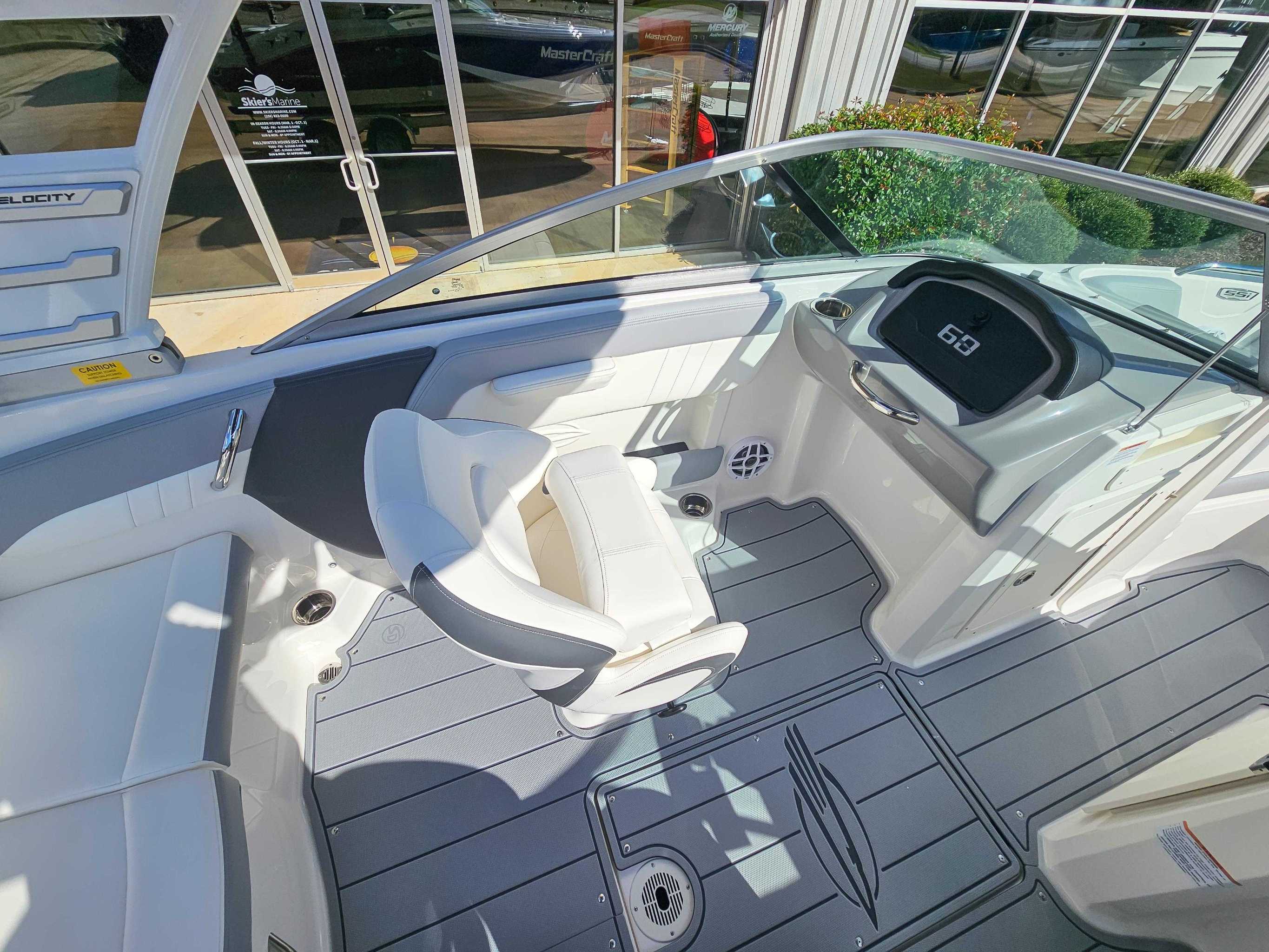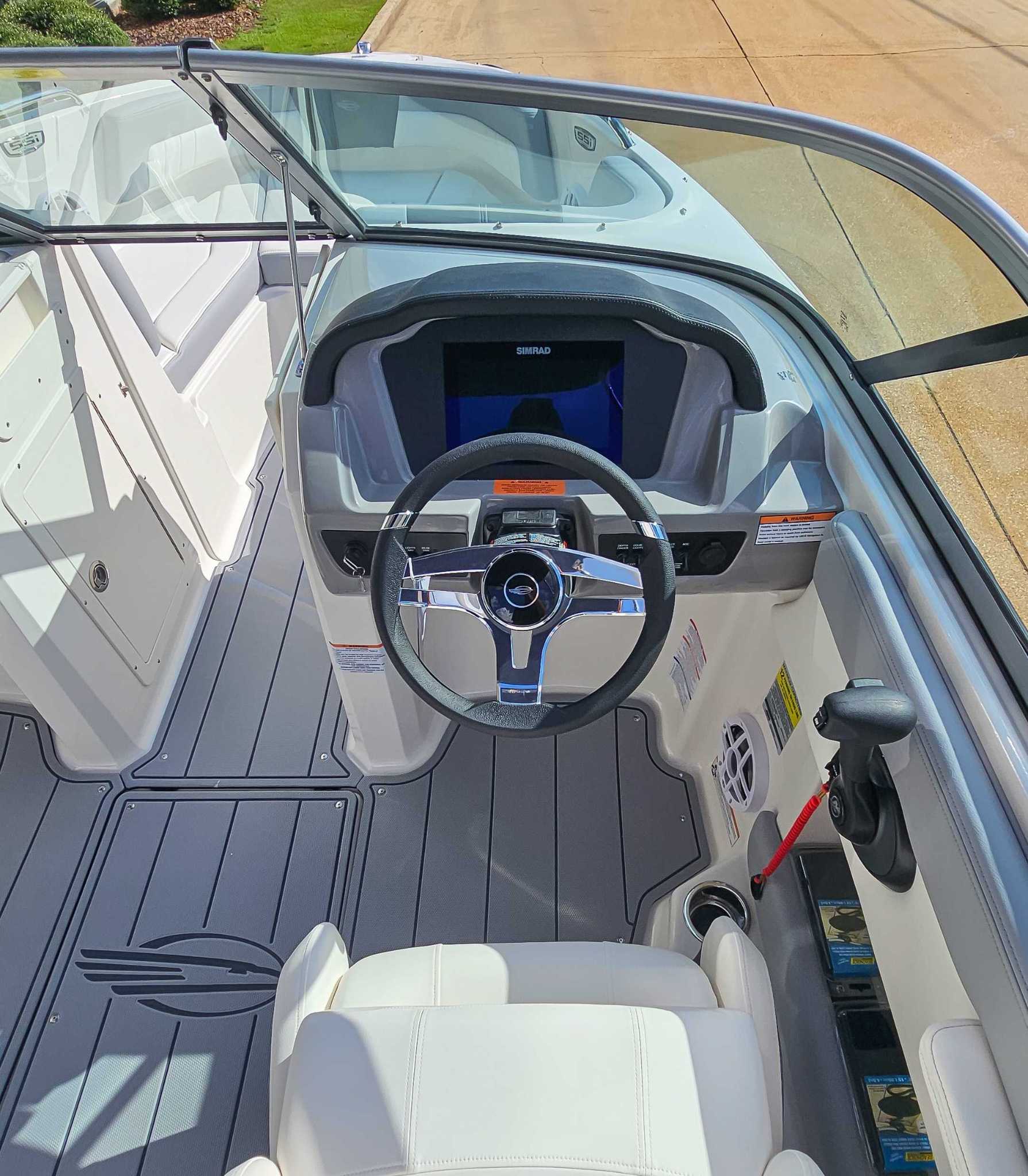 • Deluxe Package Includes: Digital Depth Gauge, Bimini Top with Boot or Tower Top Canvas, Ultra Comfort Pedestal Seat with Flip Up Bolster for Helm & Passenger, Port Console Storage Door, Deluxe Badging