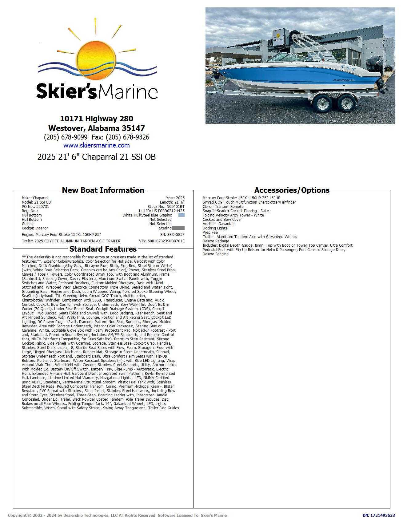 Skier's Marine is an award-winning ski boat, pontoon boat, and runabout sport boat dealer for brands like MasterCraft, Supra, Moomba, Chaparral, Harris, Premier, and Boston Whaler. We are not responsible for any pricing, options, specifications, or other listing errors on our site. Please contact us to confirm all details.