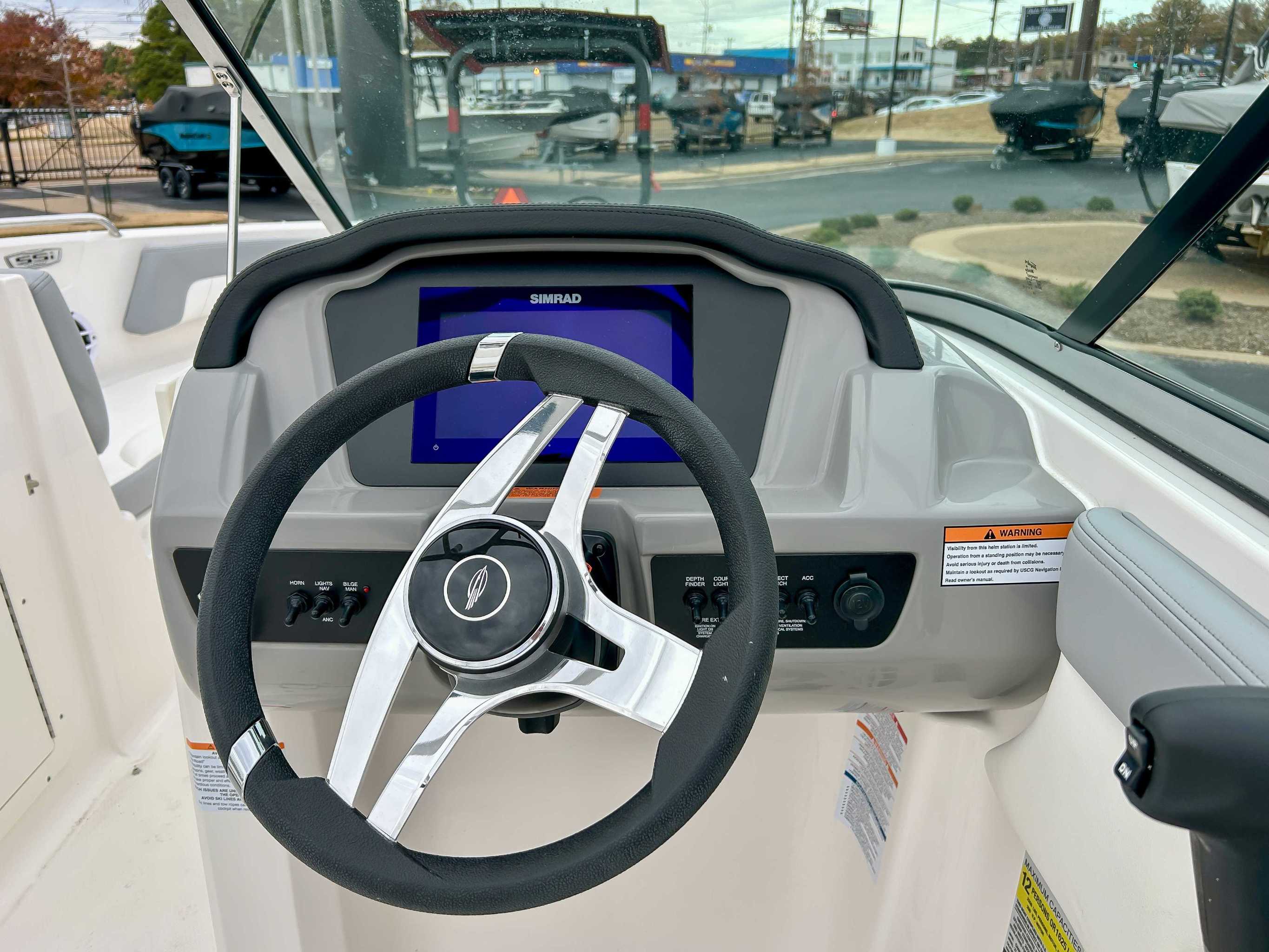 Deluxe Package Includes: Digital Depth Gauge, Bimini Top with Boot or Tower Top Canvas, Ultra Comfort Pedestal Seat with Flip Up Bolster for Helm & Passenger, Port Console Storage Door, Deluxe Badging