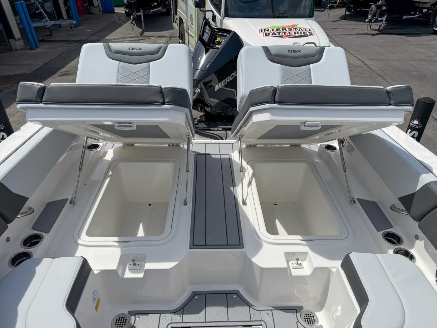 Bow Passenger Seat Backrest Hinged to Access Large Storage Compartment – Starboard