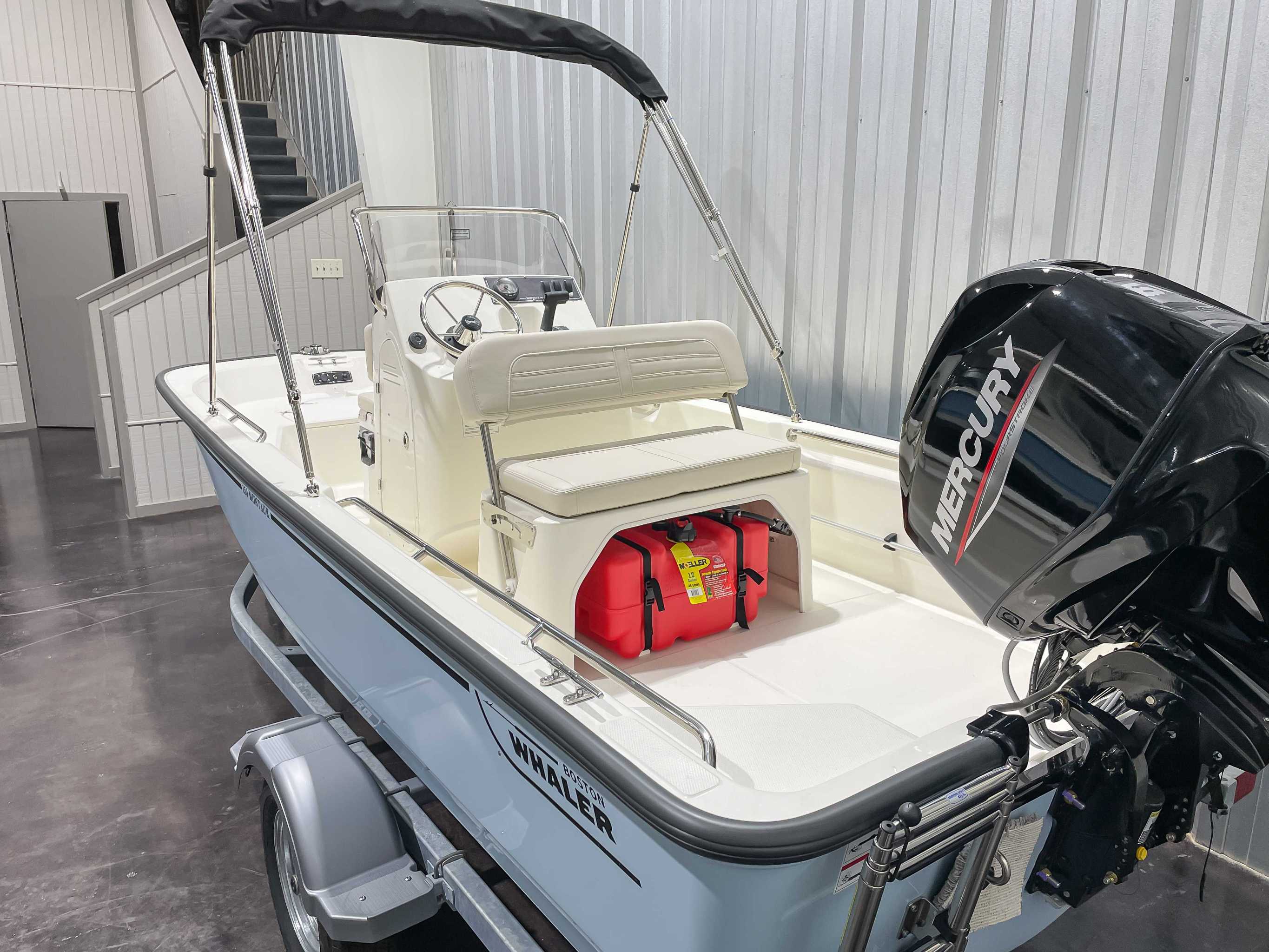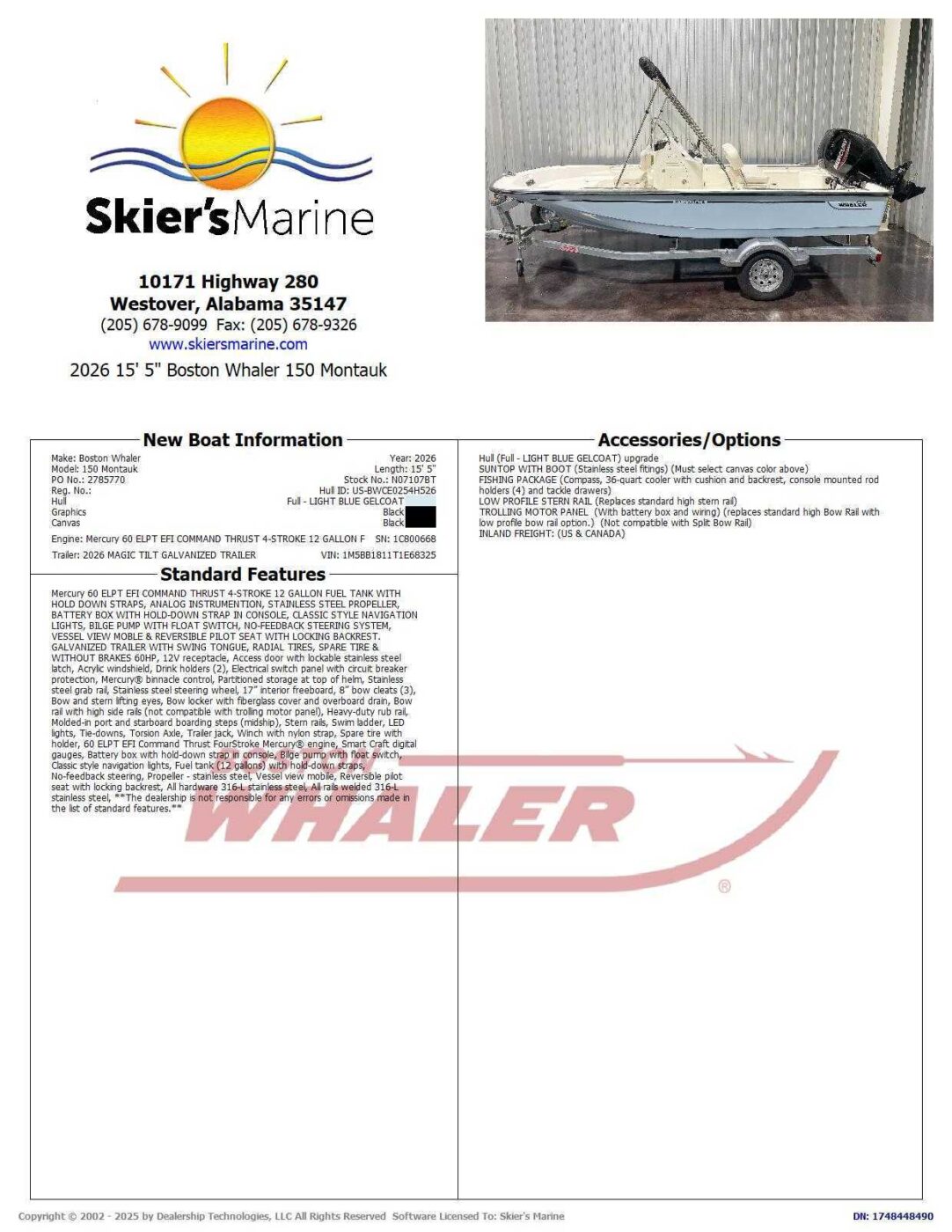 The 2026 Boston Whaler 150 Montauk blends heritage with modern tech. Its unsinkable hull and 60-HP Mercury engine offer reliability for fishing or cruising. The 2026 model features a sleek center console, an integrated fuel tank, and a spacious layout. It is durable, easy to tow, and holds value.