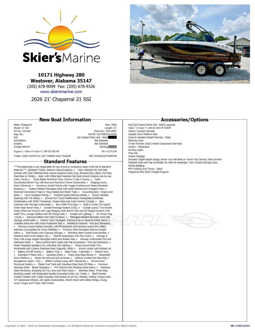 Skier's Marine is an award-winning ski boat, pontoon boat, and runabout sport boat dealer for brands like MasterCraft, Supra, Moomba, Chaparral, Harris, Premier, and Boston Whaler. We are not responsible for any pricing, options, specifications, or other listing errors on our site. Please contact us to confirm all details.