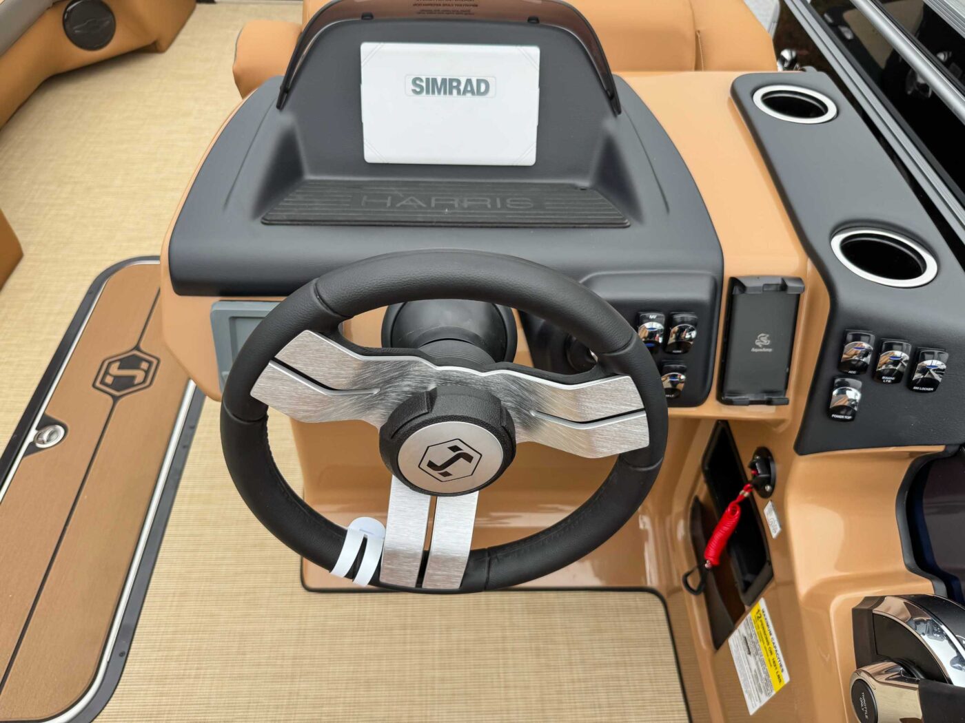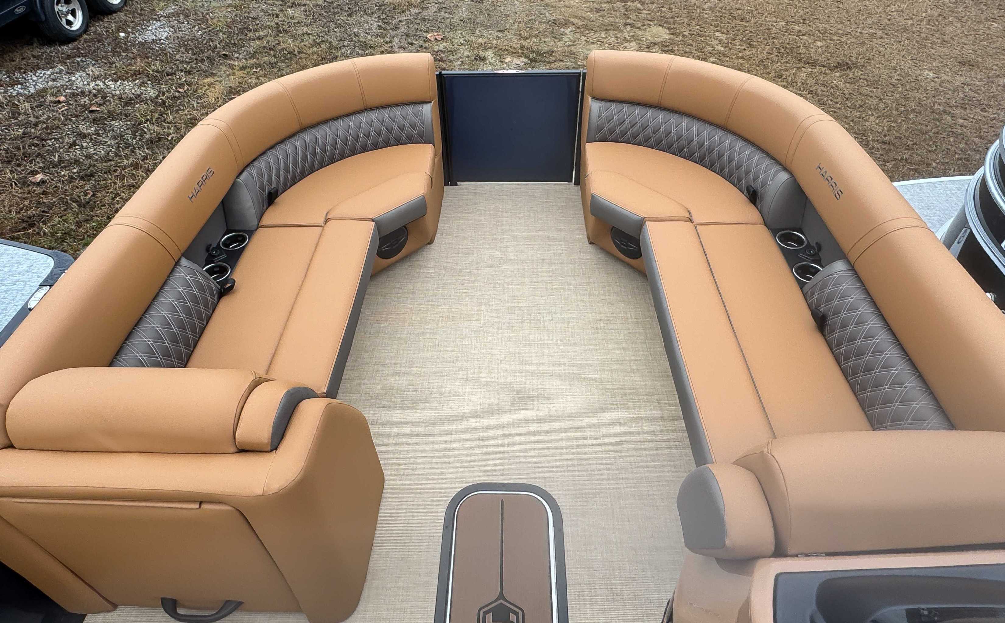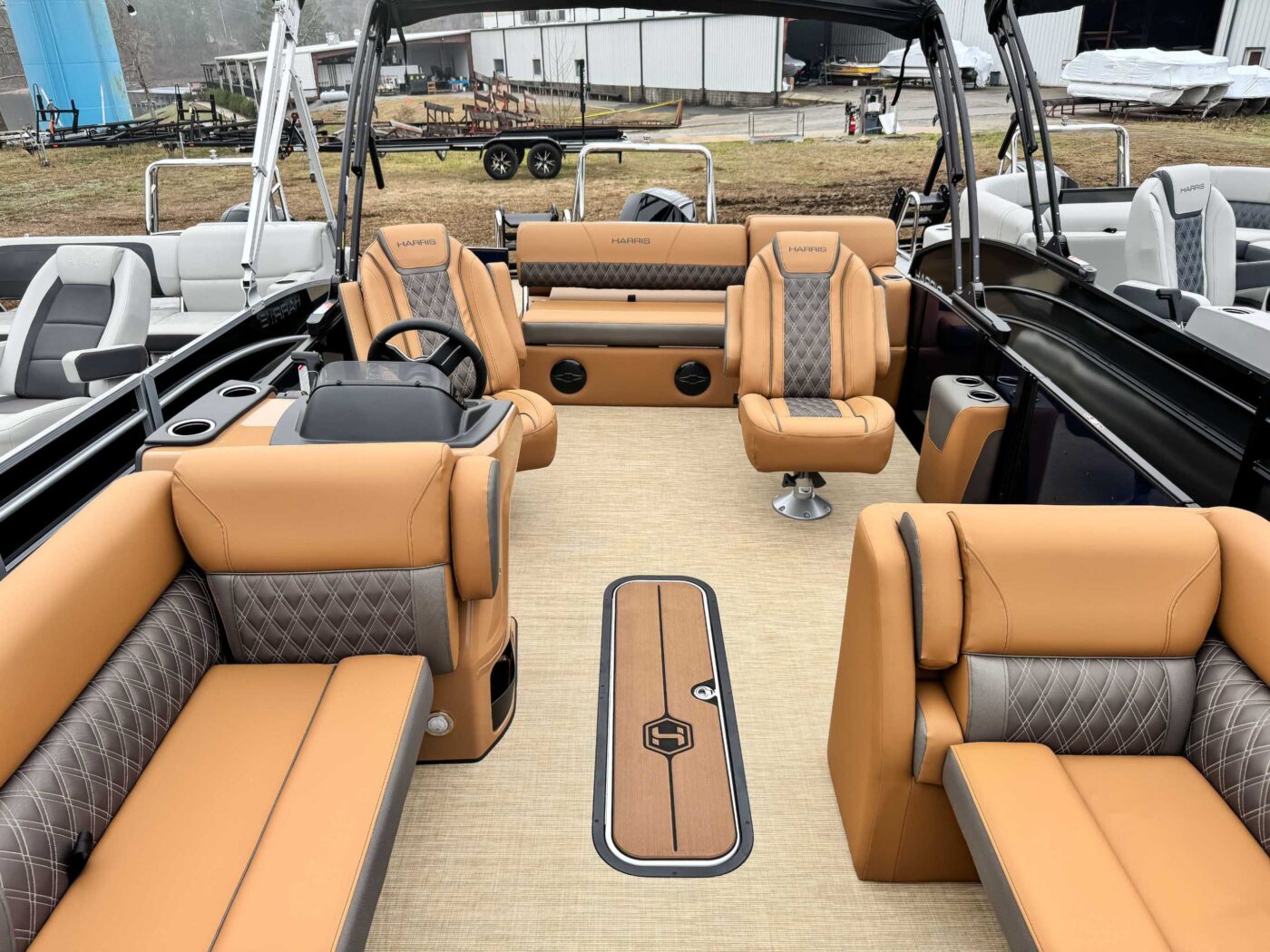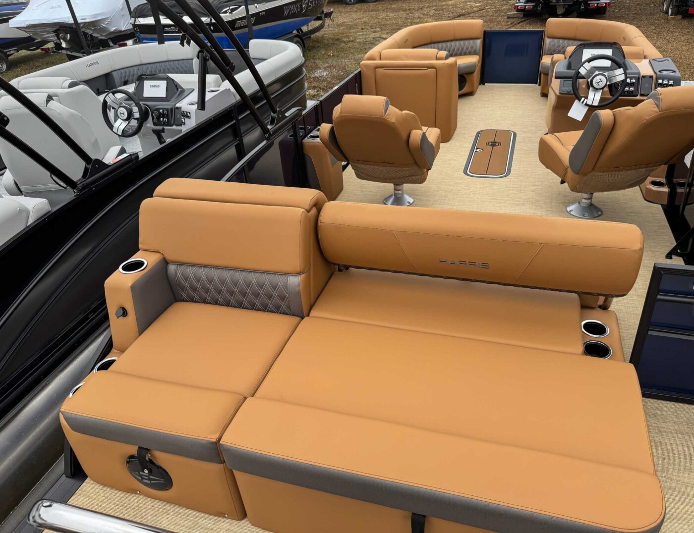 The 2026 Harris Cruiser pontoon is ideal for families and adventurers seeking a blend of performance, comfort, and durability. Key features include the signature RPM Technology chassis for a smooth, stable ride and better fuel efficiency, plush soft-touch seating, and versatile layouts like the single rear-facing lounger (SL) or dual helm (DH). Amenities such as a power Bimini top, integrated swim ladder, and available entertainment upgrades (Wetsounds audio, RGB lighting) elevate the experience. With rob