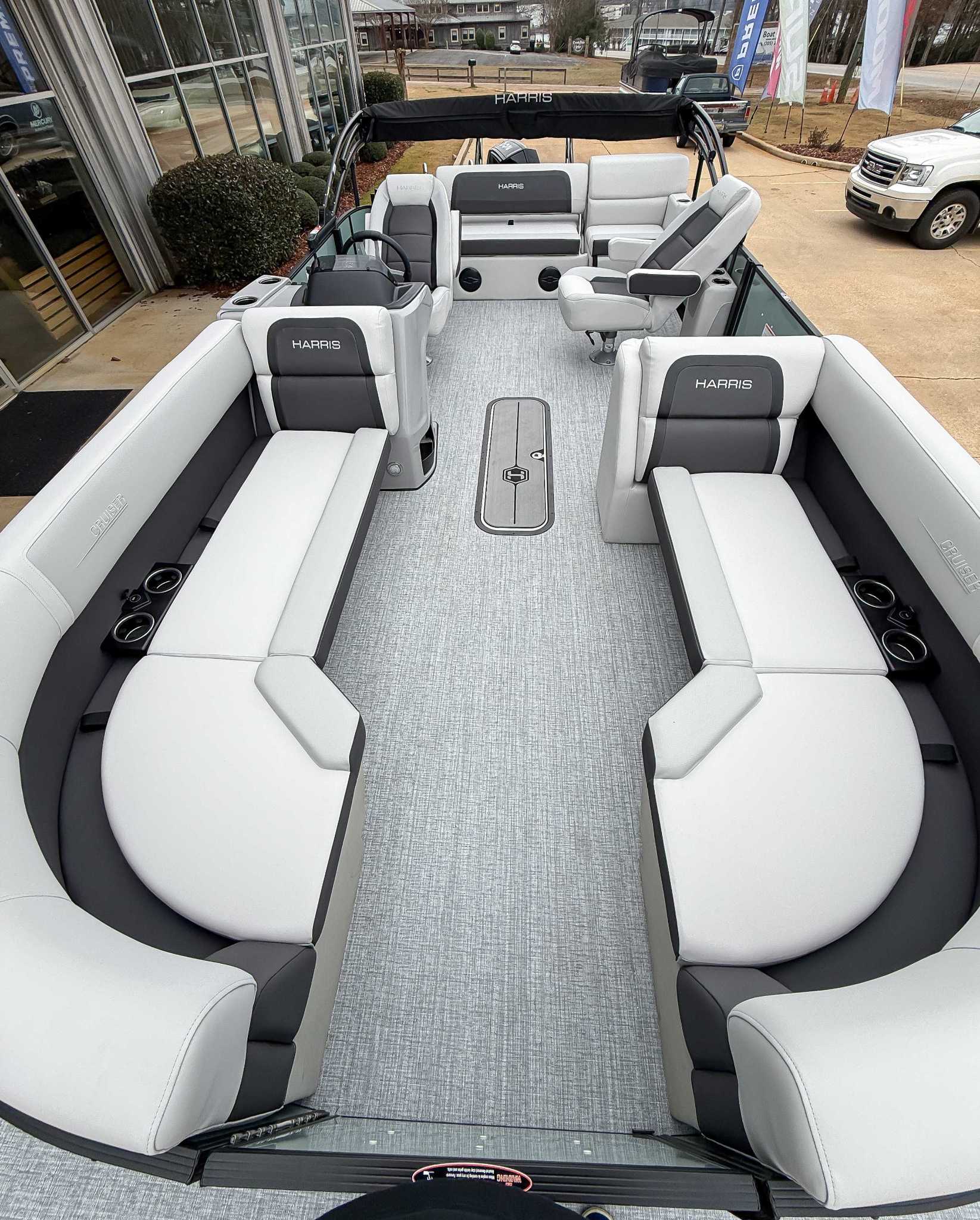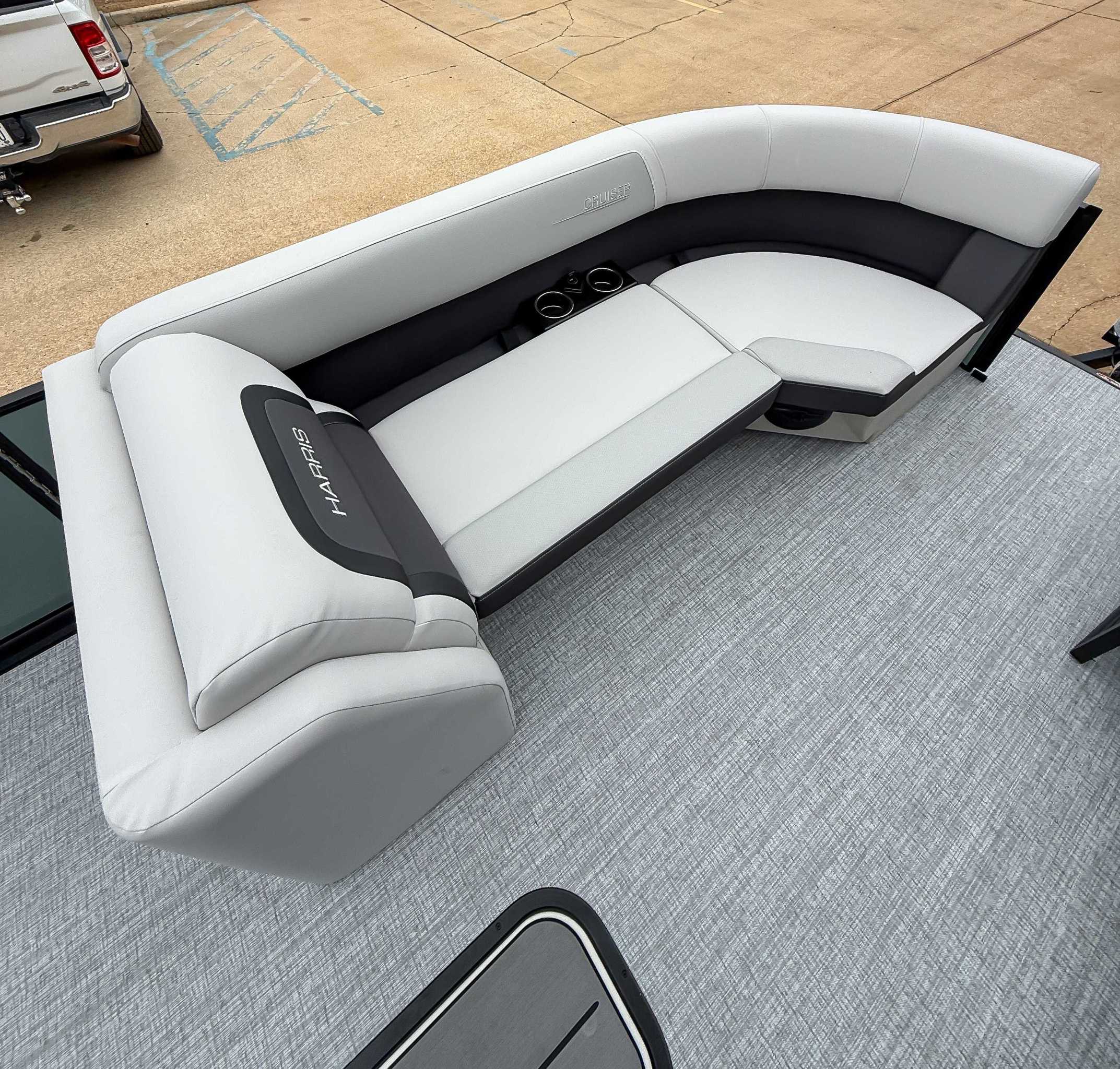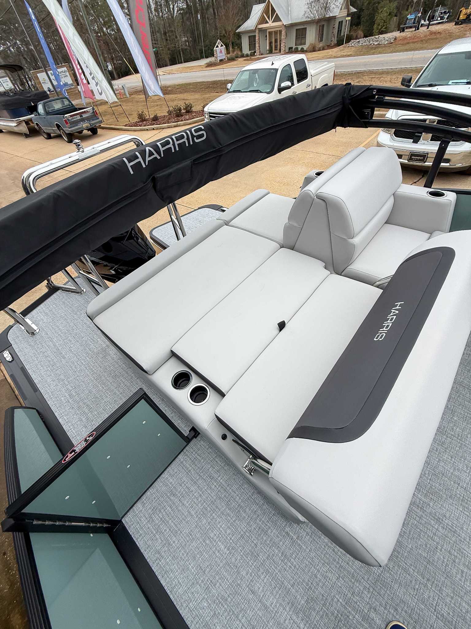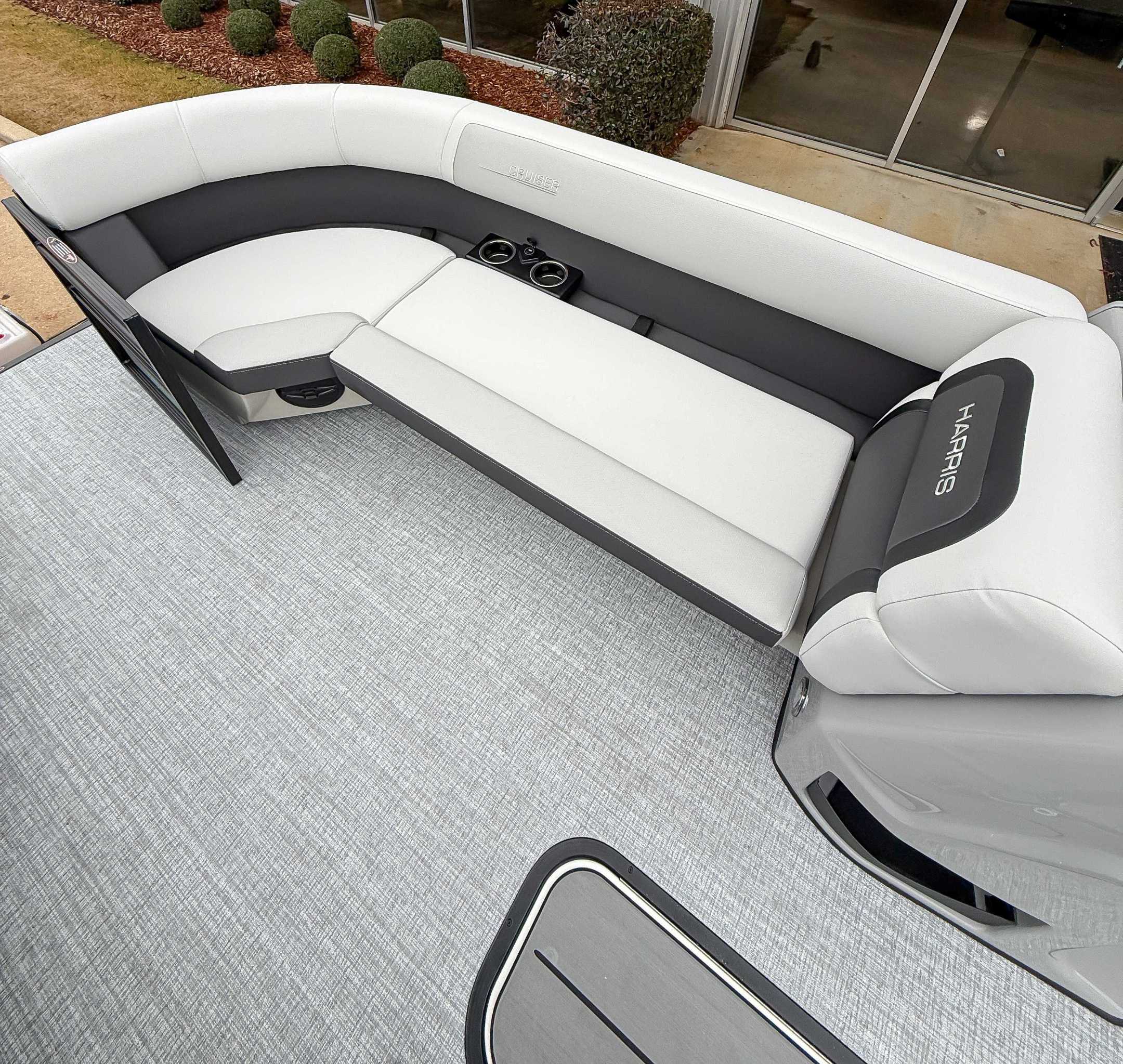 The 2026 Harris Cruiser pontoon is ideal for families and adventurers seeking a blend of performance, comfort, and durability. Key features include the signature RPM Technology chassis for a smooth, stable ride and better fuel efficiency, plush soft-touch seating, and versatile layouts like the single rear-facing lounger (SL) or dual helm (DH). Amenities such as a power Bimini top, integrated swim ladder, and available entertainment upgrades (Wetsounds audio, RGB lighting) elevate the experience. With rob