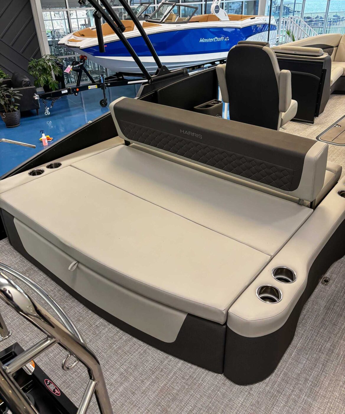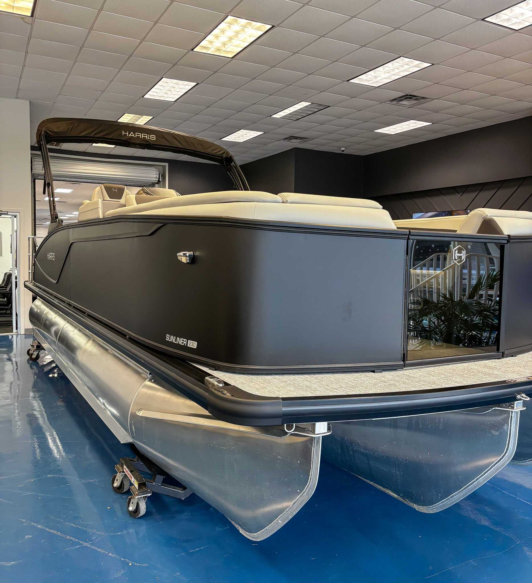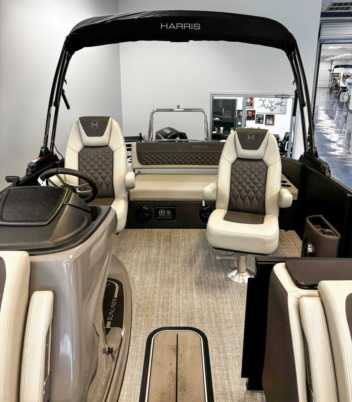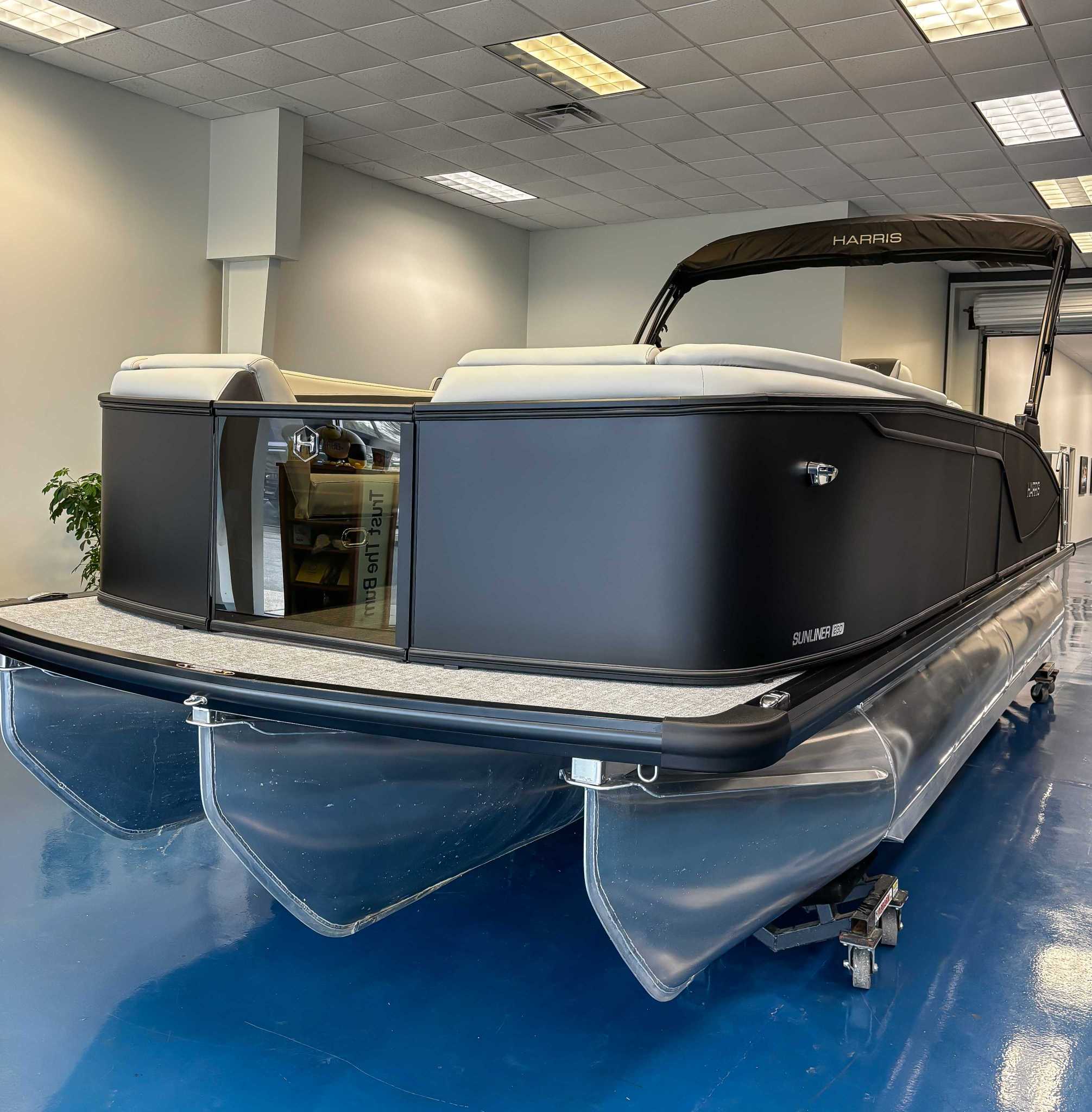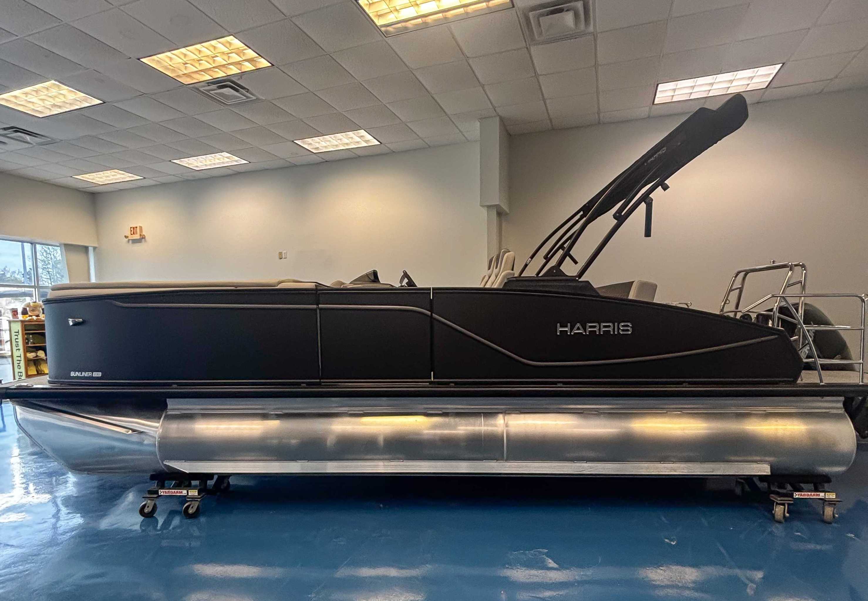 The 2026 Harris Sunliner 230 pontoon boat is an excellent choice due to its superior blend of versatility, comfort, and performance. It features innovative design elements like the proprietary RPM Chassis for a smoother, more stable ride and enhanced fuel efficiency. The boat boasts a completely redesigned interior with plush, durable, pillow-top vinyl upholstery and flexible seating, including multi-position loungers, to accommodate various activities from watersports to relaxed cruising.