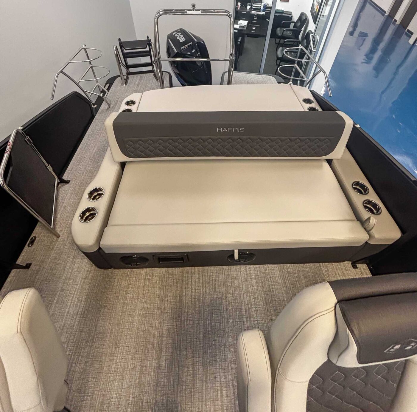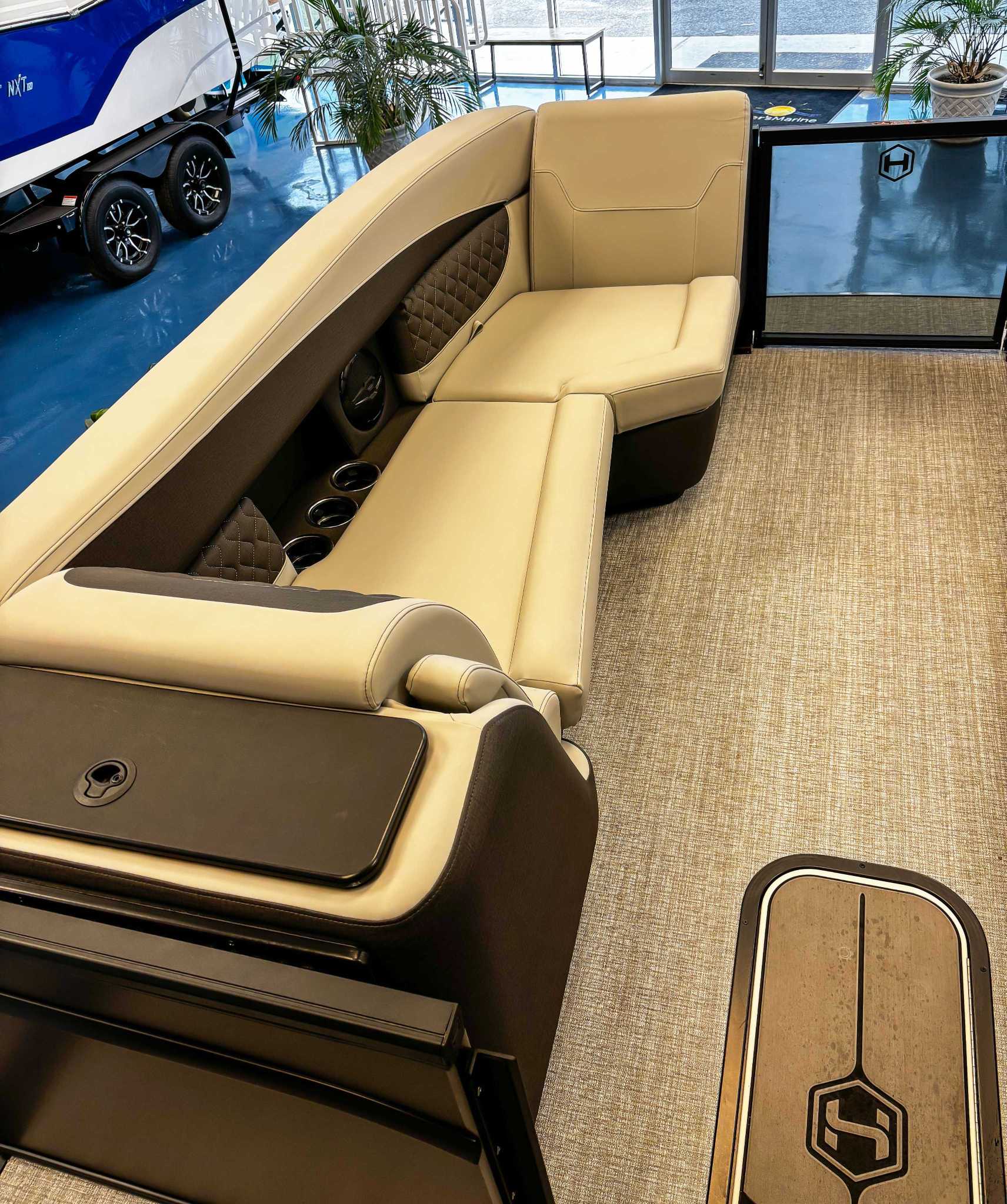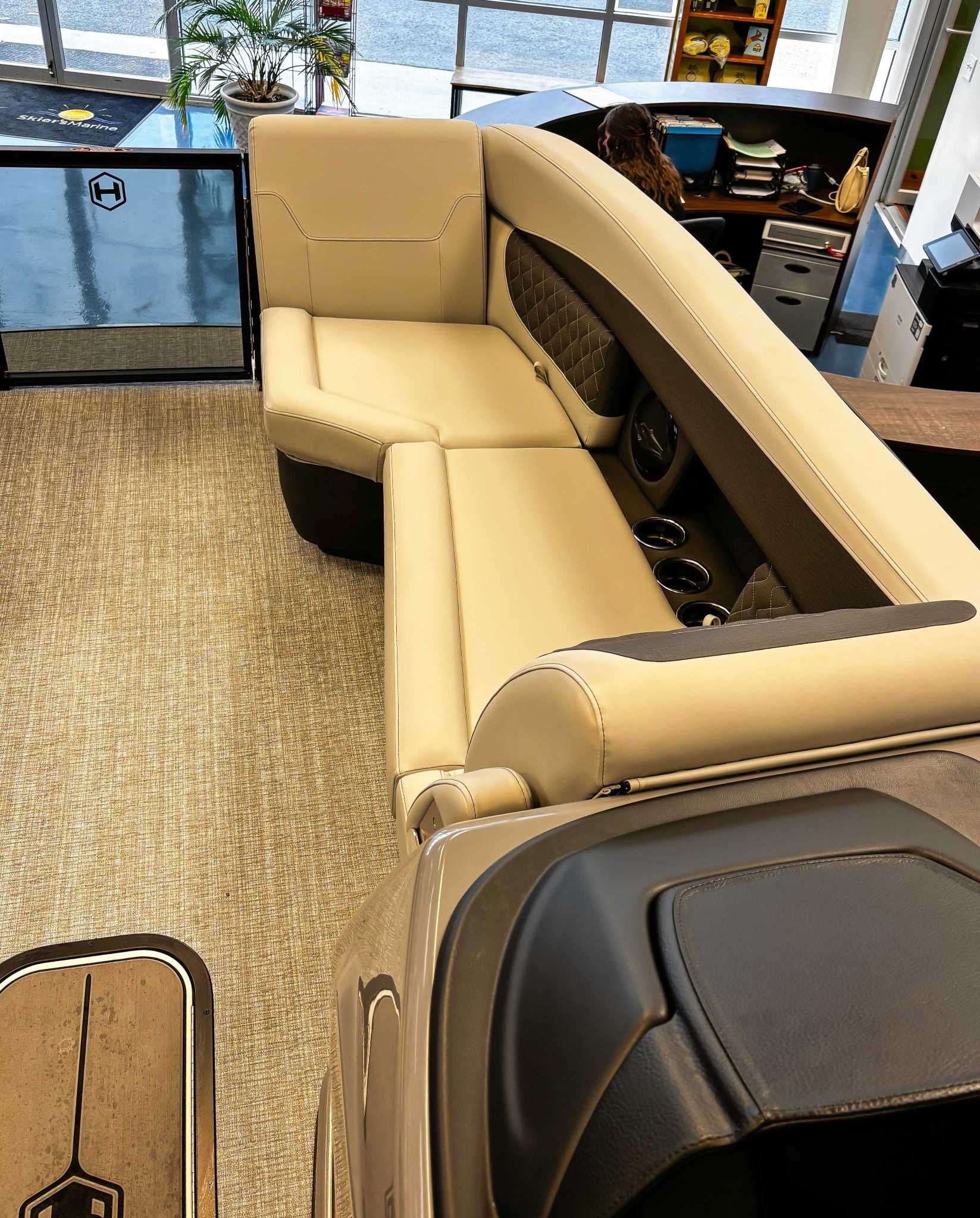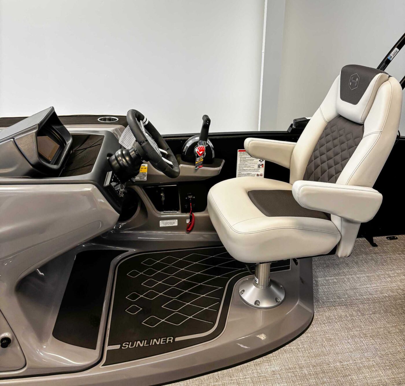 The 2026 Harris Sunliner 230 pontoon boat is an excellent choice due to its superior blend of versatility, comfort, and performance. It features innovative design elements like the proprietary RPM Chassis for a smoother, more stable ride and enhanced fuel efficiency. The boat boasts a completely redesigned interior with plush, durable, pillow-top vinyl upholstery and flexible seating, including multi-position loungers, to accommodate various activities from watersports to relaxed cruising.
