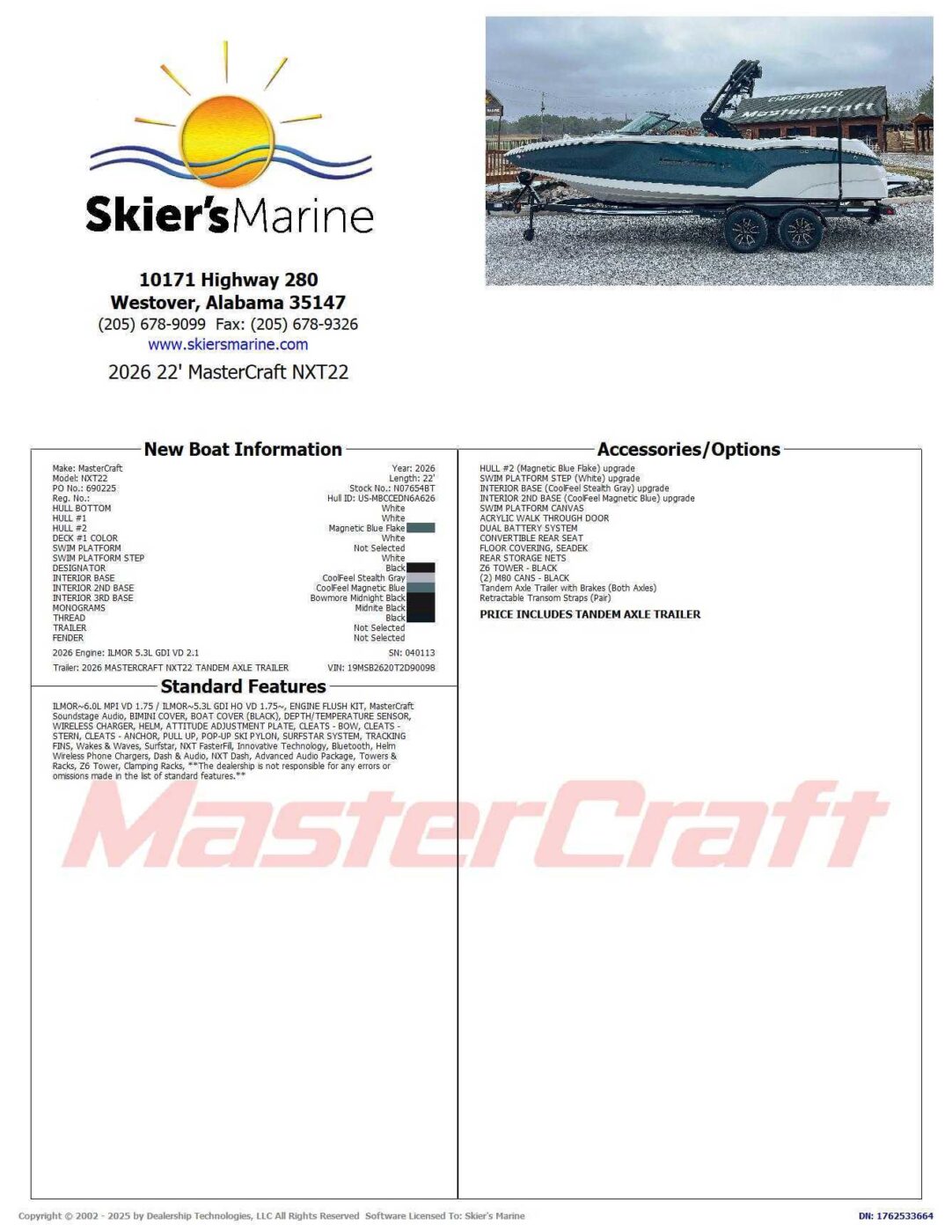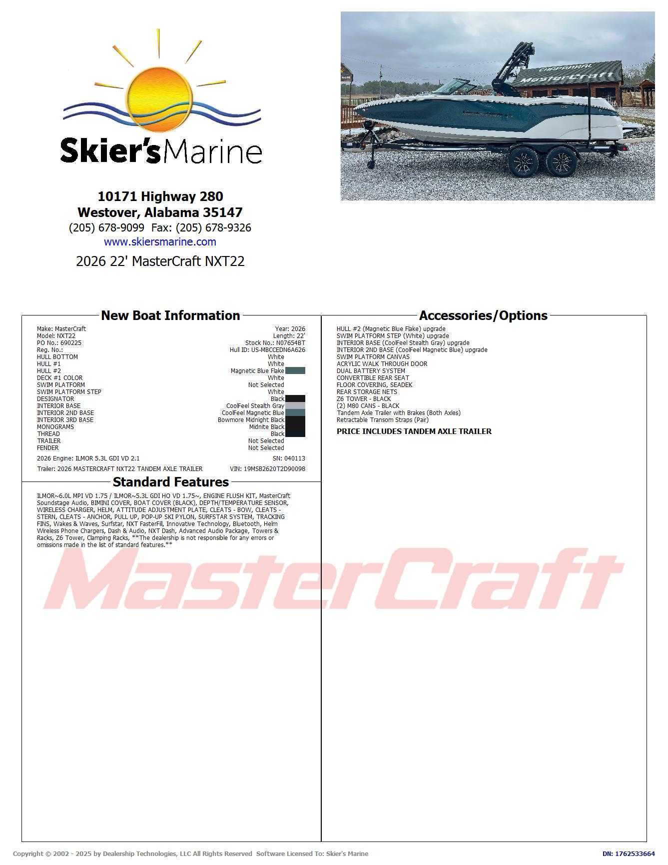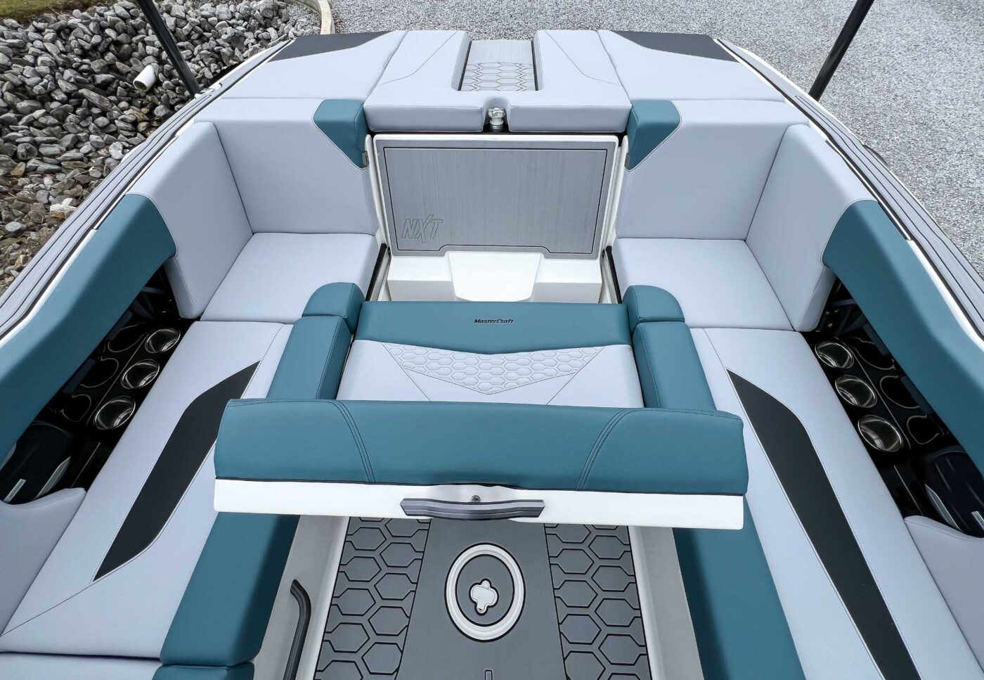 The 2026 MasterCraft NXT22 delivers premium performance and versatile fun in a perfectly sized 22-foot package. It features the SurfStar system for customizable wakes, a powerful Ilmor 5.3L GDI engine, and seating for up to 14 people. The interior boasts new styling, CoolFeel vinyl, a 7-inch touchscreen helm with wireless charging, and an all-new SoundStage audio system for an effortless and unforgettable day on the water.