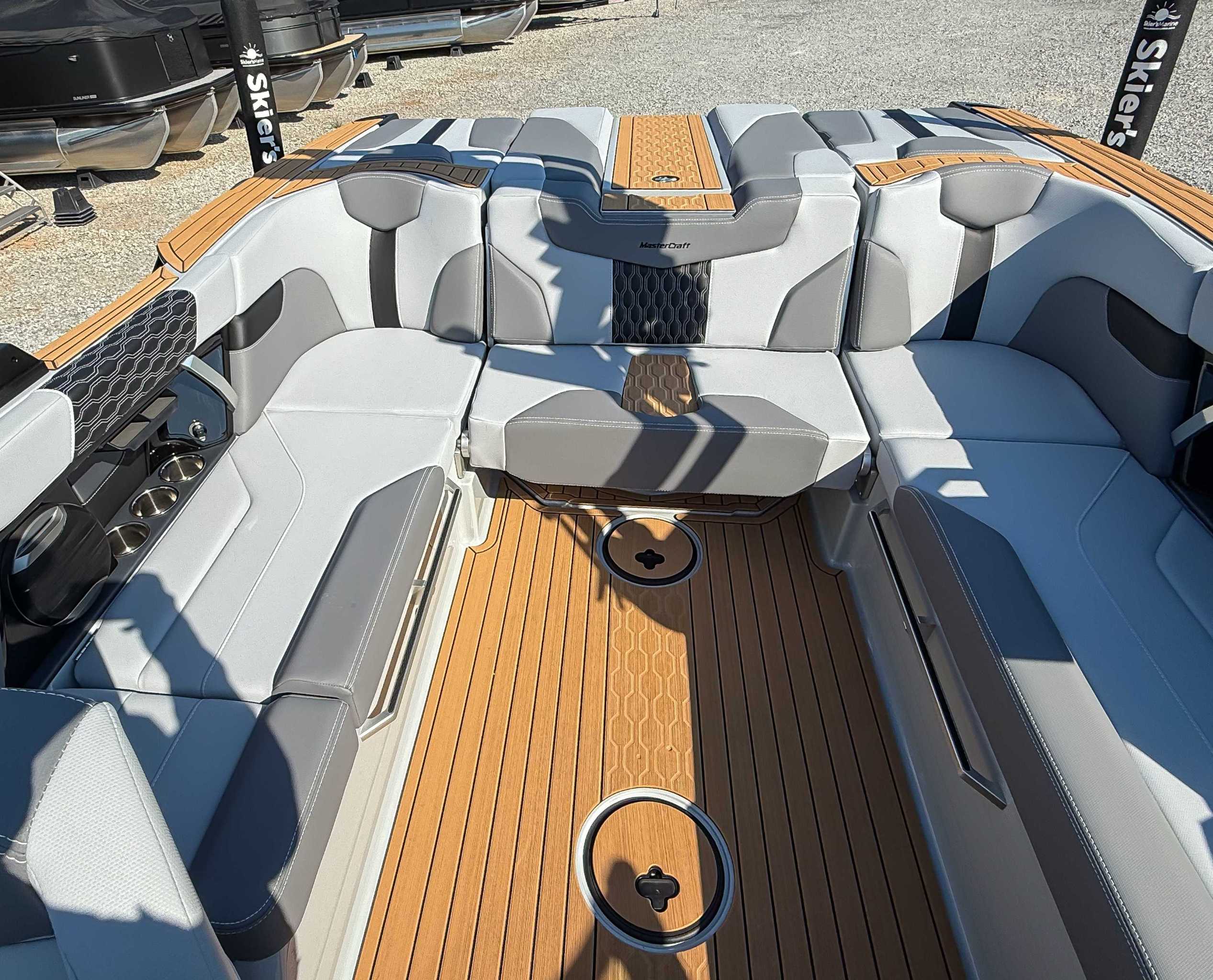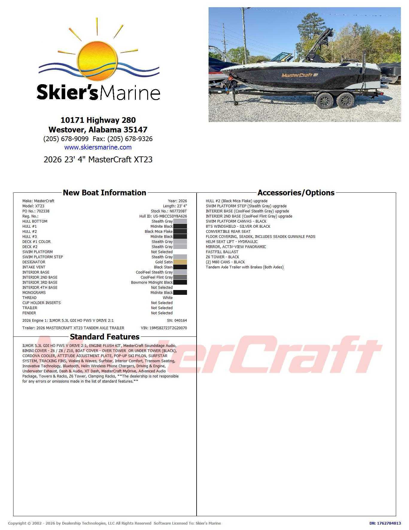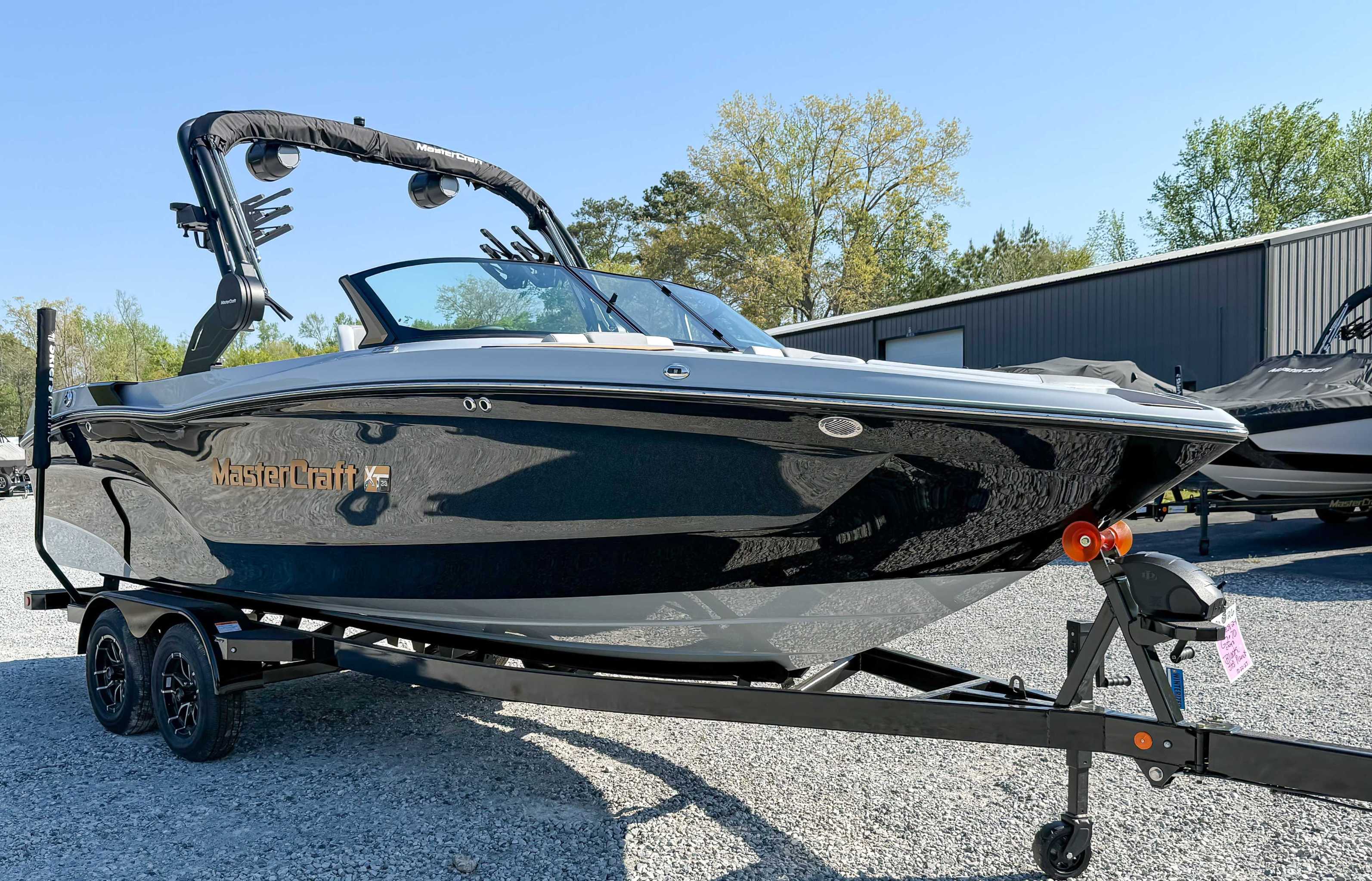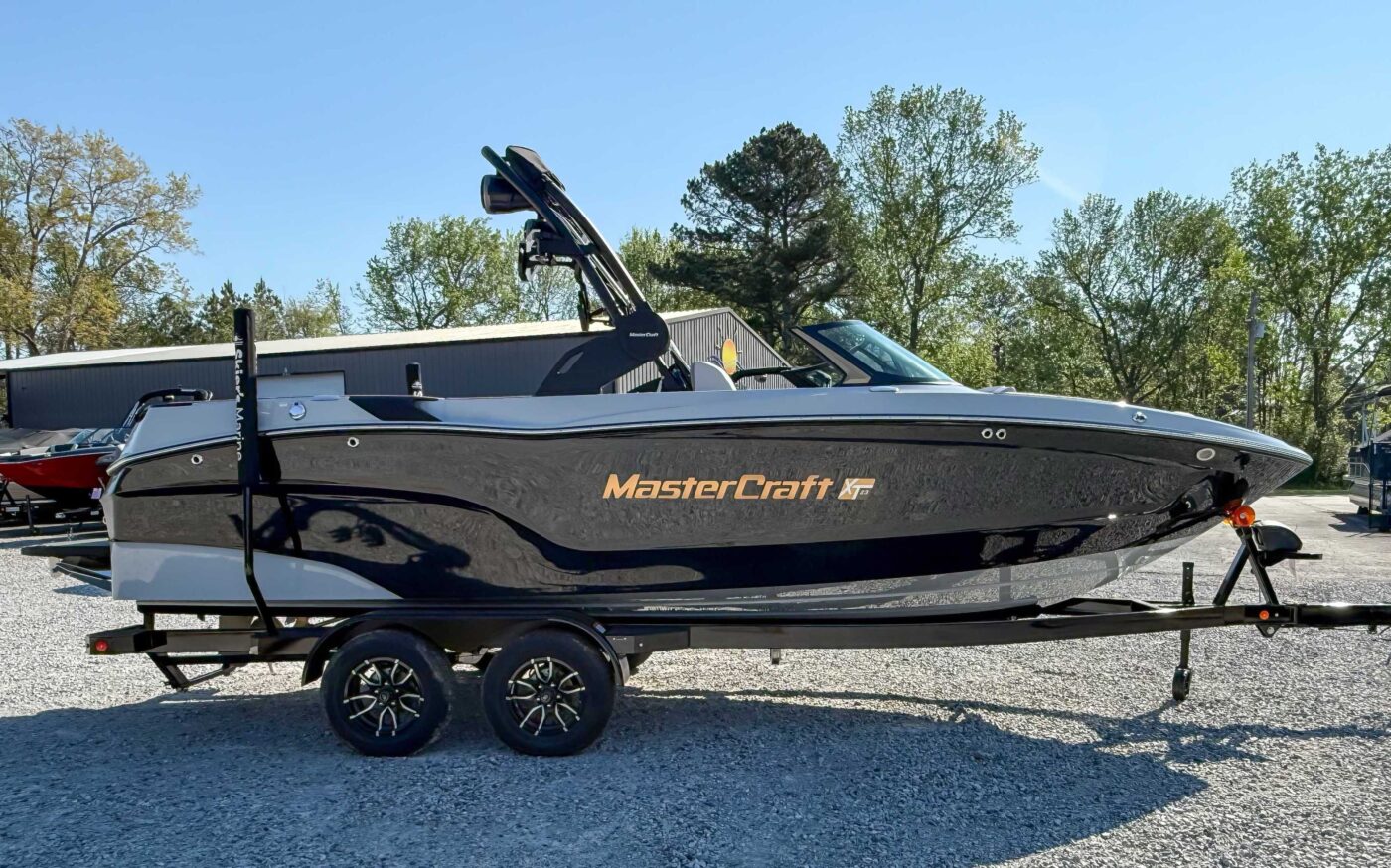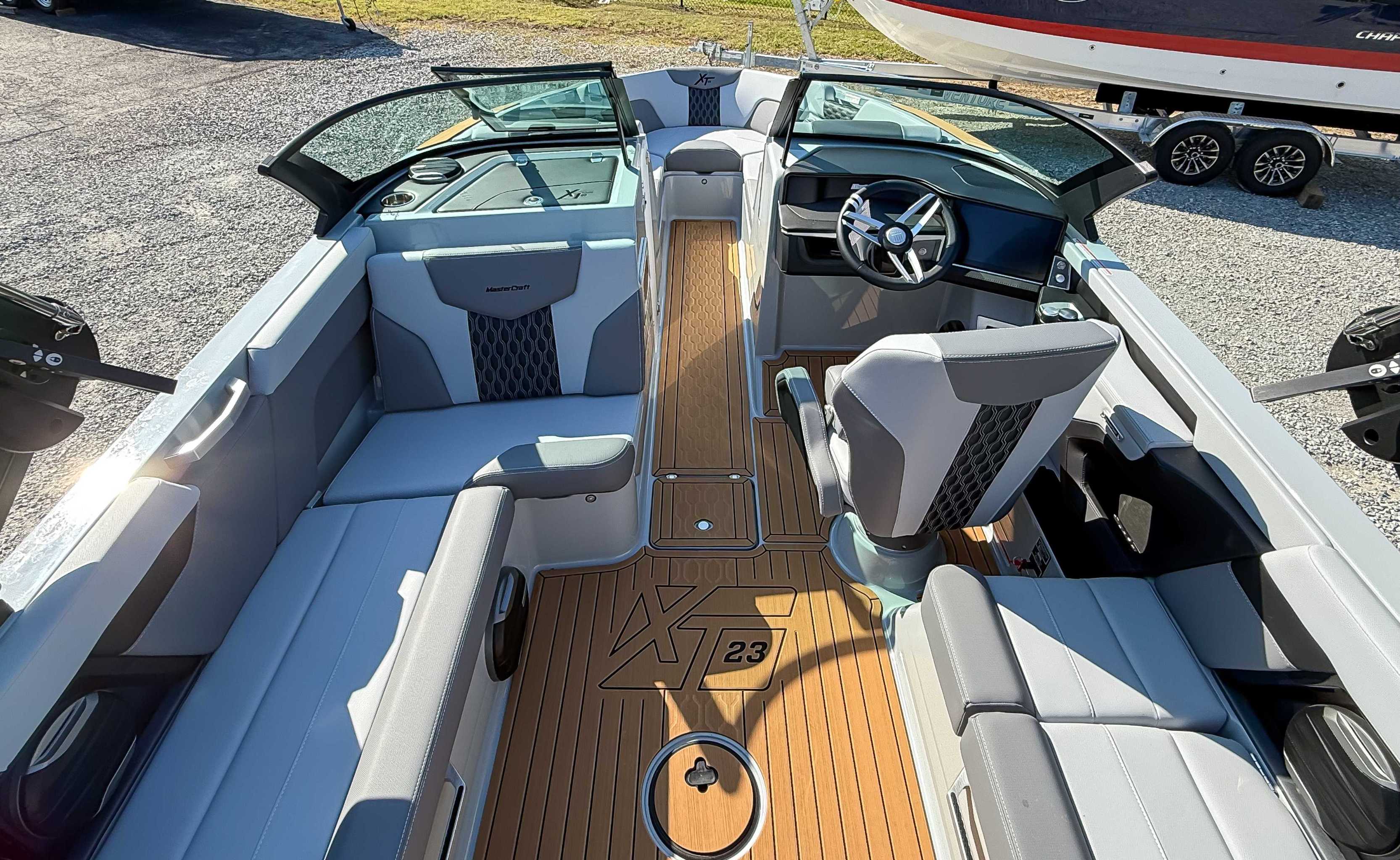 The 2026 MasterCraft XT23 is a 23-foot towboat that blends performance, luxury, and advanced technology to create world-class wakes and waves for all skill levels. It features the SurfStar system with available FastFill ballast for customizable waves and is powered by an Ilmor 5.3L GDI HO engine. The redesigned helm includes an intuitive 12" touchscreen and MyDrive control, complemented by the immersive MasterCraft SoundStage audio system. The interior comfortably seats 16 with deep storage and premium mat