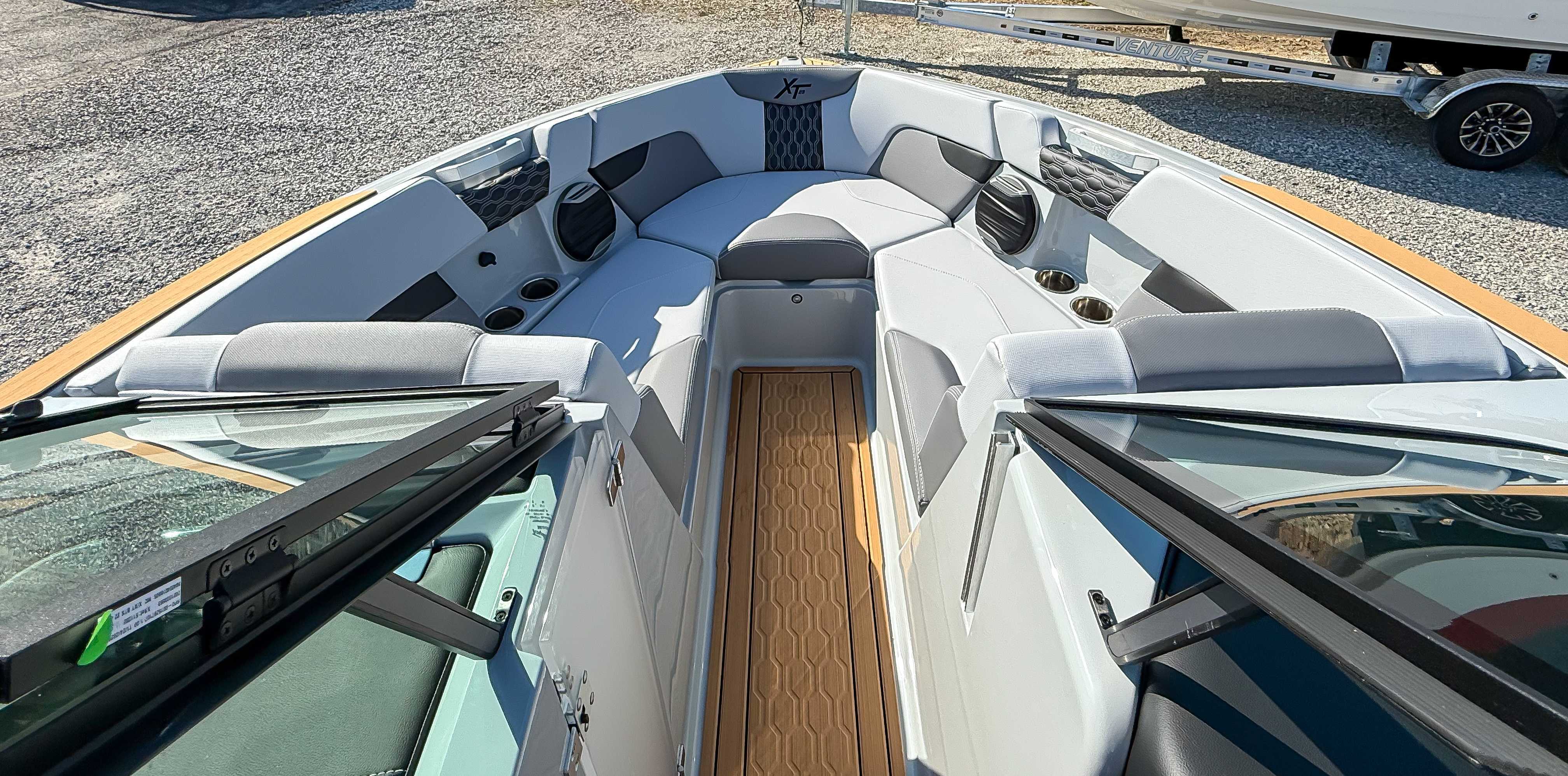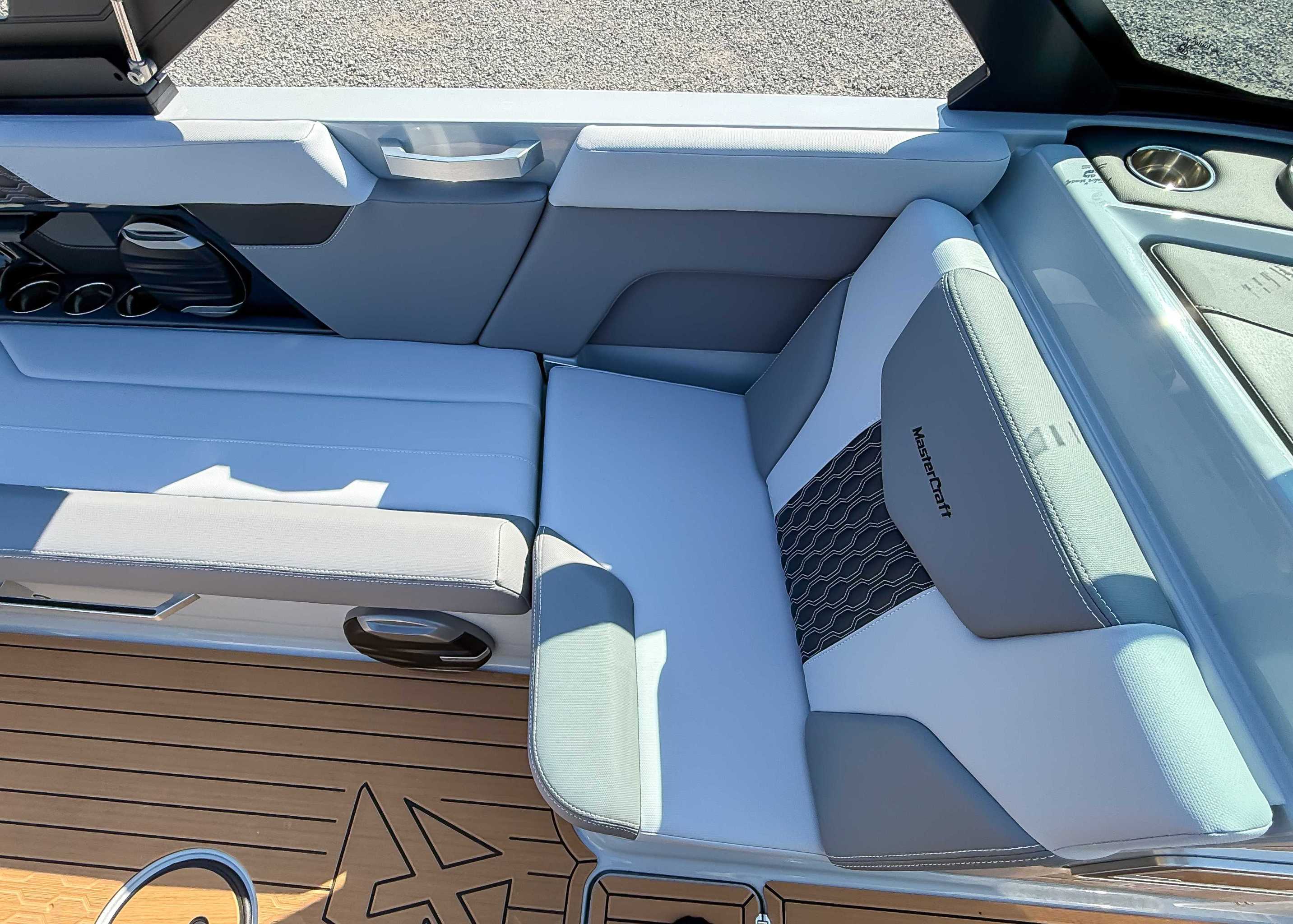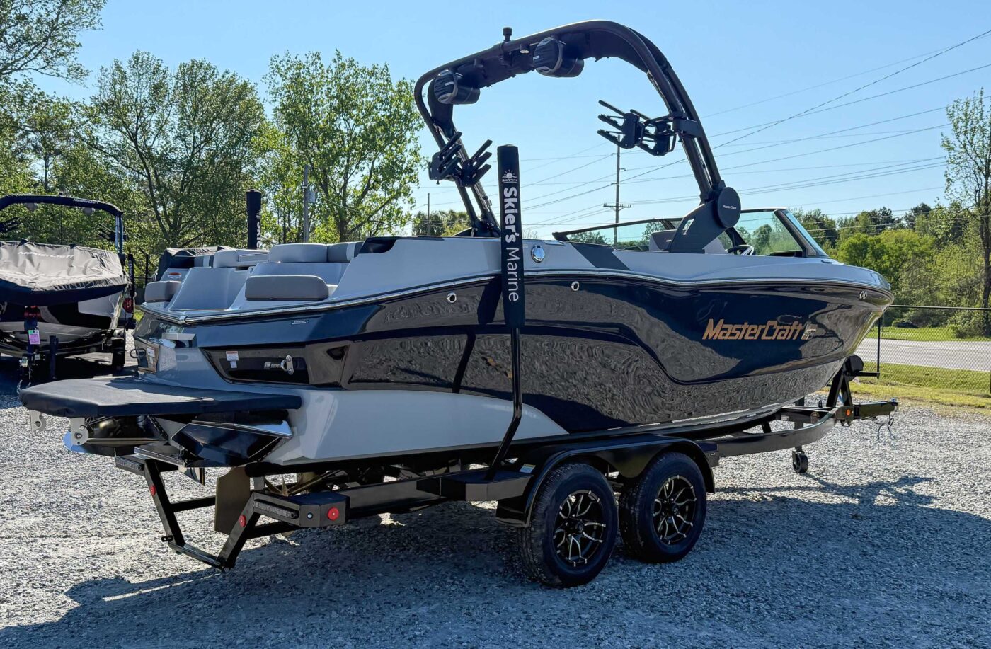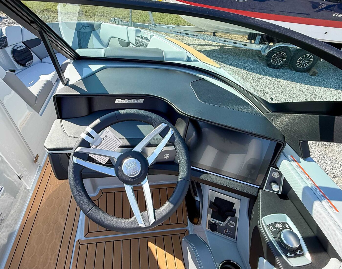 The 2026 MasterCraft XT23 is a 23-foot towboat that blends performance, luxury, and advanced technology to create world-class wakes and waves for all skill levels. It features the SurfStar system with available FastFill ballast for customizable waves and is powered by an Ilmor 5.3L GDI HO engine. The redesigned helm includes an intuitive 12" touchscreen and MyDrive control, complemented by the immersive MasterCraft SoundStage audio system. The interior comfortably seats 16 with deep storage and premium mat