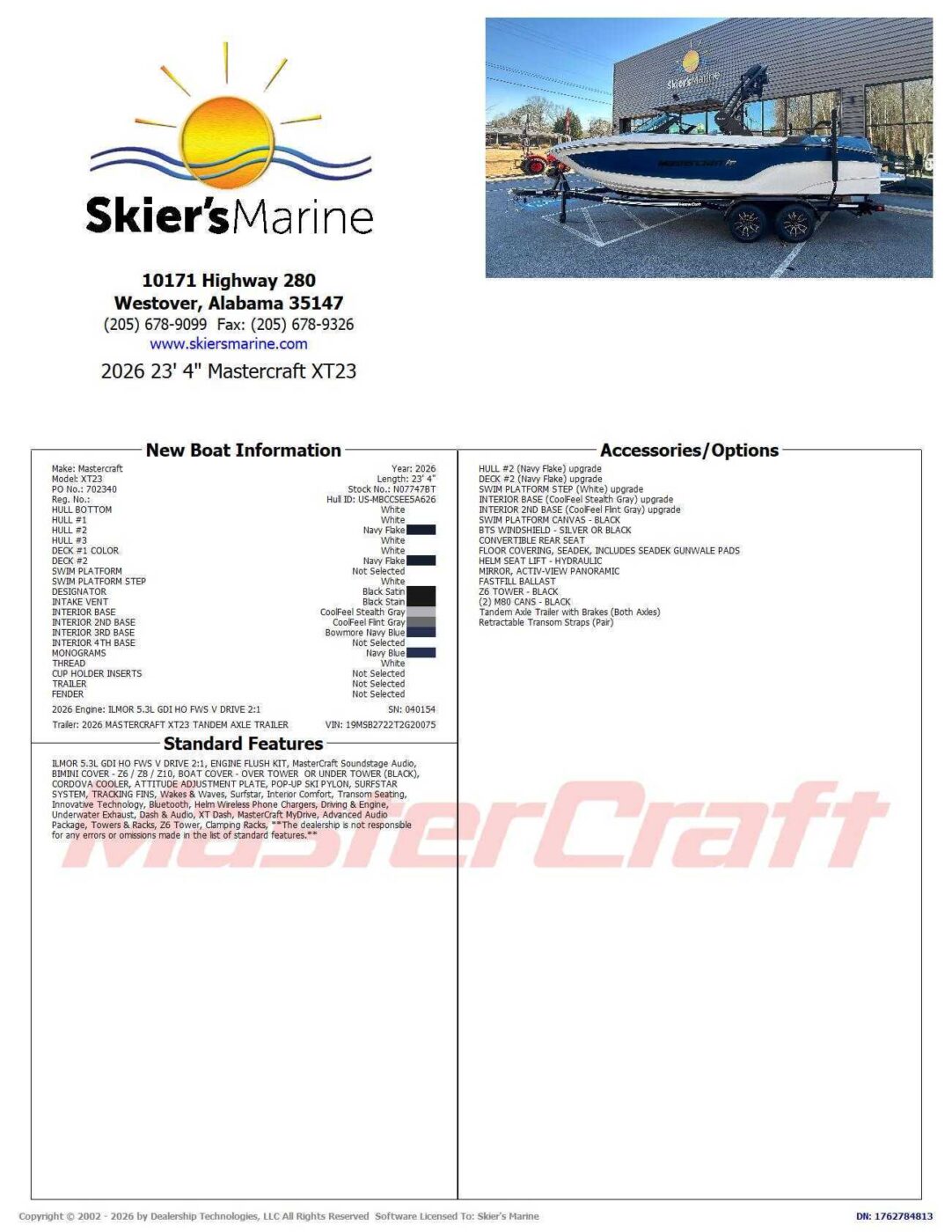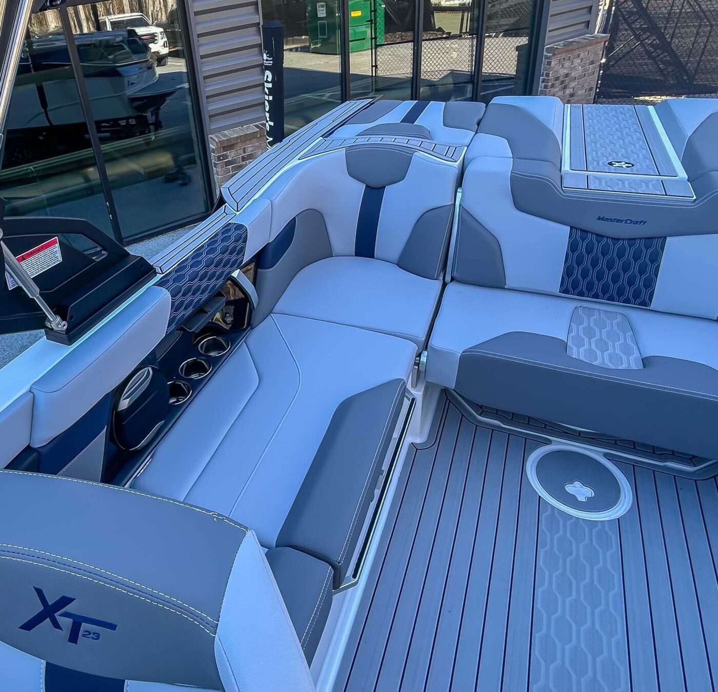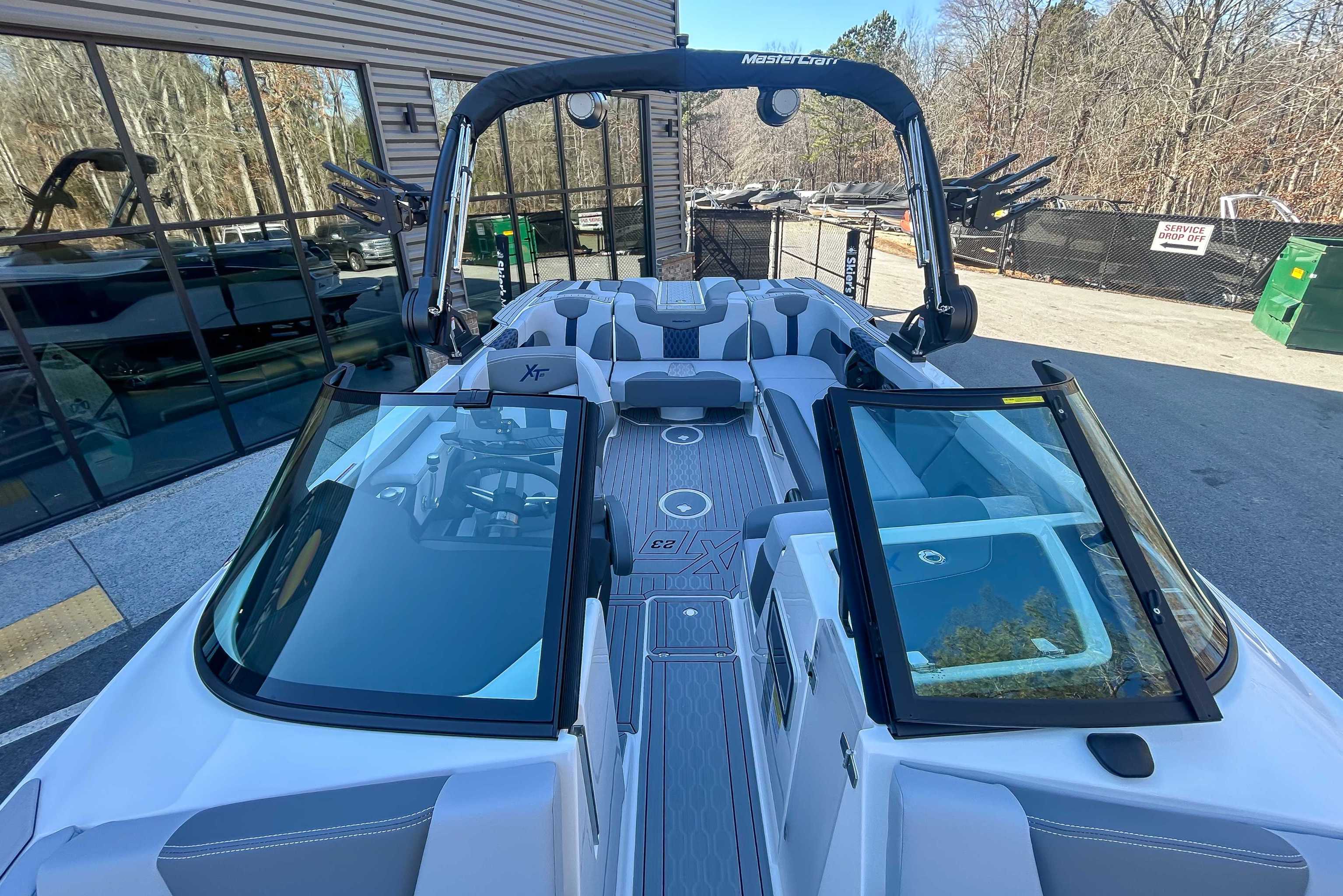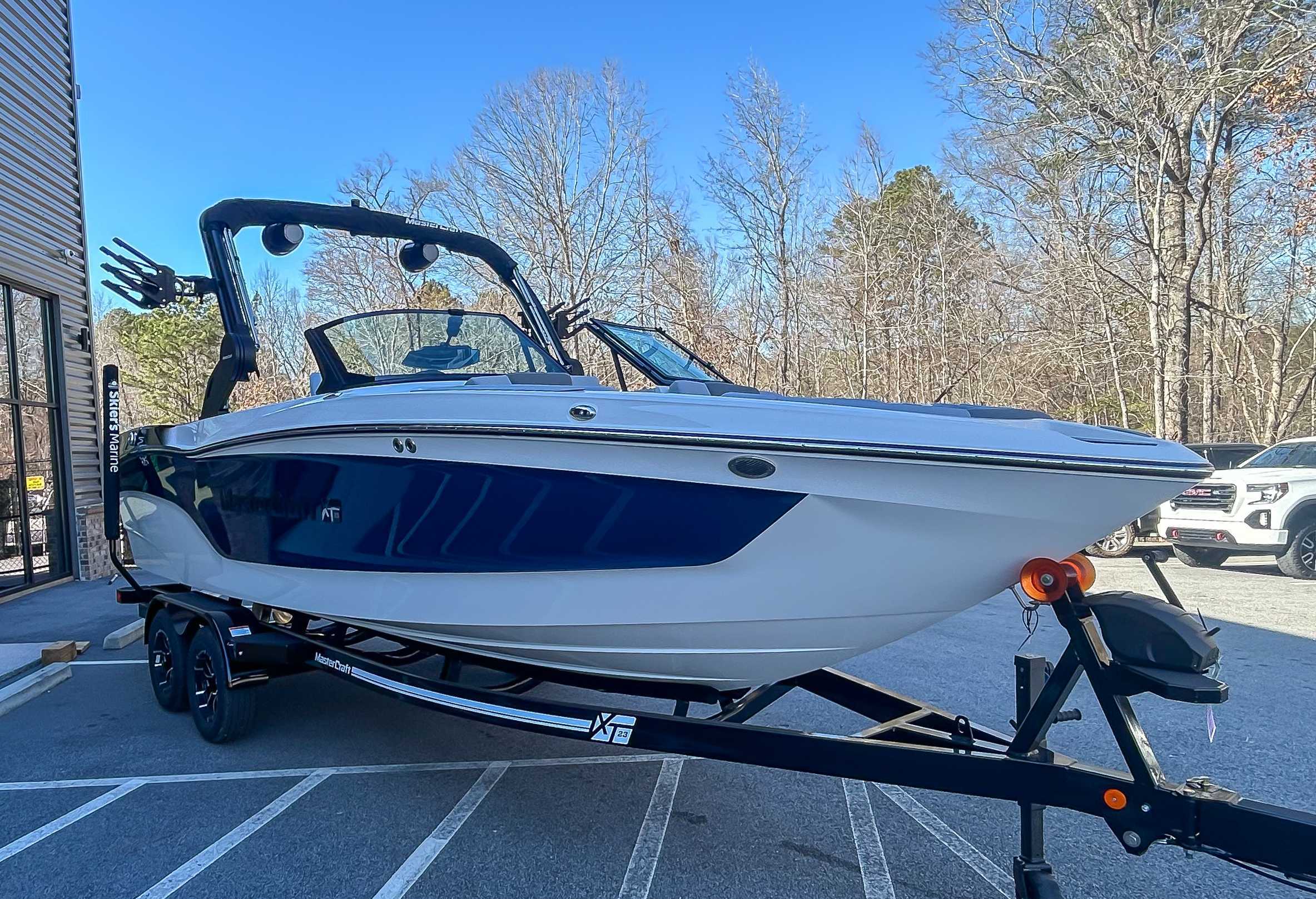 The 2026 MasterCraft XT23 is a 23-foot towboat that blends performance, luxury, and advanced technology to create world-class wakes and waves for all skill levels. It features the SurfStar system with available FastFill ballast for customizable waves and is powered by an Ilmor 5.3L GDI HO engine. The redesigned helm includes an intuitive 12" touchscreen and MyDrive control, complemented by the immersive MasterCraft SoundStage audio system. The interior comfortably seats 16 with deep storage and premium mat