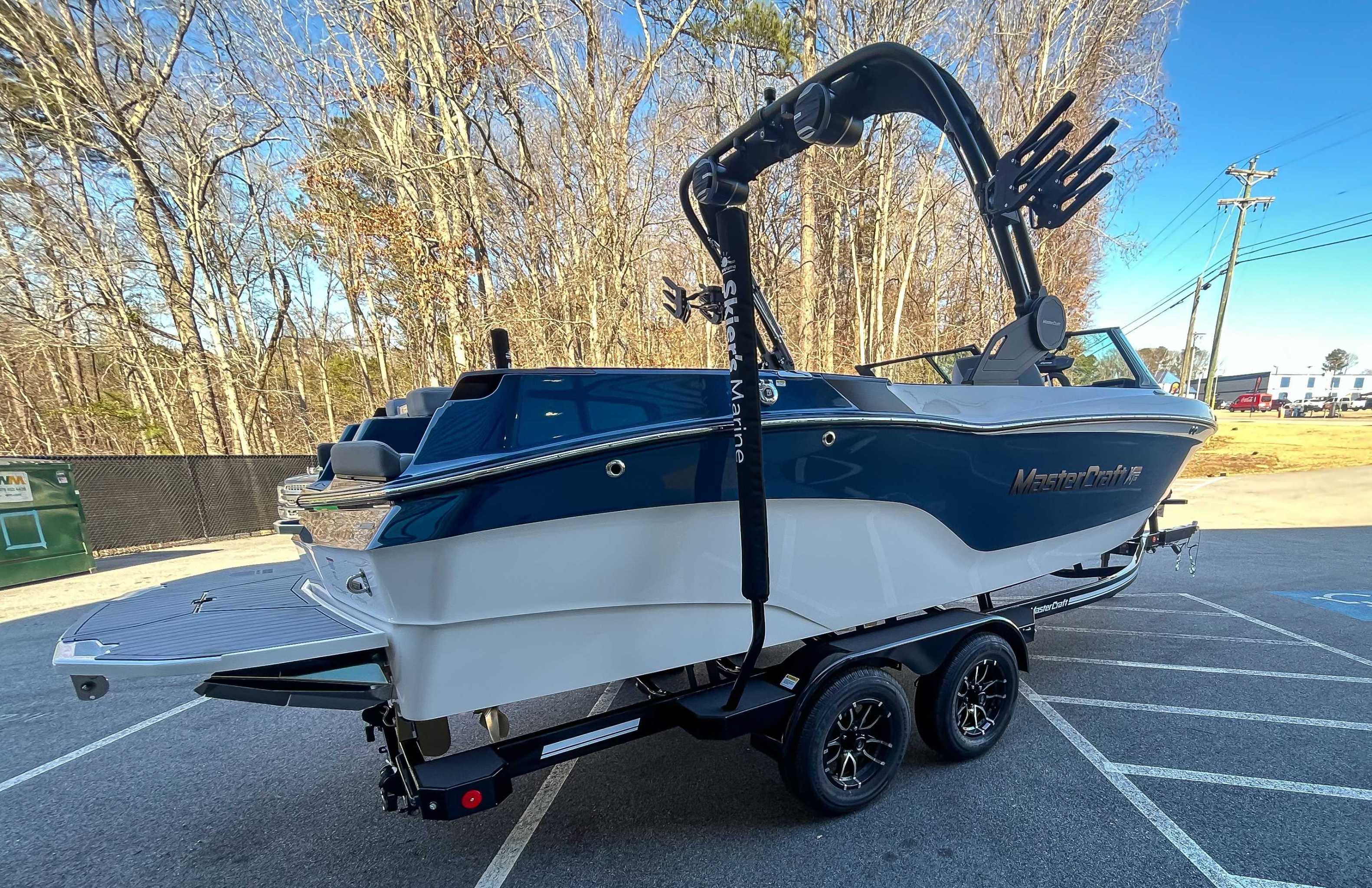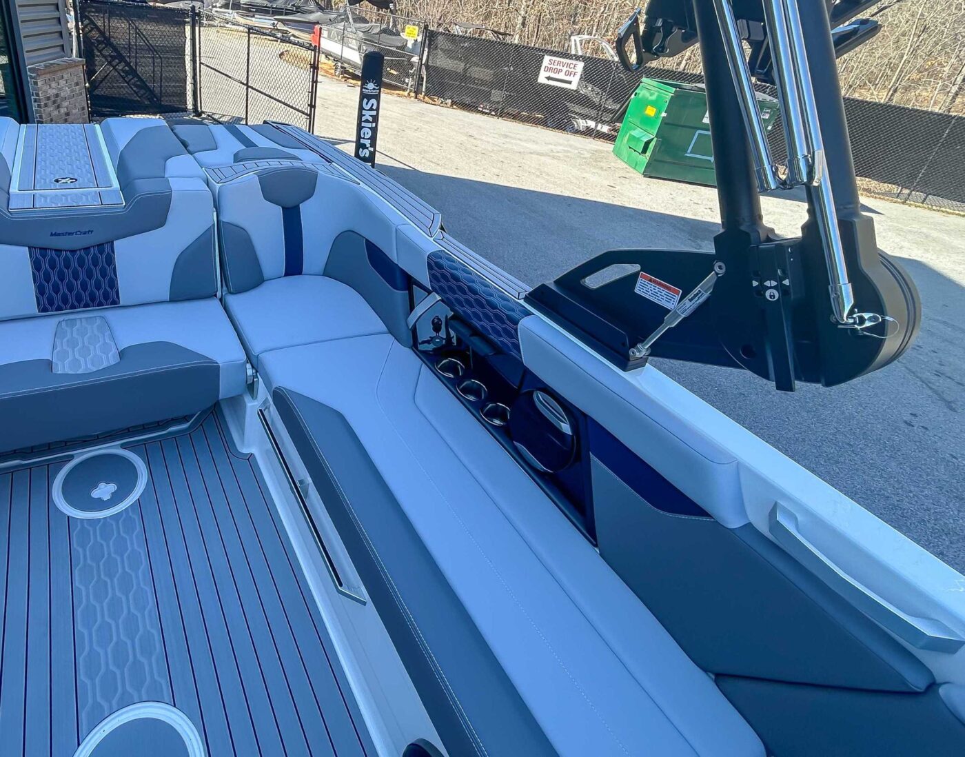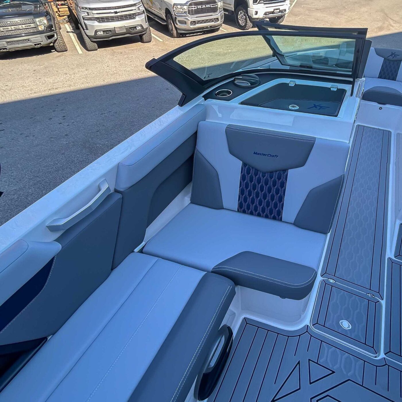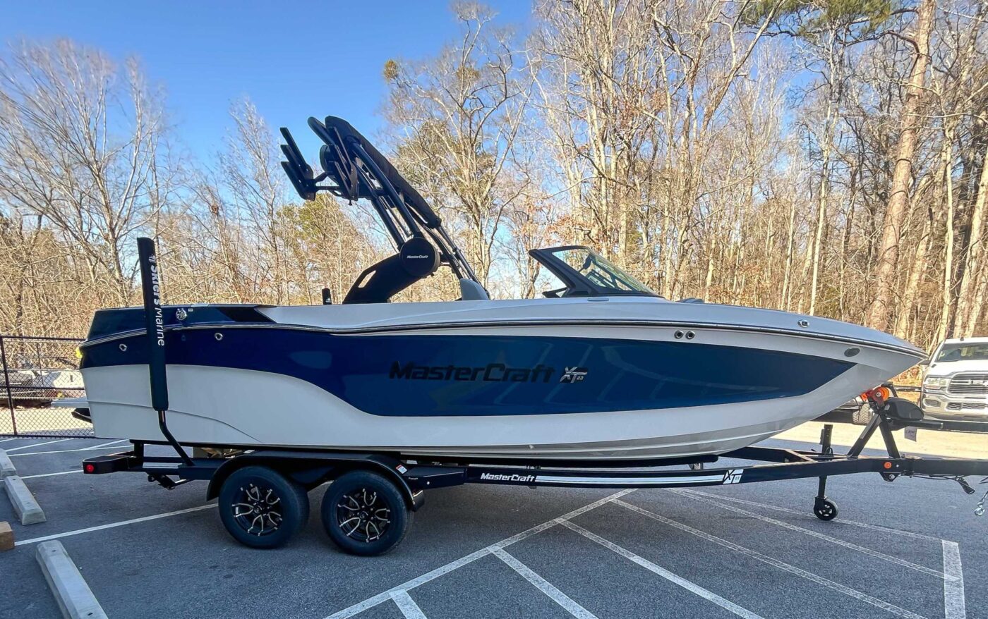 The 2026 MasterCraft XT23 is a 23-foot towboat that blends performance, luxury, and advanced technology to create world-class wakes and waves for all skill levels. It features the SurfStar system with available FastFill ballast for customizable waves and is powered by an Ilmor 5.3L GDI HO engine. The redesigned helm includes an intuitive 12" touchscreen and MyDrive control, complemented by the immersive MasterCraft SoundStage audio system. The interior comfortably seats 16 with deep storage and premium mat