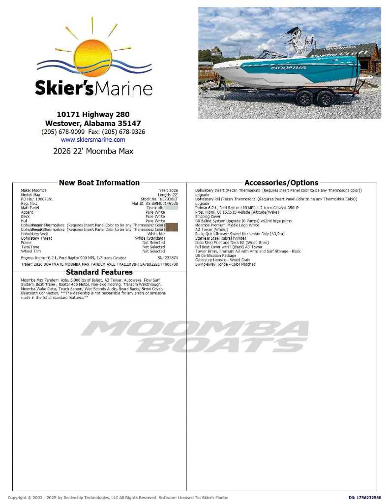 Skier's Marine is an award-winning ski boat, pontoon boat, and runabout sport boat dealer for brands like MasterCraft, Supra, Moomba, Chaparral, Harris, Premier, and Boston Whaler. We are not responsible for any pricing, options, specifications, or other listing errors on our site. Please contact us to confirm all details.