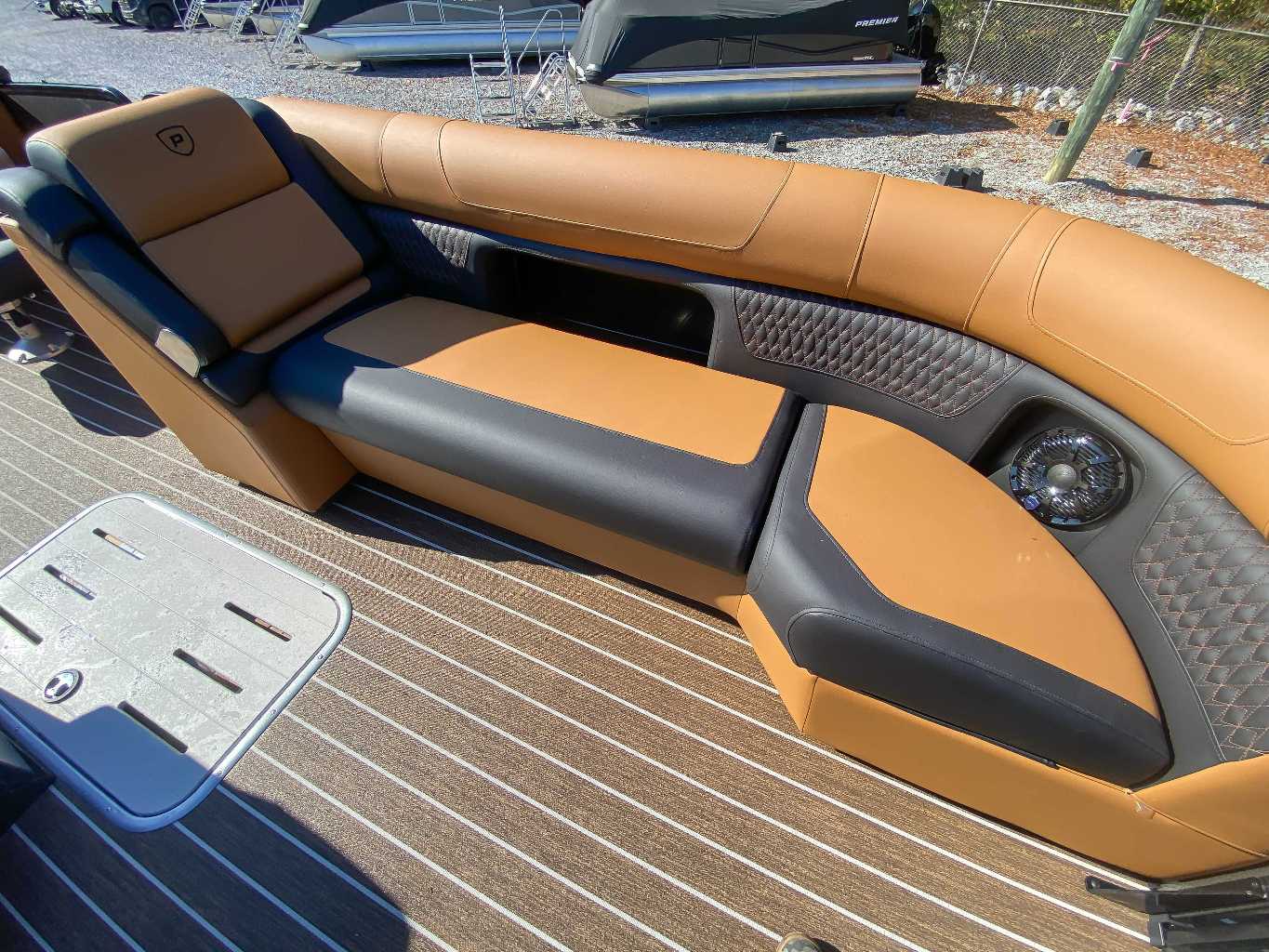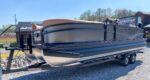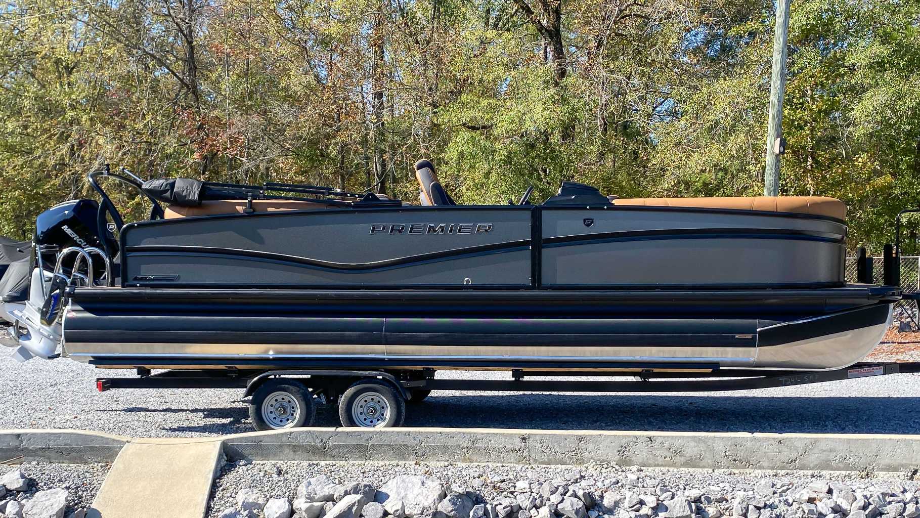 The 2026 Premier Solaris 250 pontoon boat is a luxury vessel blending modern design with high performance, engineered for discerning boaters. Key features include the innovative Premier Cool-Touch fabric to beat the heat, the supercharged PTX tritoon chassis for superior ride and handling, and a Captain-First helm with dual Simrad displays. The spacious interior offers plush seating and optional entertainment features like a retractable 43" outdoor TV. The PTX hull also provides excellent fuel economy and