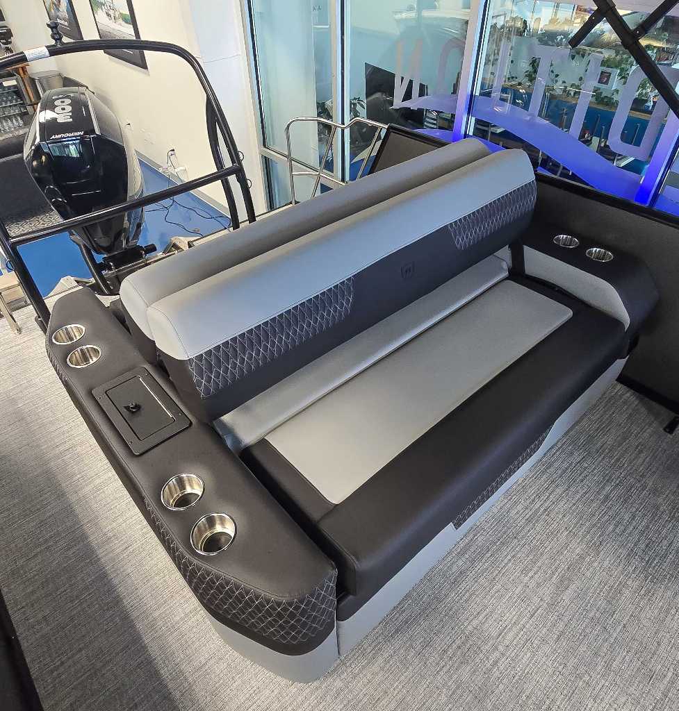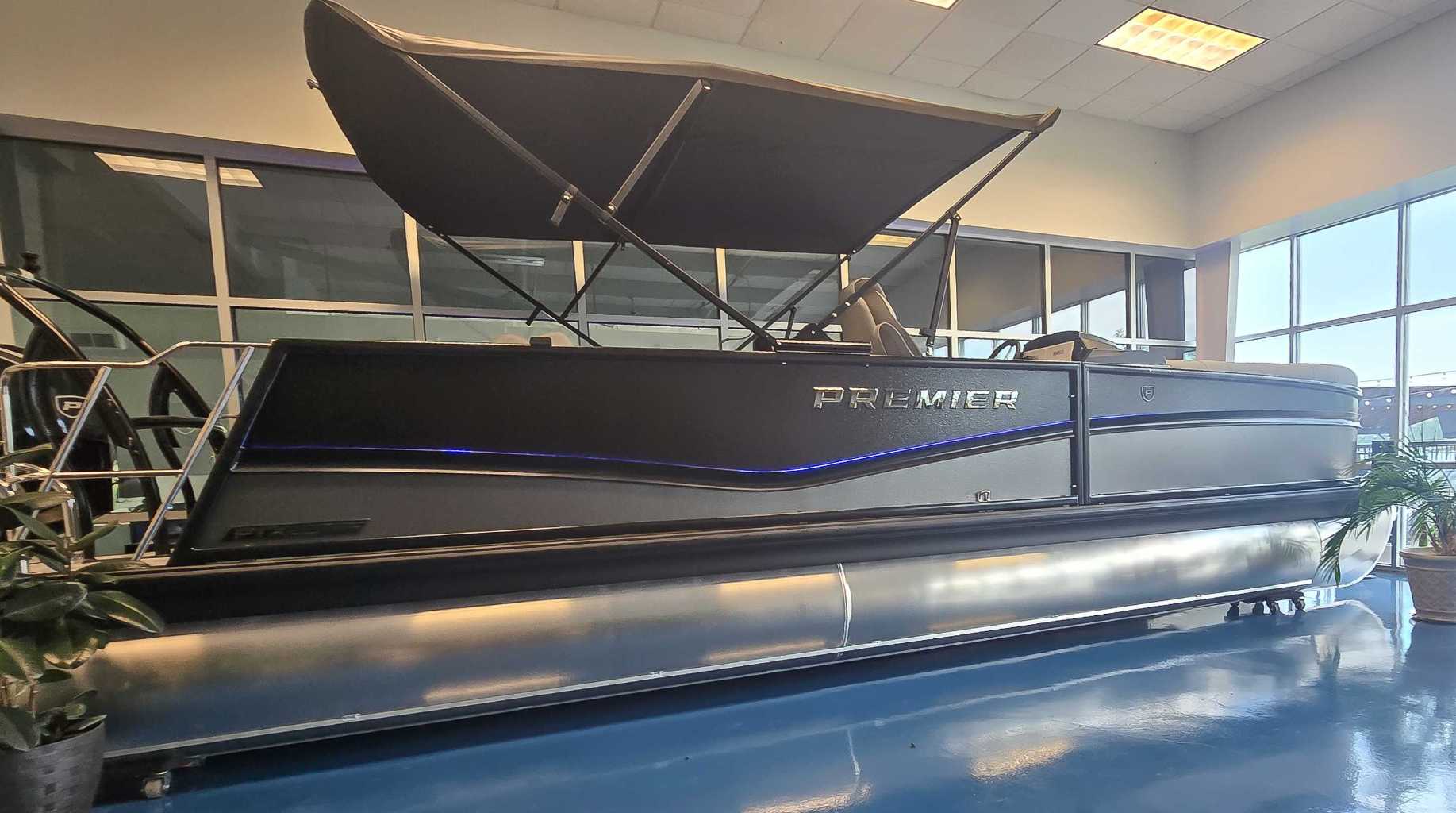 The 2026 Premier Solaris 250 pontoon boat is a luxury vessel blending modern design with high performance, engineered for discerning boaters. Key features include the innovative Premier Cool-Touch fabric to beat the heat, the supercharged PTX tritoon chassis for superior ride and handling, and a Captain-First helm with dual Simrad displays. The spacious interior offers plush seating and optional entertainment features like a retractable 43" outdoor TV. The PTX hull also provides excellent fuel economy and